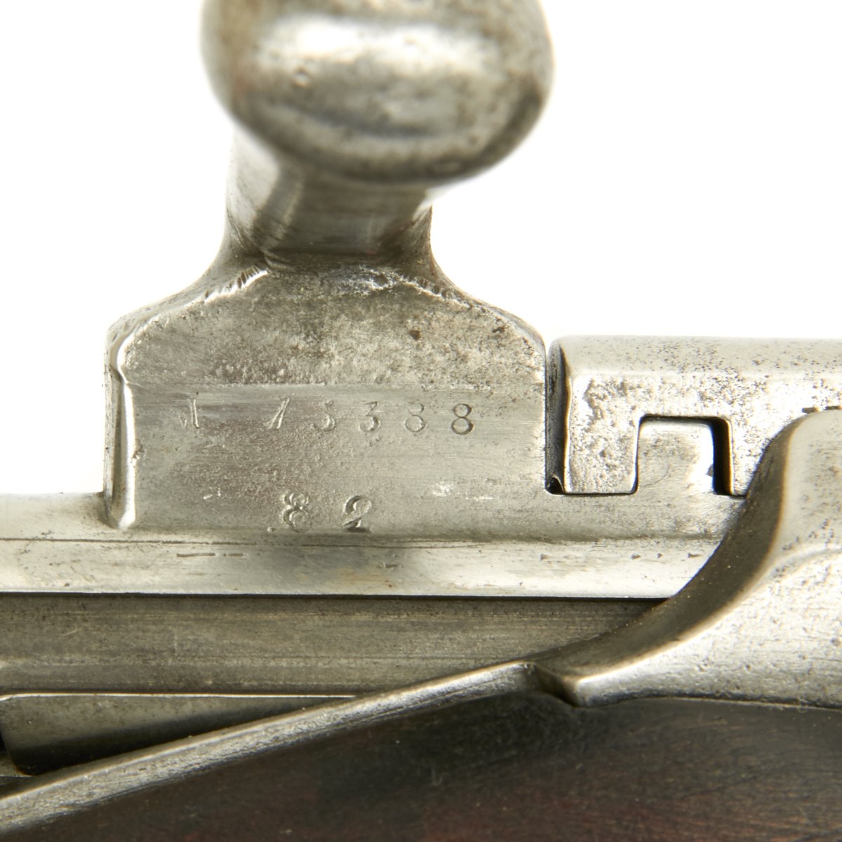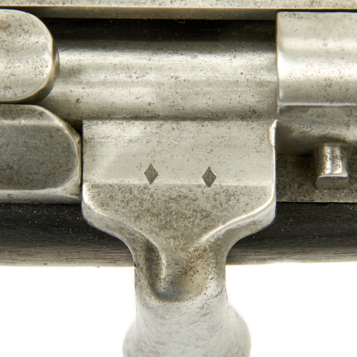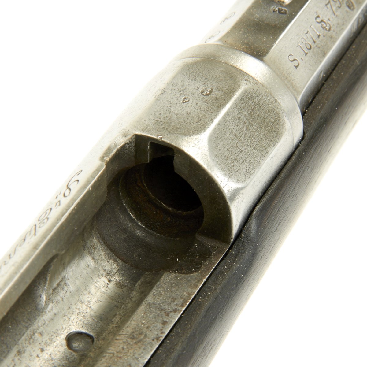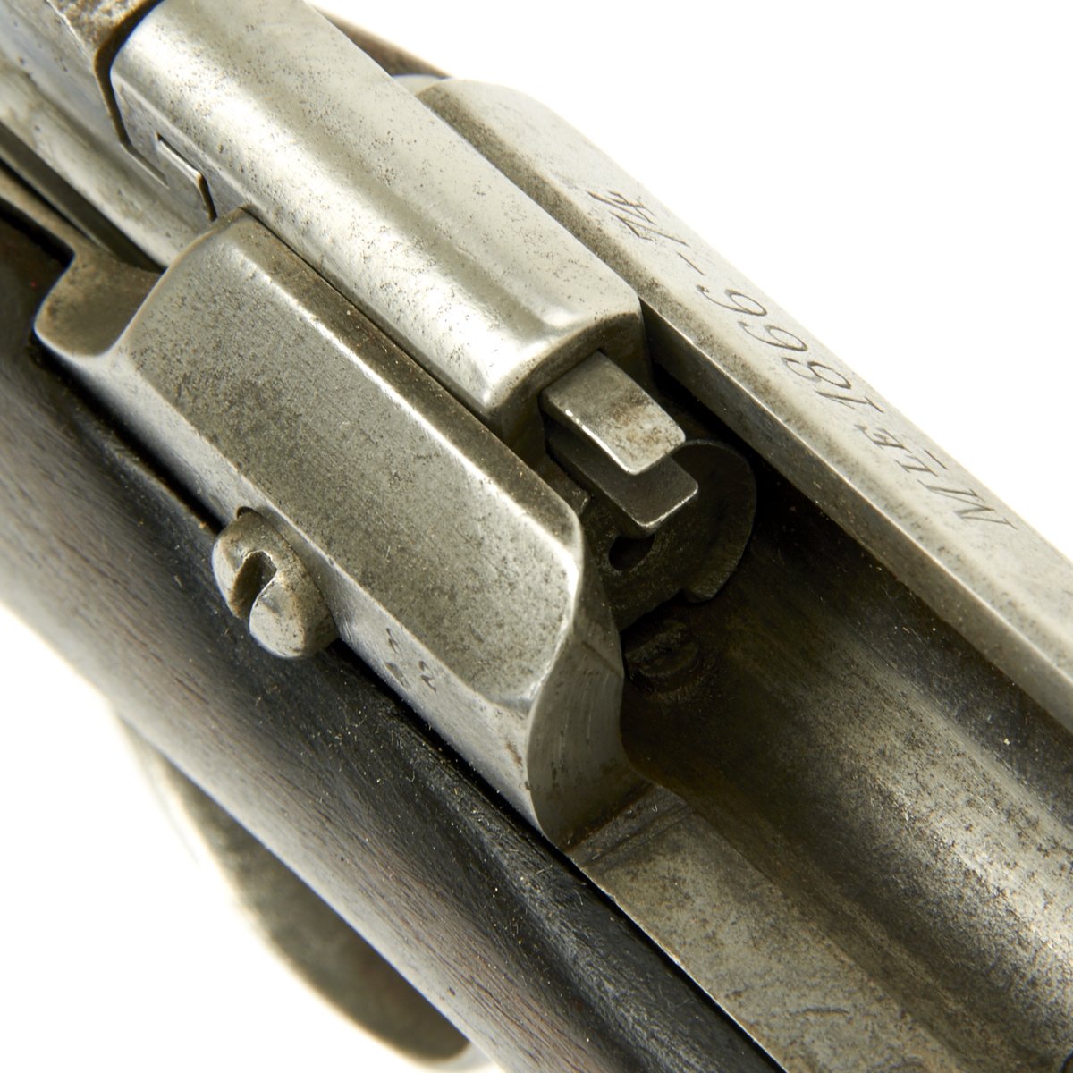 Very unusually, the bolt on this full length Rifle is fitted with a down-turned Bolt handle. Traditionally all Chassepot and Gras Rifles have "straight" Bolt handles with the exception of Short Rifles and Carbines, which usually with Brass mounts indicating Colonial issue. The stated reason for this was that it was easier to carry a Down Turned bolt weapon in a saddle scabbard while in use on a Horse or Camel. A full-length rifle however is impractical for mounted use, so a down-turned bolt would serve no purpose.