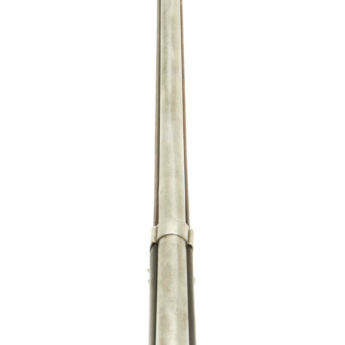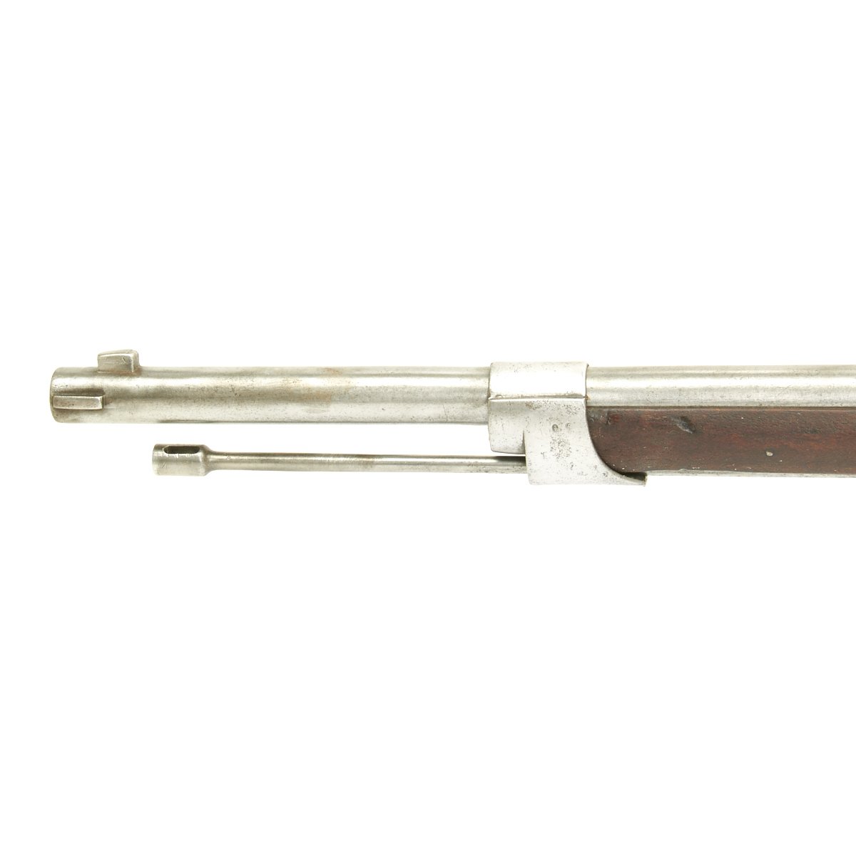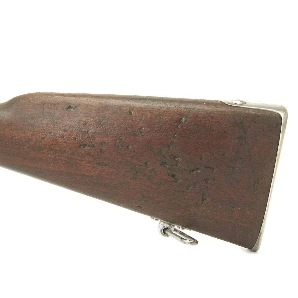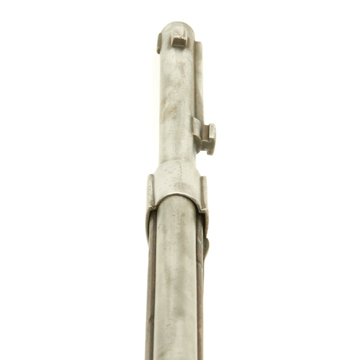 Very unusually, the bolt on this full length Rifle is fitted with a down-turned Bolt handle. Traditionally all Chassepot and Gras Rifles have "straight" Bolt handles with the exception of Short Rifles and Carbines, which usually with Brass mounts indicating Colonial issue. The stated reason for this was that it was easier to carry a Down Turned bolt weapon in a saddle scabbard while in use on a Horse or Camel. A full-length rifle however is impractical for mounted use, so a down-turned bolt would serve no purpose.