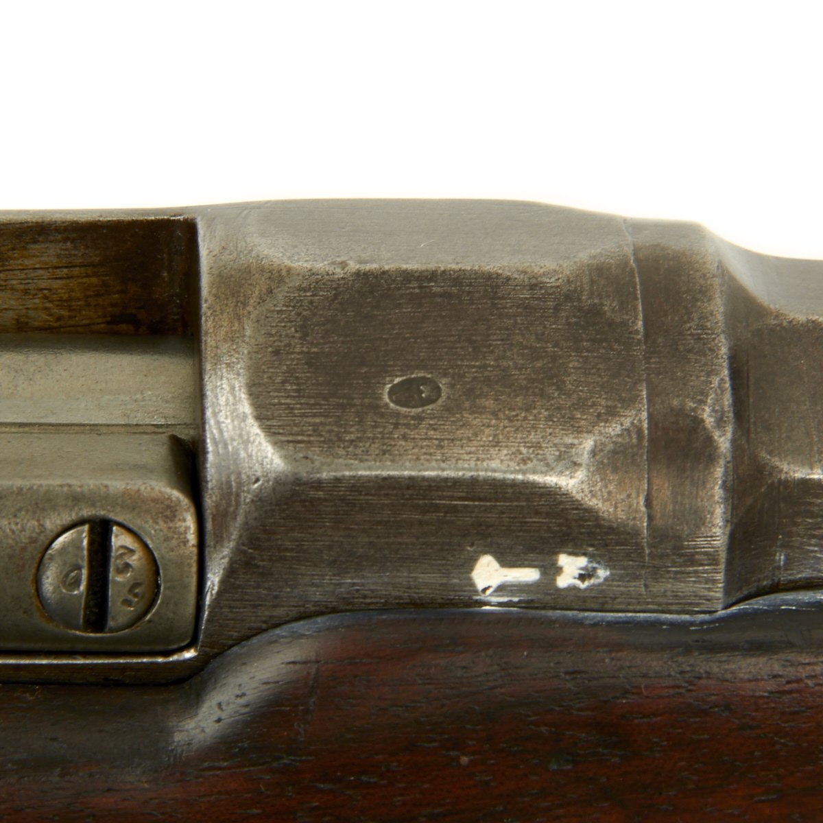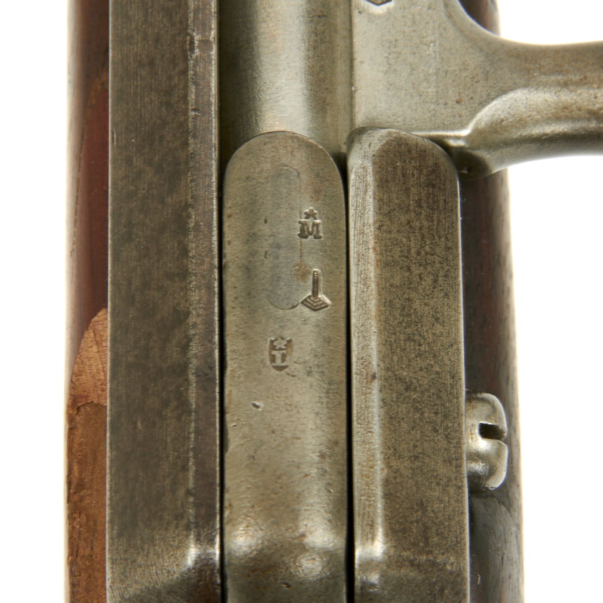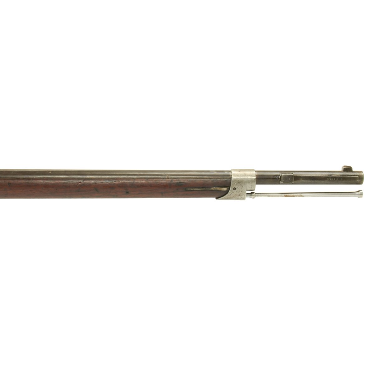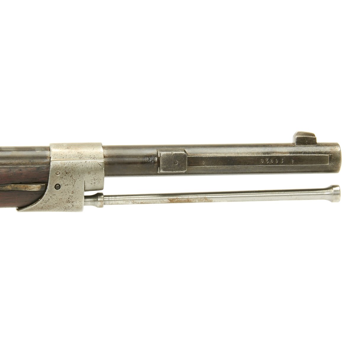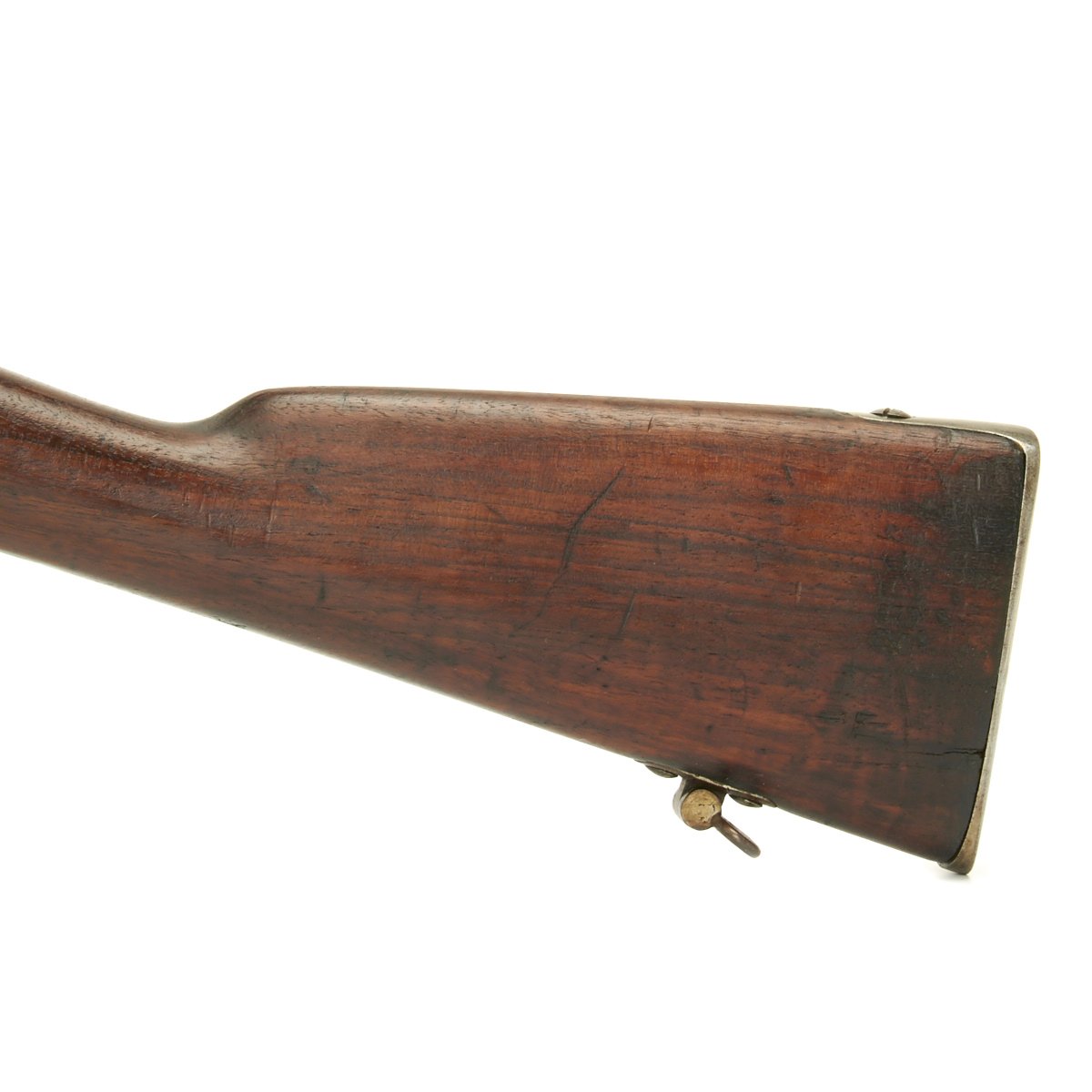 Thousands of French Rifles were captured during the Franco-Prussian war, and then sold off by the Prussians. This particular very early production example is dated 1867 and was sold to Belgium, where it was completely rehabbed and resupplied for Military use, very possibly back to the French. The Rifle has been scrubbed of French markings and now shows LIEGE Proofs from Belgium. The serial numbers are somewhat mixed, another