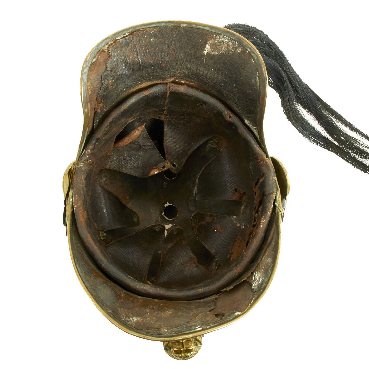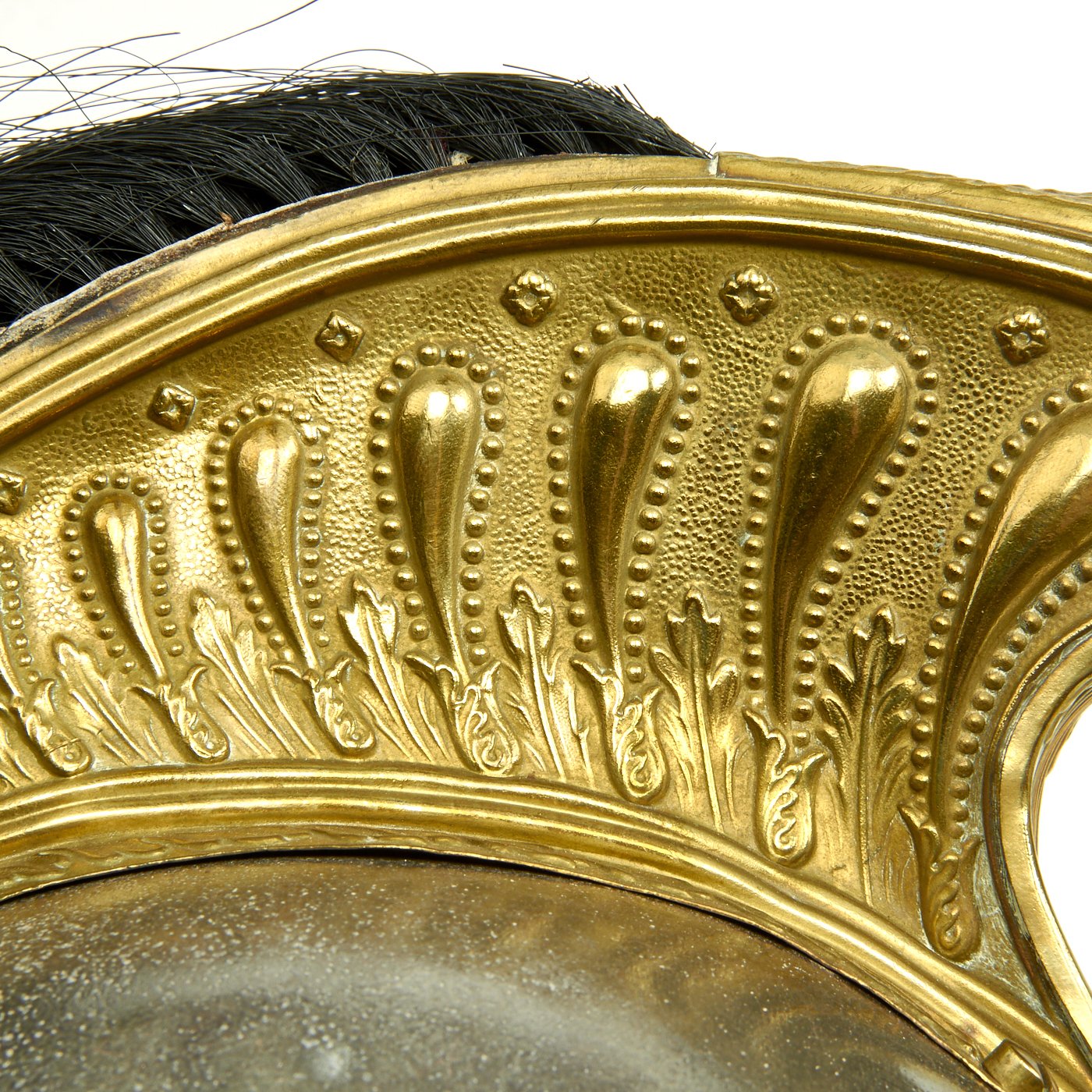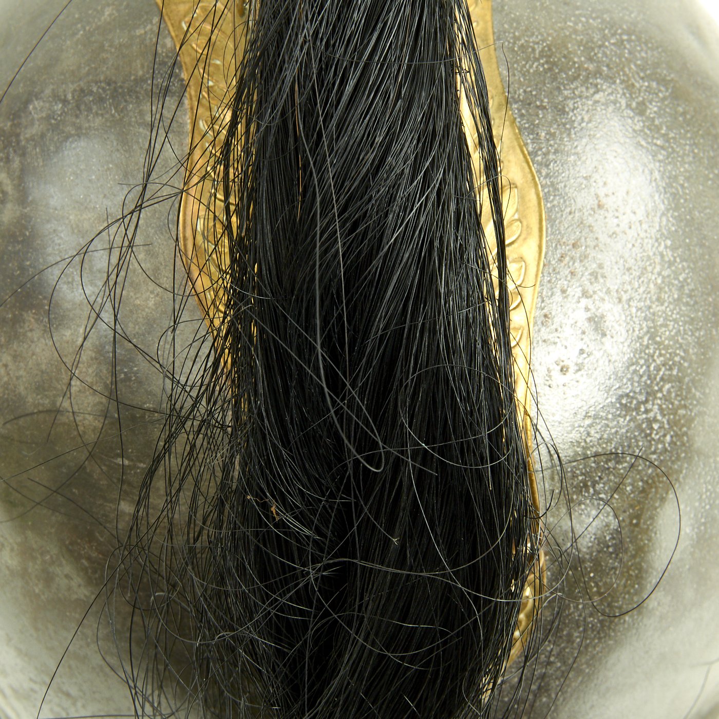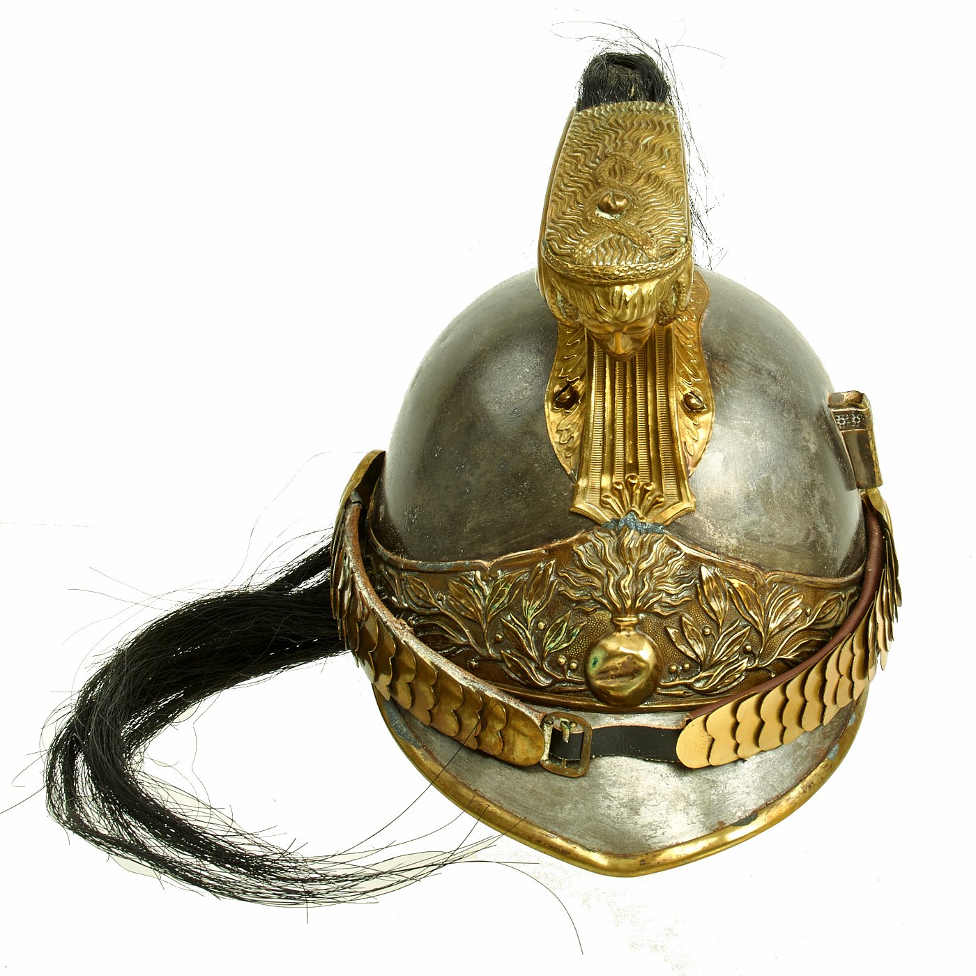 Original Item: Only One Available. This is a wonderful French Model 1874 Cuirassier Helmet, with steel skull, brass comb embossed with beaded fluting and terminating with the head of Medusa, and black horsehair mane. The brass helmet plate is embossed with a flaming grenade flanked by laurel leaves, with brass bound front and back peaks. It still retains the leather backed brass overlapping acanthus leaf chin-scales, though the left side is an expertly crafted custom replacement. The left side of the skull would normally bear a red feather plume with black base knot, alas the plume for this helmet is missing.