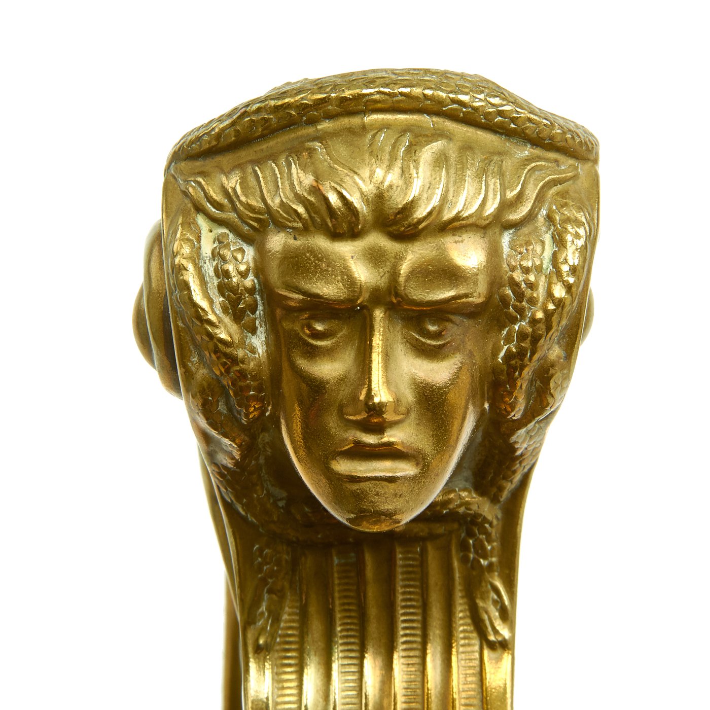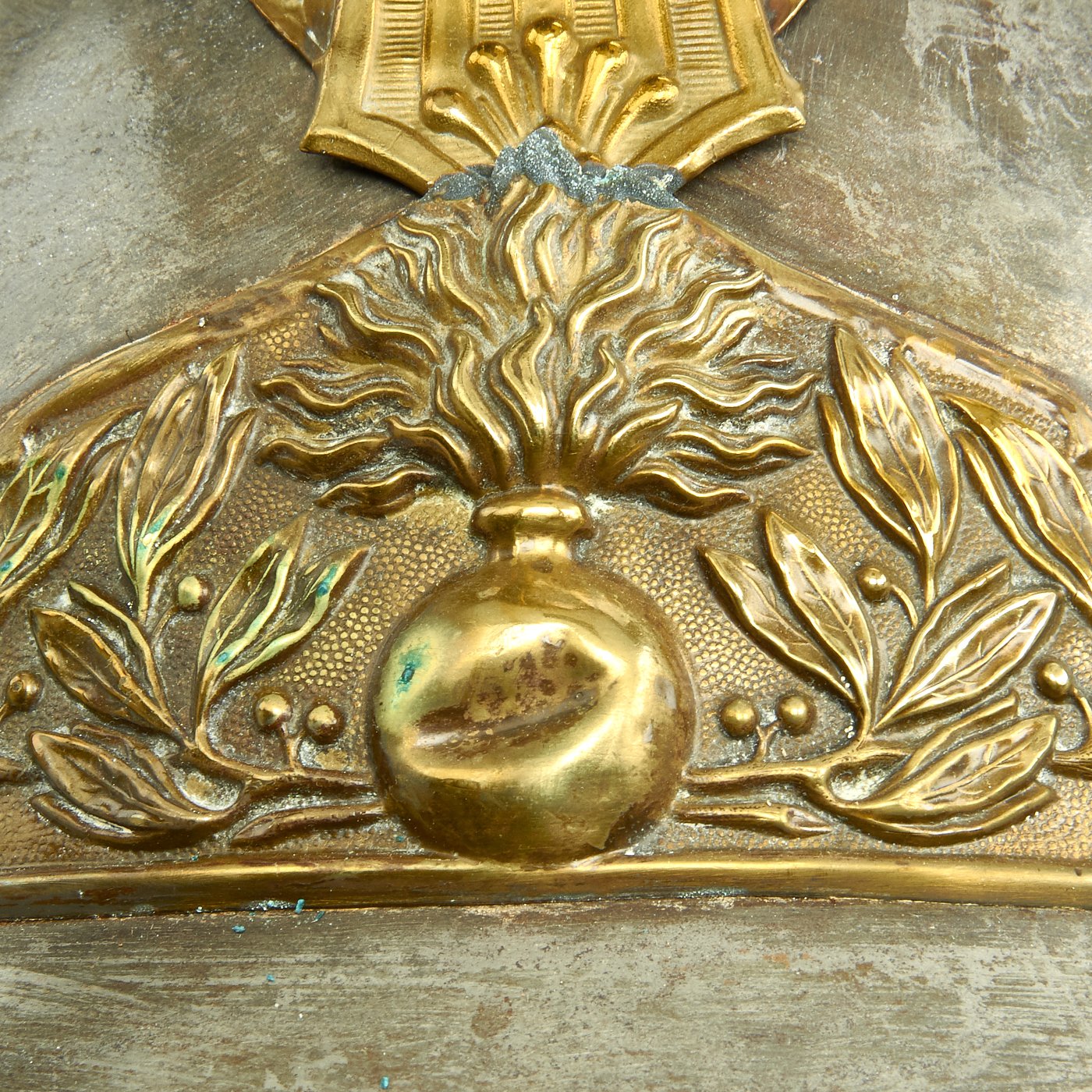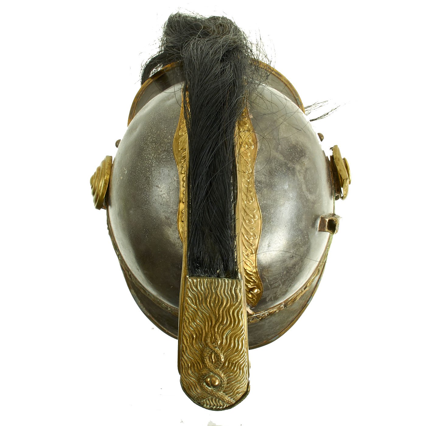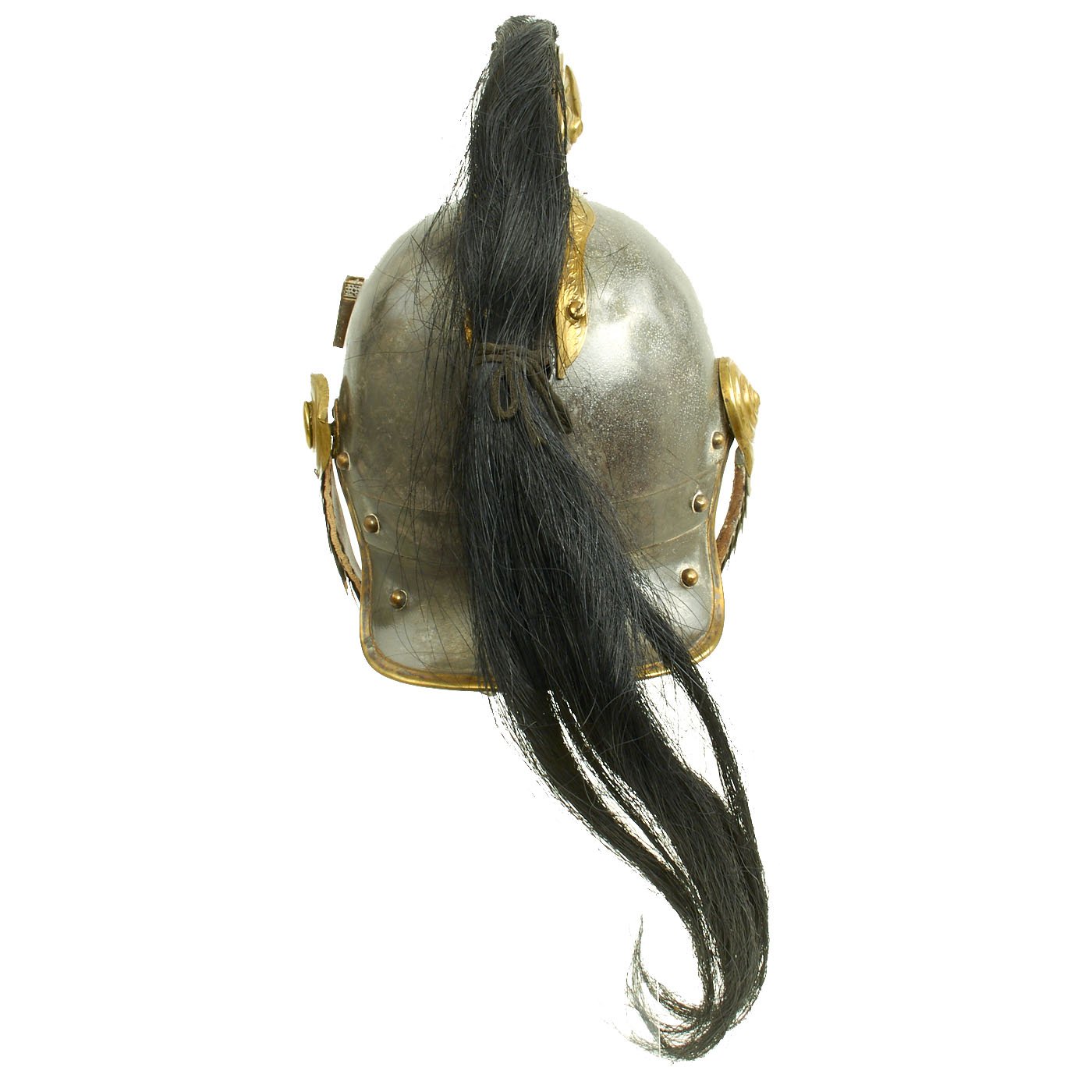 Original Item: Only One Available. This is a wonderful French Model 1874 Cuirassier Helmet, with steel skull, brass comb embossed with beaded fluting and terminating with the head of Medusa, and black horsehair mane. The brass helmet plate is embossed with a flaming grenade flanked by laurel leaves, with brass bound front and back peaks. It still retains the leather backed brass overlapping acanthus leaf chin-scales, though the left side is an expertly crafted custom replacement. The left side of the skull would normally bear a red feather plume with black base knot, alas the plume for this helmet is missing.