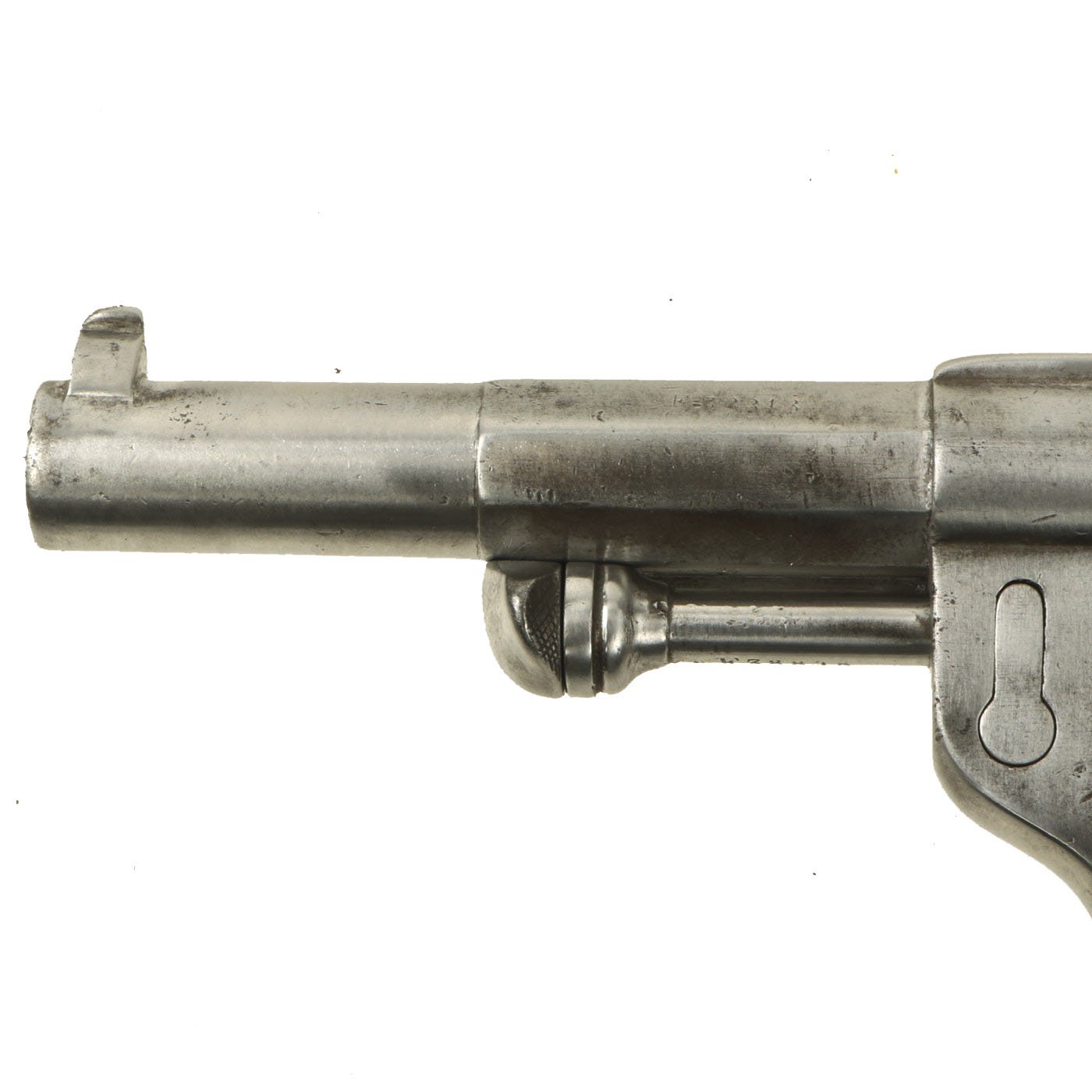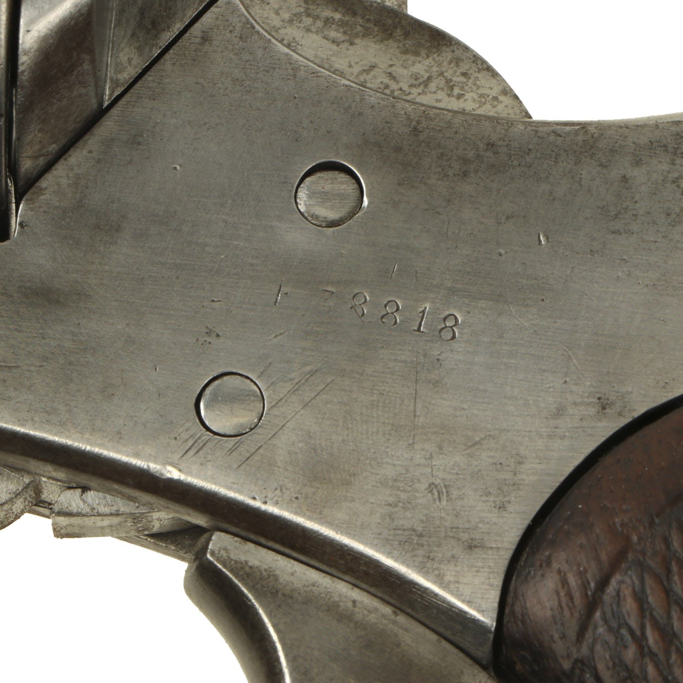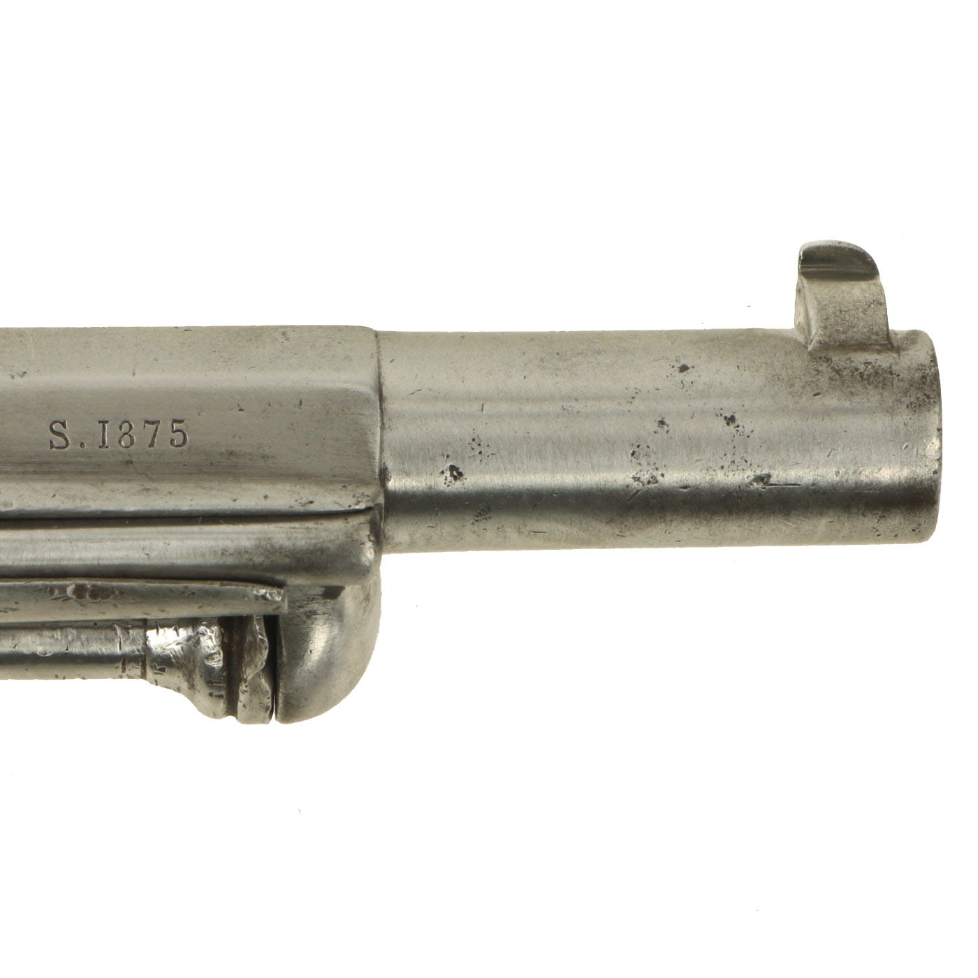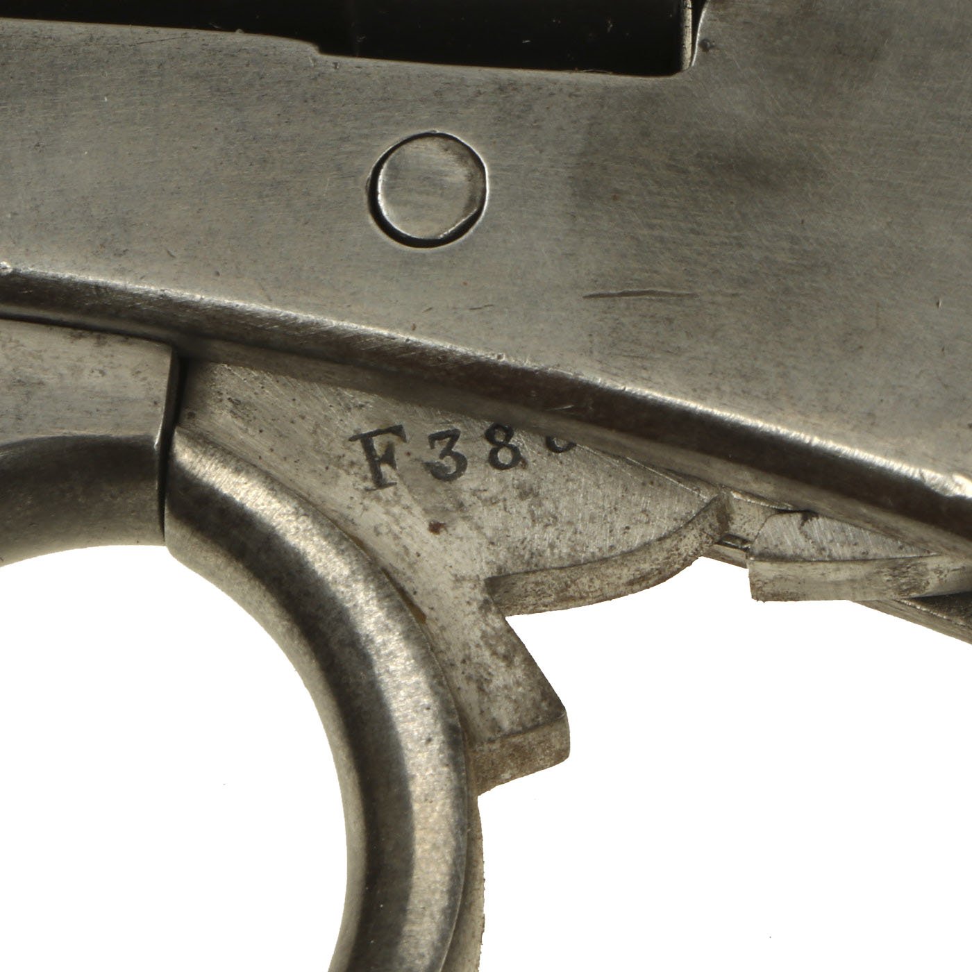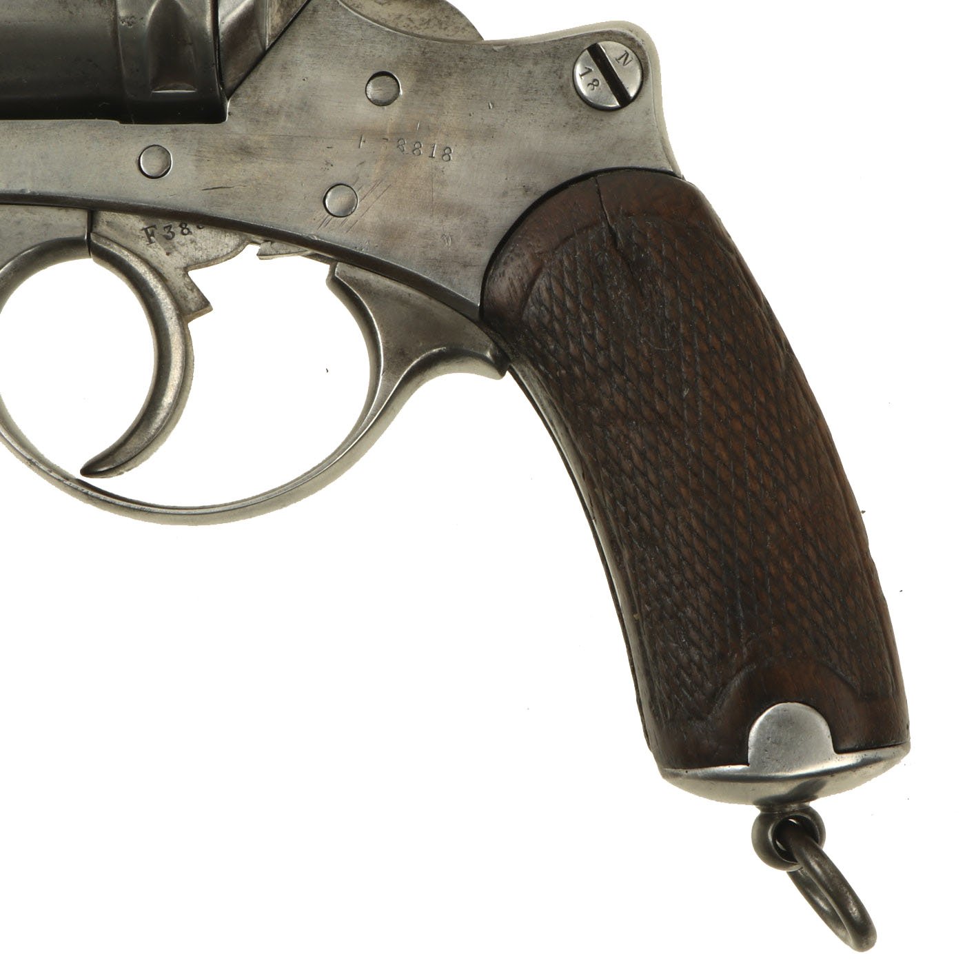 This very good mechanically sound example is in the original bright finish, which is still in very good condition, with light overall staining and wear from cleaning. It is marked Mre d'Armes / Saint-Étienne on the right side of the frame and features all matching serial number F38818 on the barrel (faint), frame, trigger guard, cylinder, trigger, hammer, and cylinder axis pin. Definitely an "All Matching" example. The top of the barrel is marked Mle, with the "1873" worn away, and the side of the barrel is marked S. 1875, indicating the revolver was manufactured in 1875. Some of the small parts of the revolver are also marked with assembly number M/78.