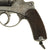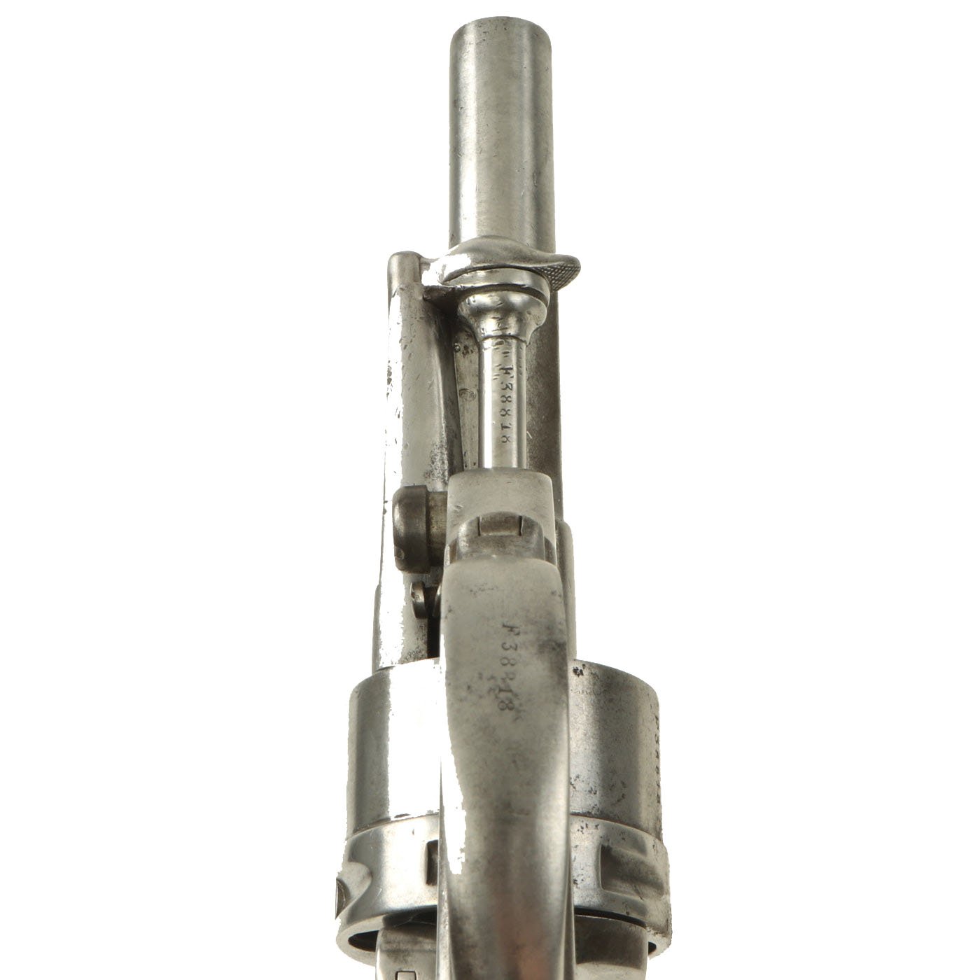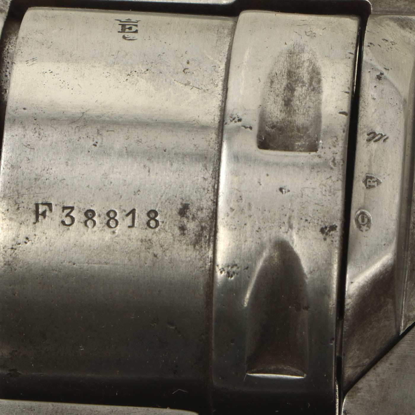 The checkered wooden grips are original and the overall condition of the revolver is very good. Finish is still mostly bright steel, with light staining. There definitely are traces of buffing in the past, which has made many of the markings faint. The inside of the barrel also shows oxidation, with very faint rifling. This revolver seems to have seen extensive service. The lanyard ring is still present, and is not damaged or dented. The action works well, with good cylinder lockup and indexing.