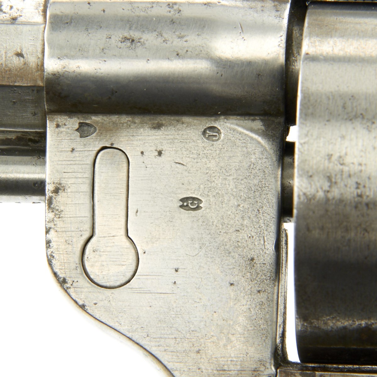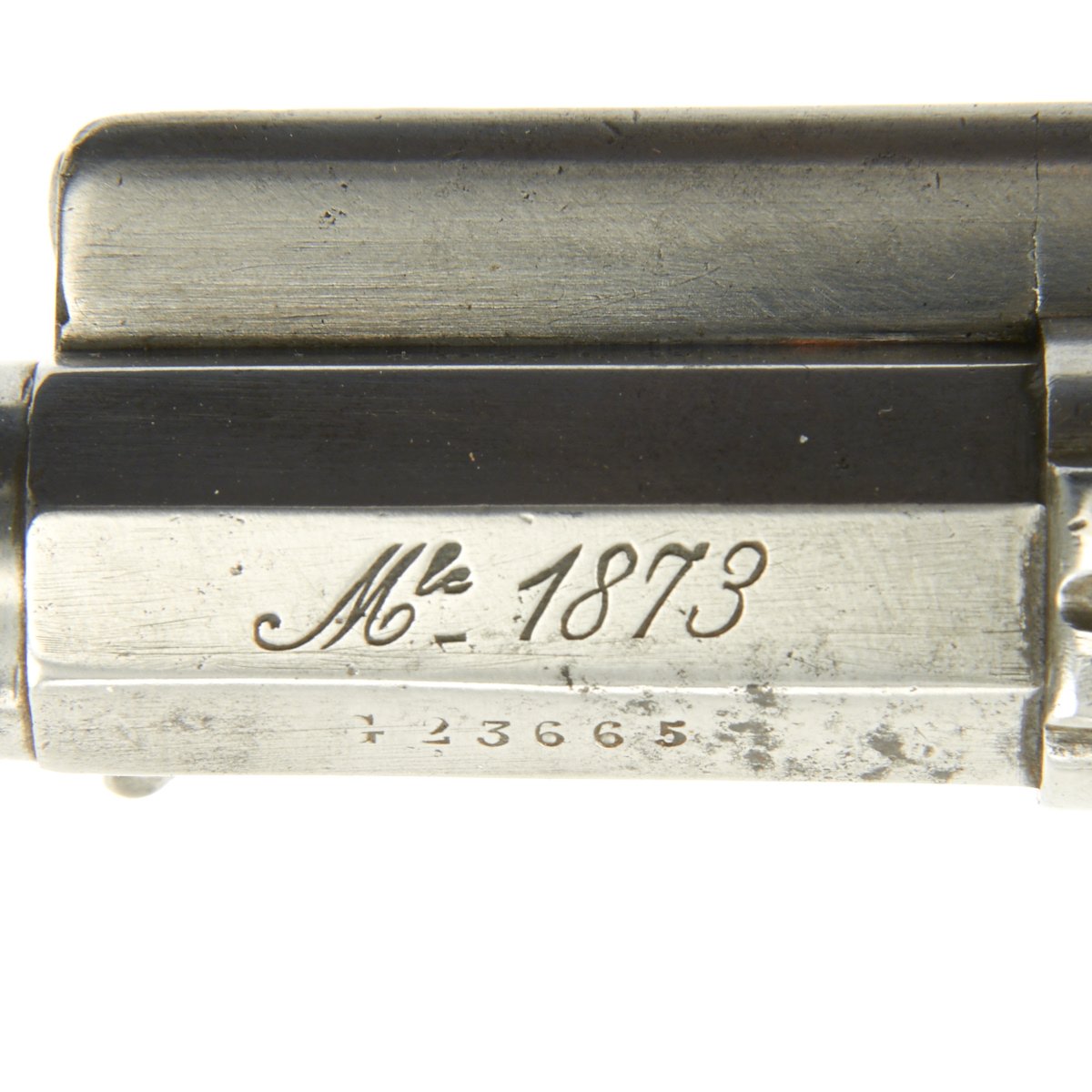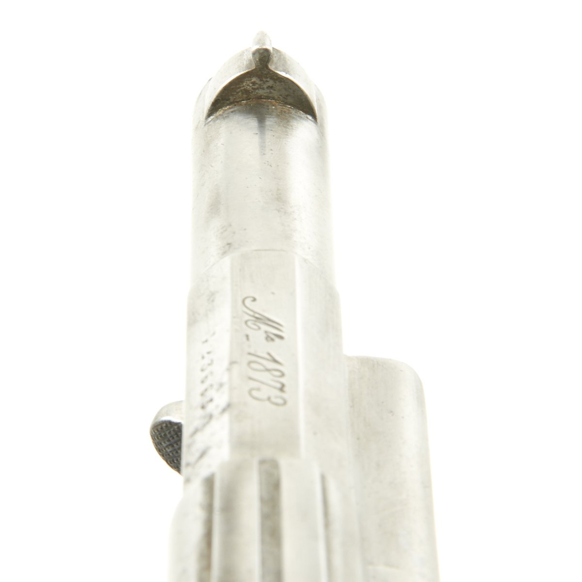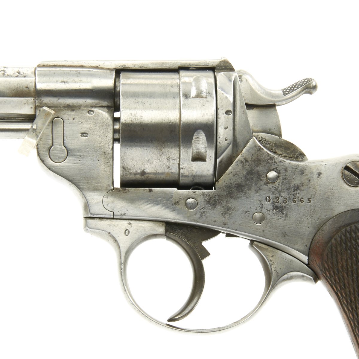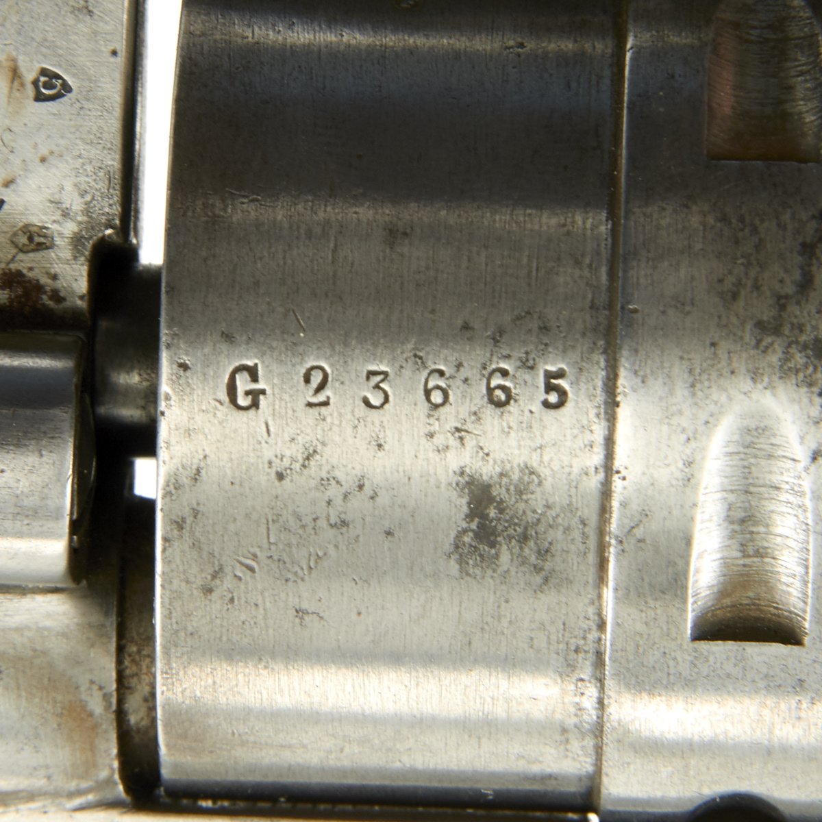This excellent mechanically sound example is in the original bright finish, though it does have some staining due to over 100 years of age. It is marked Mre d'Armes / Saint-Étienne on the right side of the frame and features all matching serial number G23665 on the barrel, frame, trigger guard, cylinder, hammer, and cylinder axis pin. The top of the barrel is marked Mle 1873 and the side of the barrel is marked S. 1876, indicating the revolver was manufactured in 1878. Many of the small parts of the revolver are also marked with assembly number L65. There is also rack number P 2931 on the rear spine of the grip.