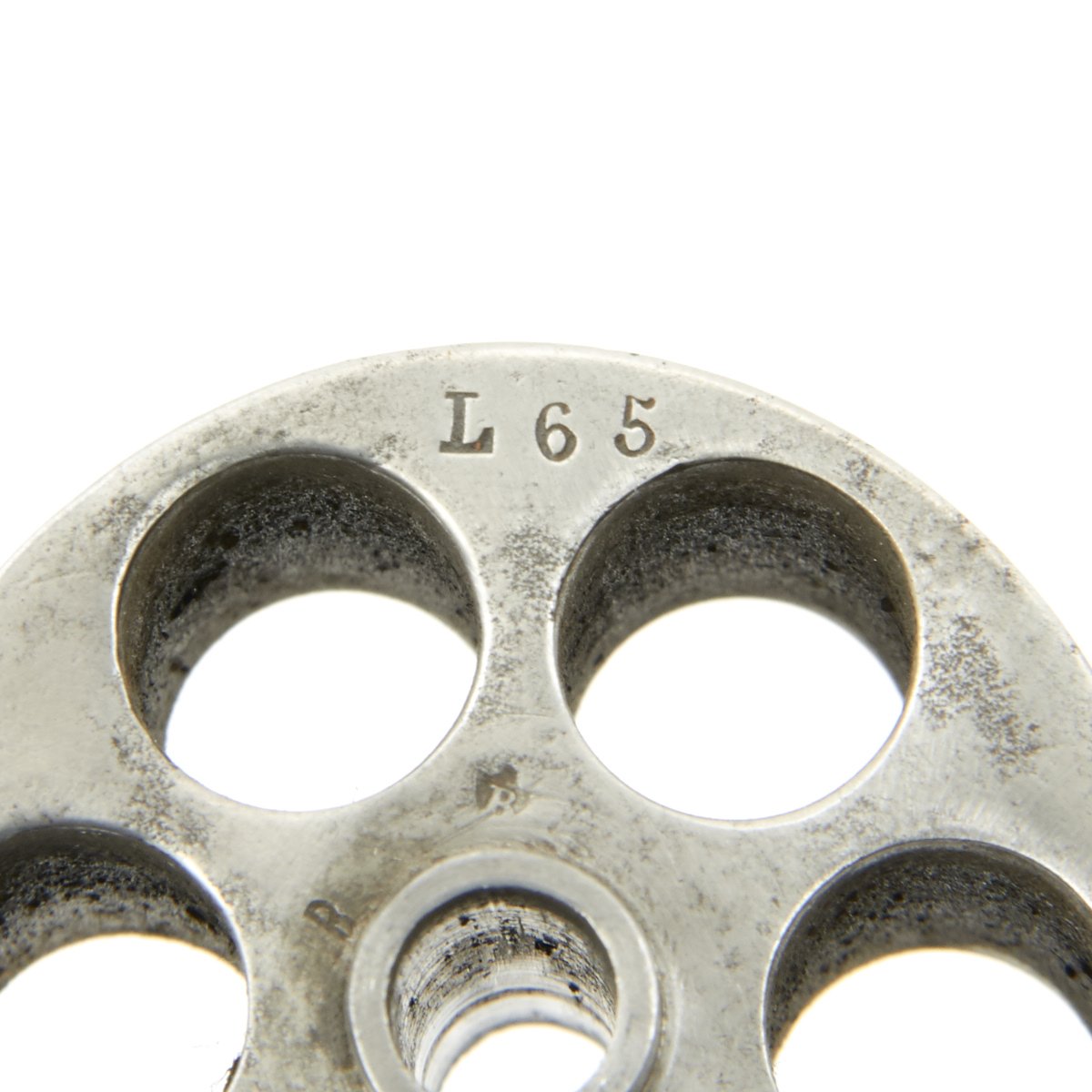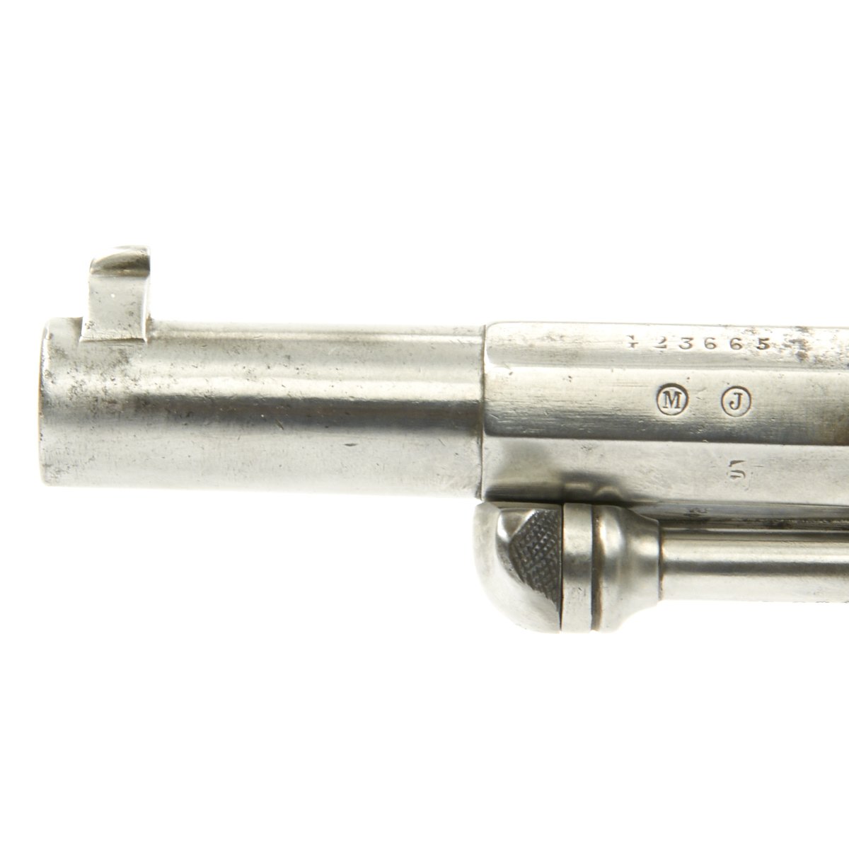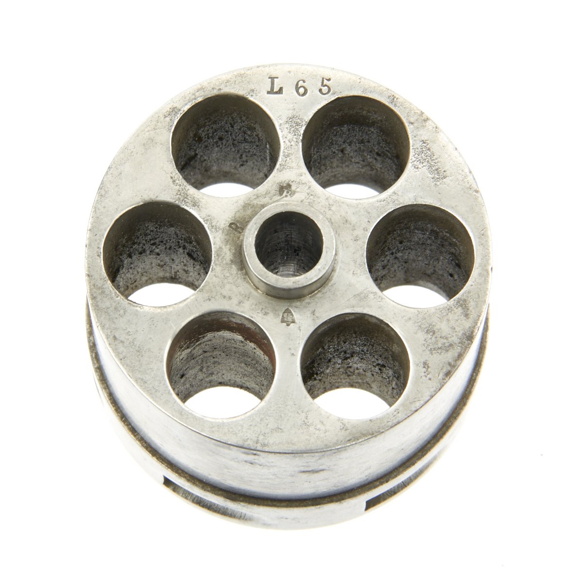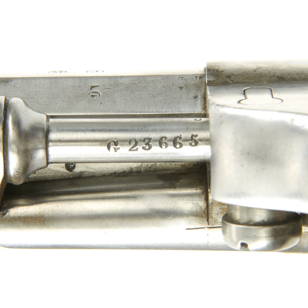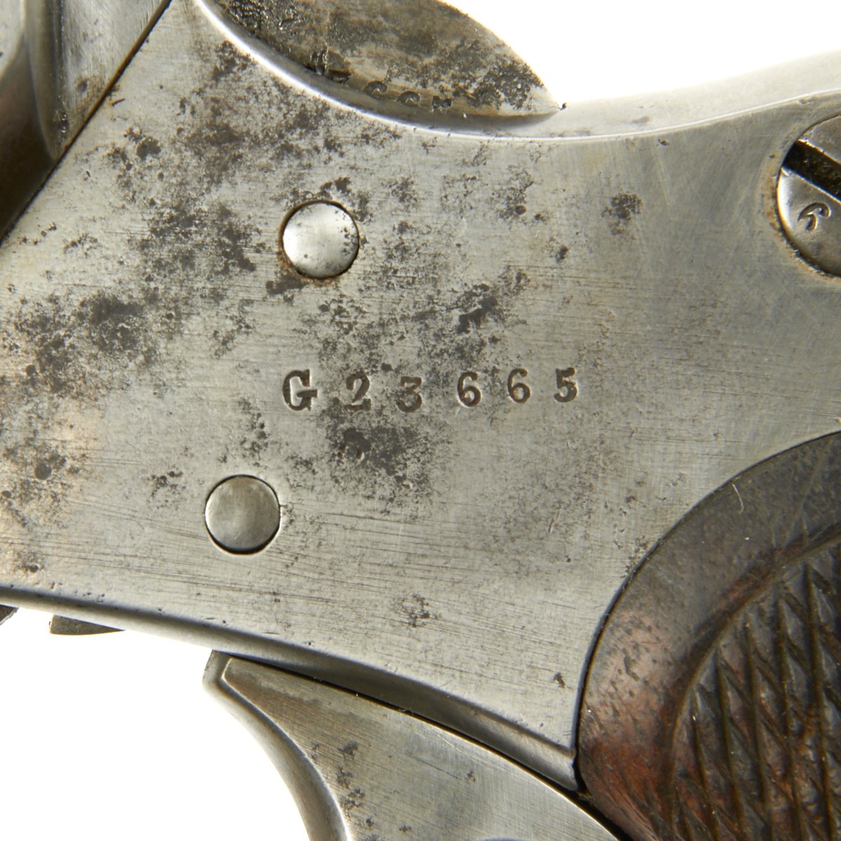 This excellent mechanically sound example is in the original bright finish, though it does have some staining due to over 100 years of age. It is marked Mre d'Armes / Saint-Étienne on the right side of the frame and features all matching serial number G23665 on the barrel, frame, trigger guard, cylinder, hammer, and cylinder axis pin. The top of the barrel is marked Mle 1873 and the side of the barrel is marked S. 1876, indicating the revolver was manufactured in 1878. Many of the small parts of the revolver are also marked with assembly number L65. There is also rack number P 2931 on the rear spine of the grip.
