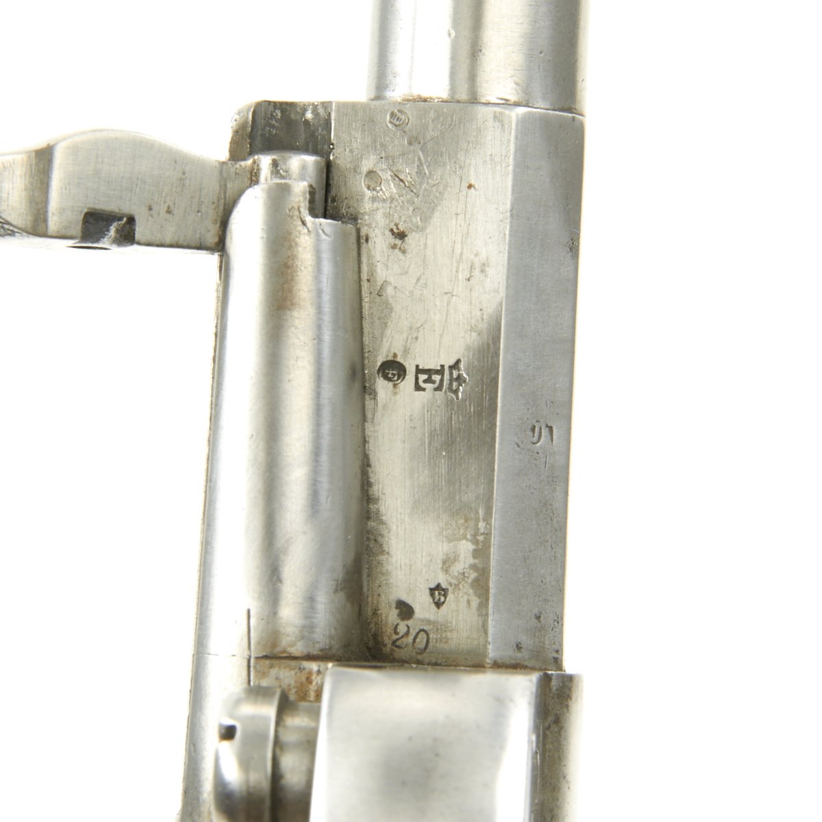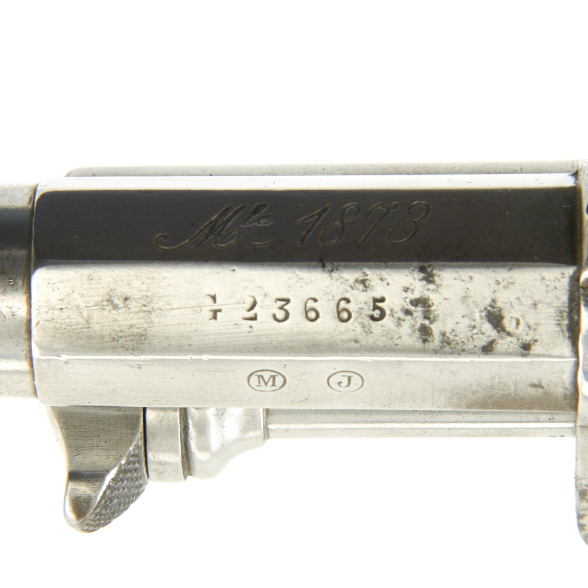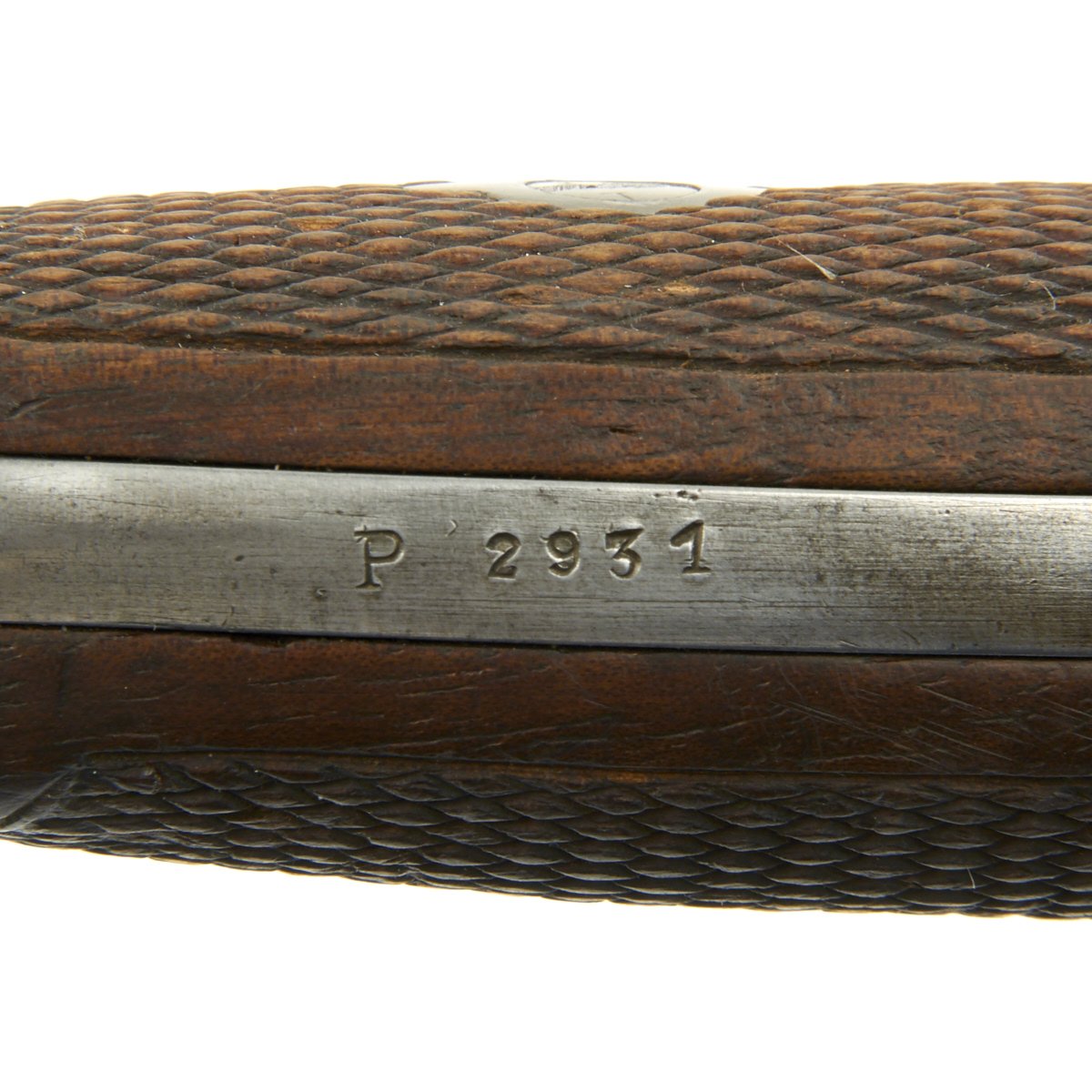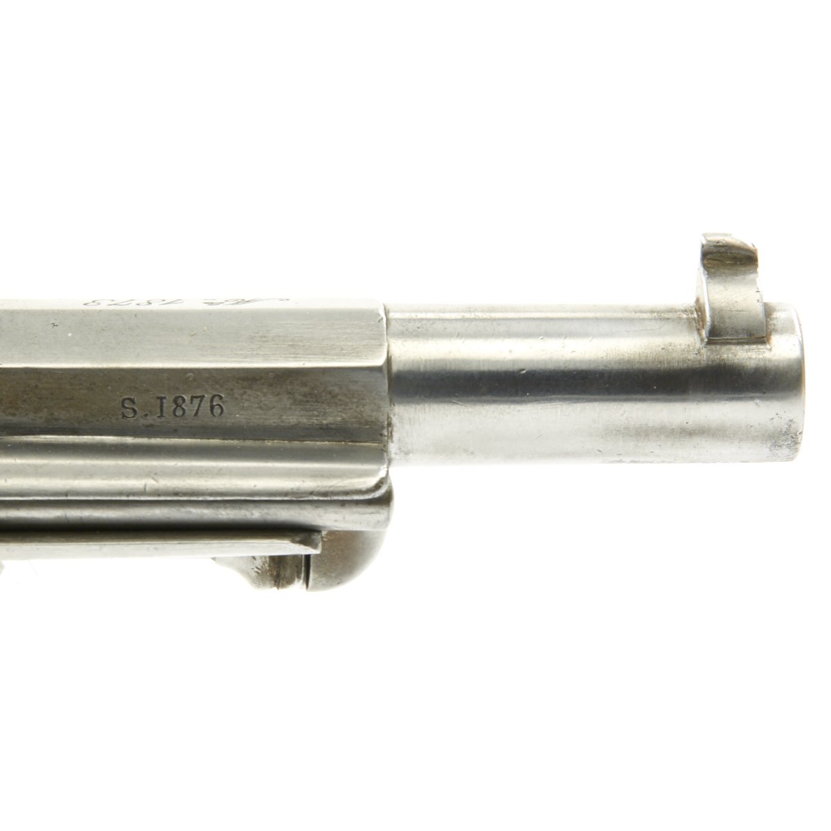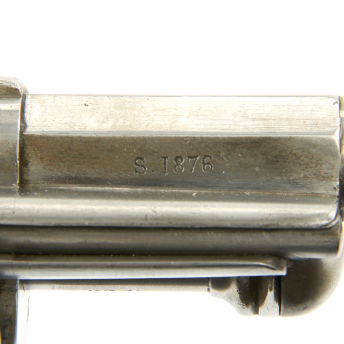 This excellent mechanically sound example is in the original bright finish, though it does have some staining due to over 100 years of age. It is marked Mre d'Armes / Saint-Étienne on the right side of the frame and features all matching serial number G23665 on the barrel, frame, trigger guard, cylinder, hammer, and cylinder axis pin. The top of the barrel is marked Mle 1873 and the side of the barrel is marked S. 1876, indicating the revolver was manufactured in 1878. Many of the small parts of the revolver are also marked with assembly number L65. There is also rack number P 2931 on the rear spine of the grip.