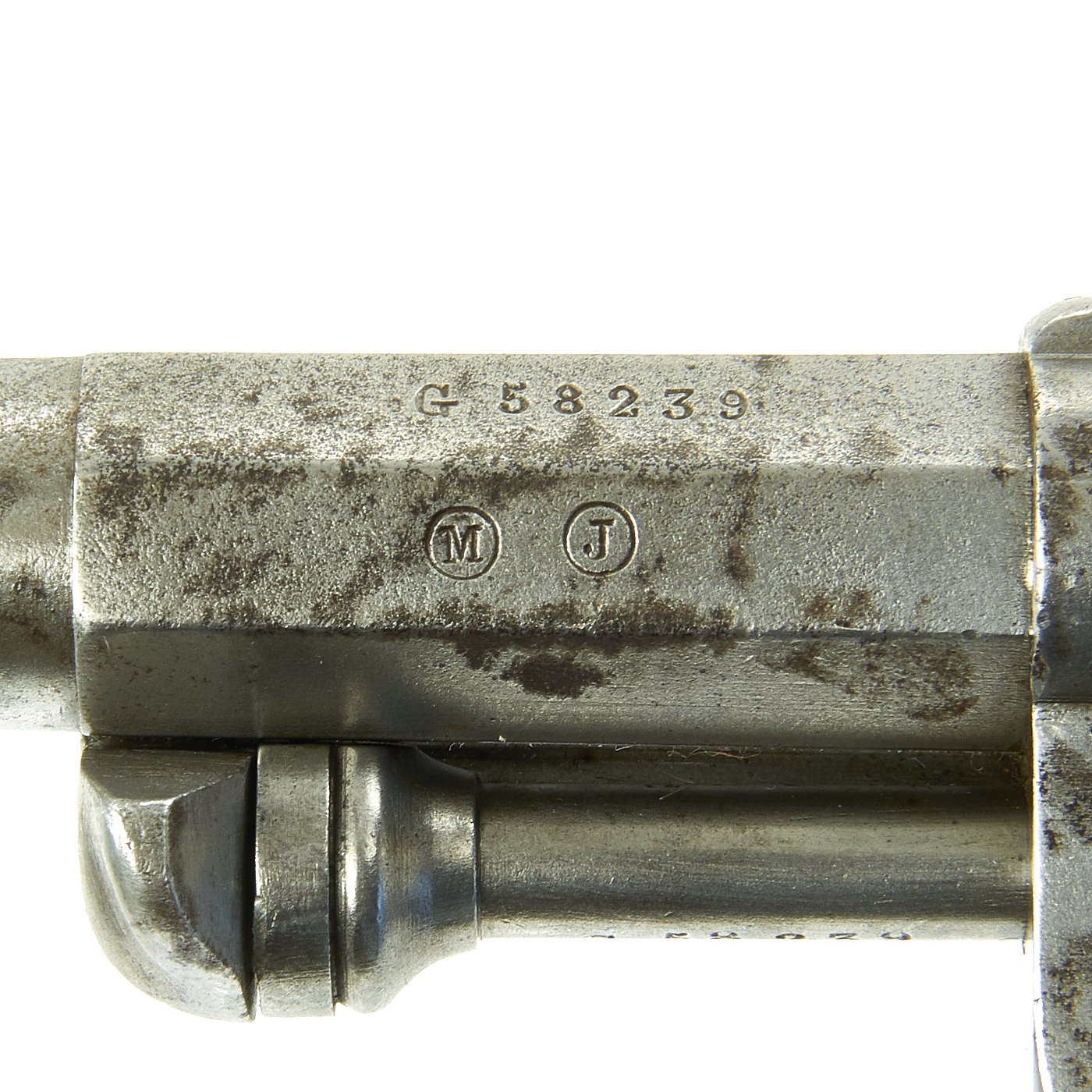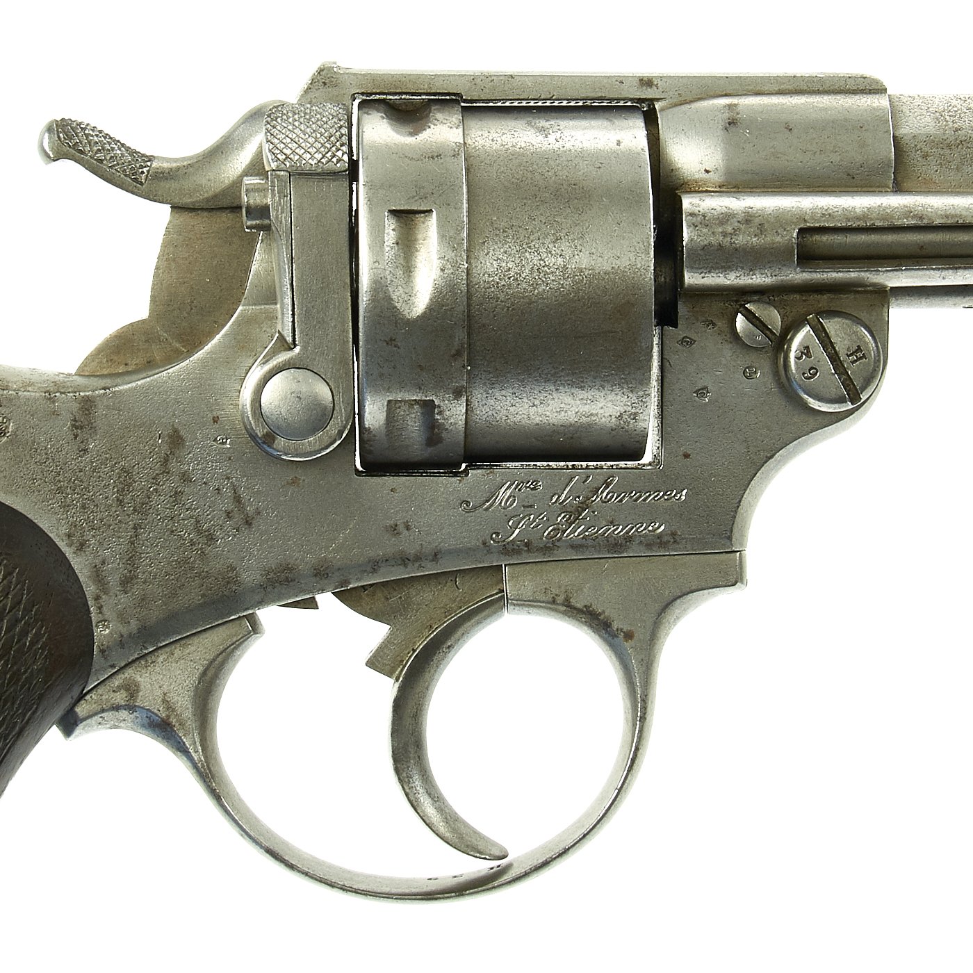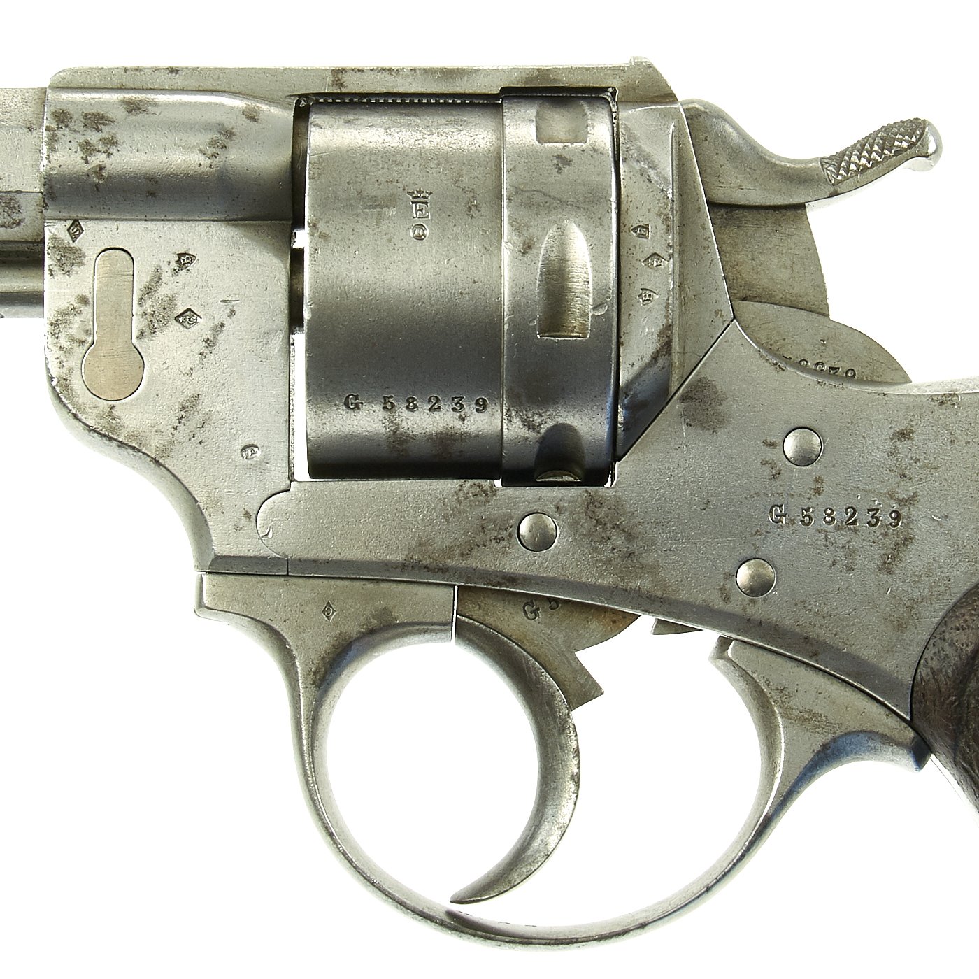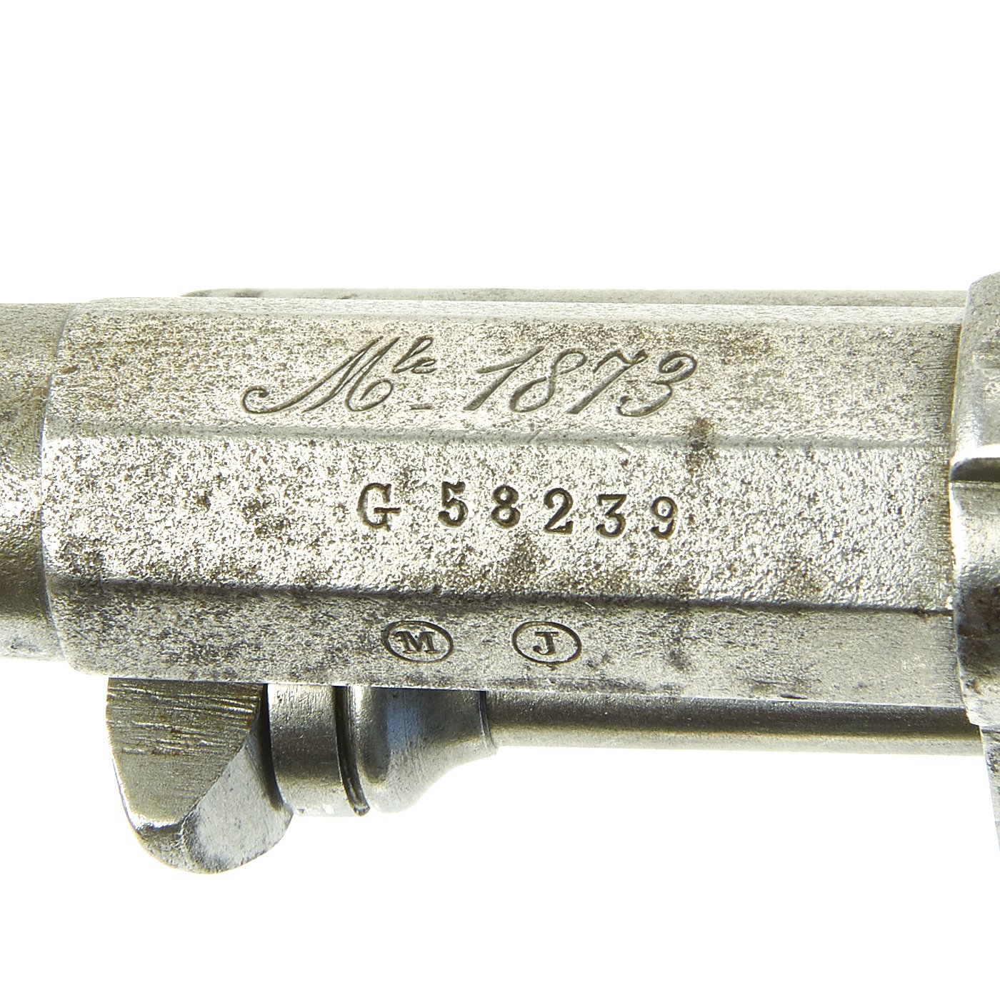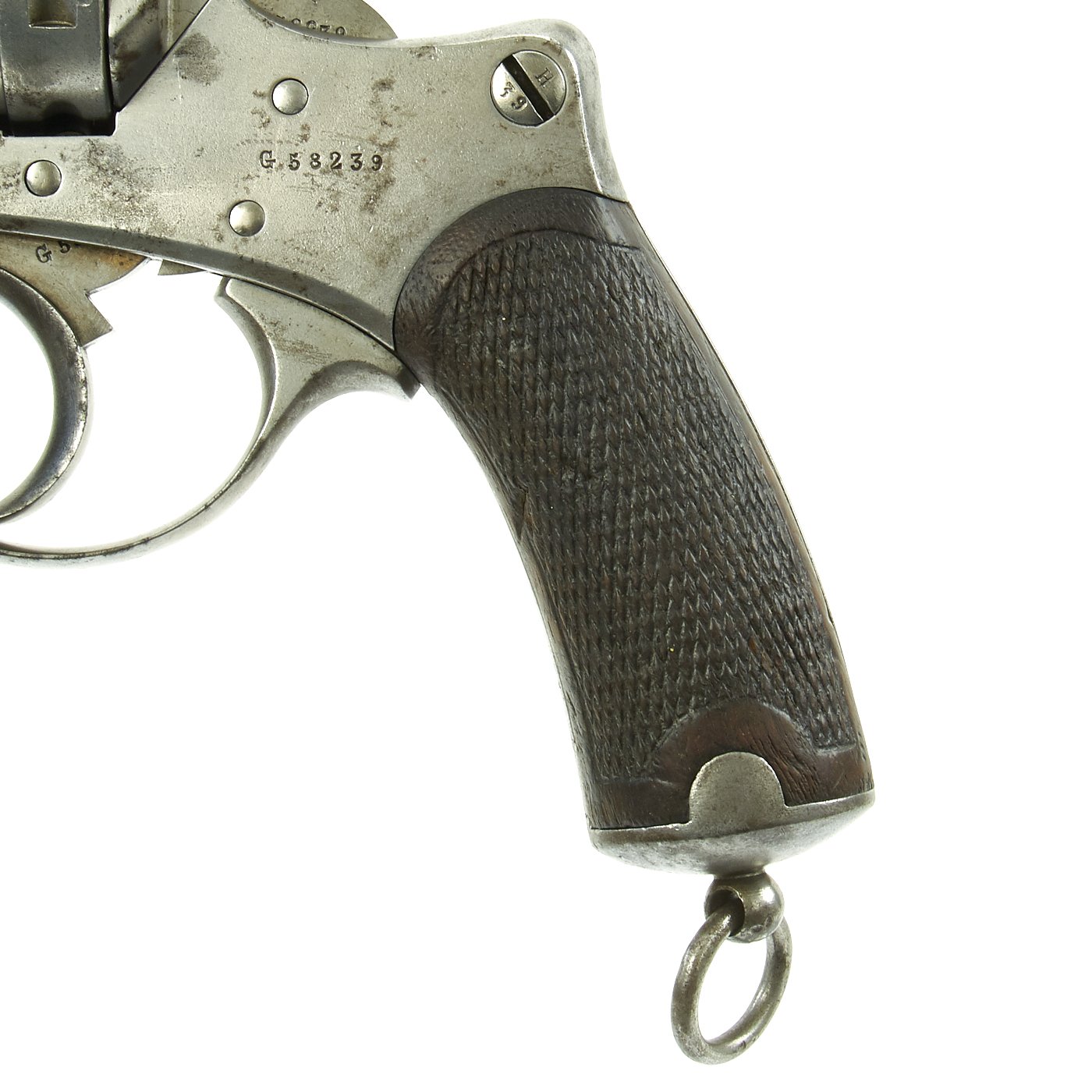 This excellent mechanically sound example is in the original bright finish, though it does have some staining and light pitting due to over 100 years of age. It is marked Mre d'Armes / Saint-Étienne on the right side of the frame and features all matching serial number G58239 on the barrel, frame, trigger guard, cylinder, trigger, hammer, and cylinder axis pin. Definitely an "All Matching" example. The top of the barrel is marked Mle 1873 and the side of the barrel is marked S. 1877, indicating the revolver was manufactured in 1877. Many of the small parts of the revolver are also marked with assembly number H/39.