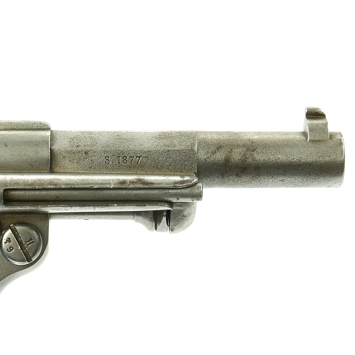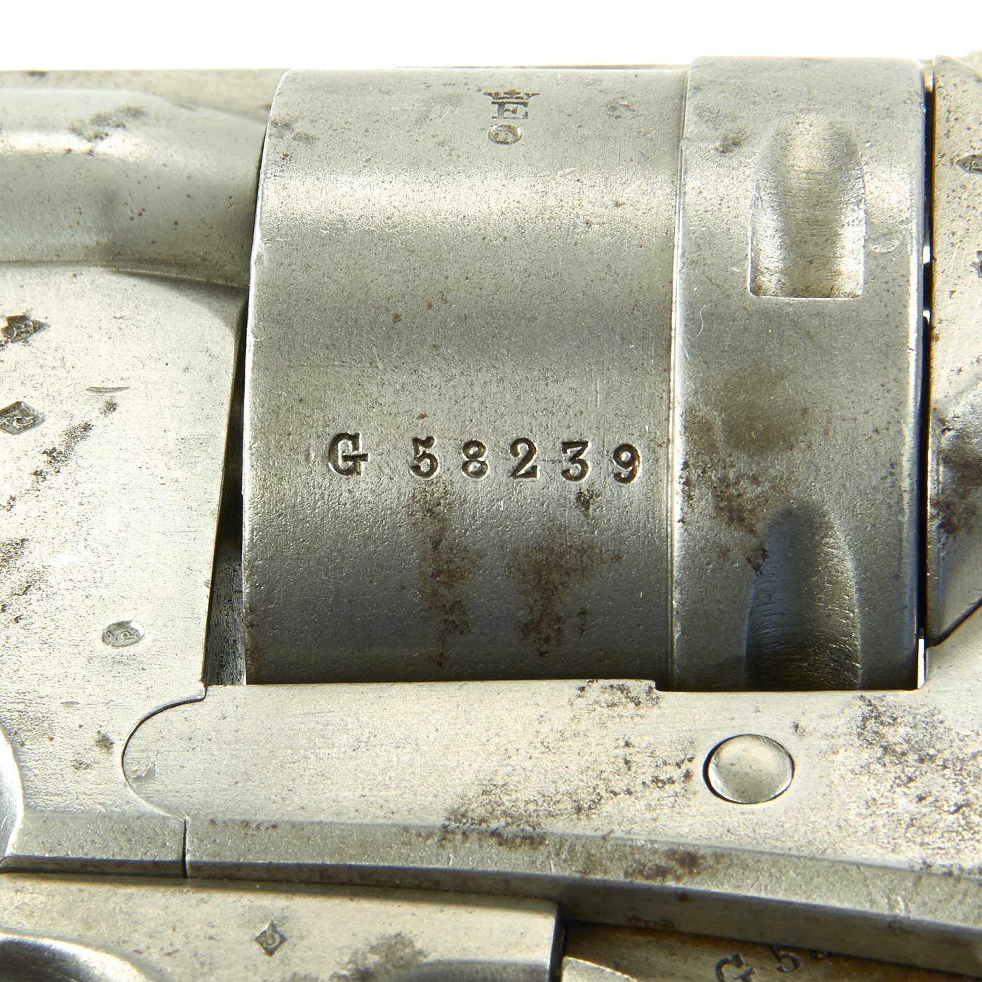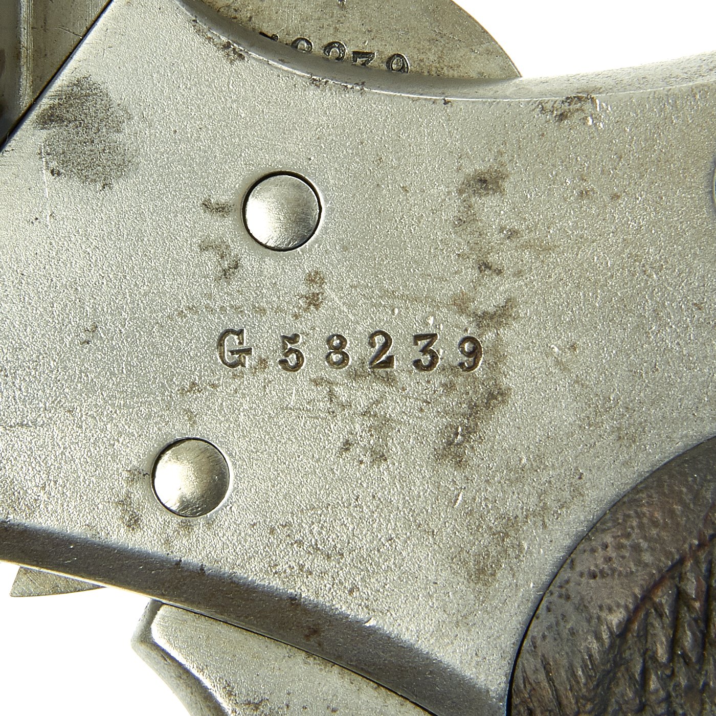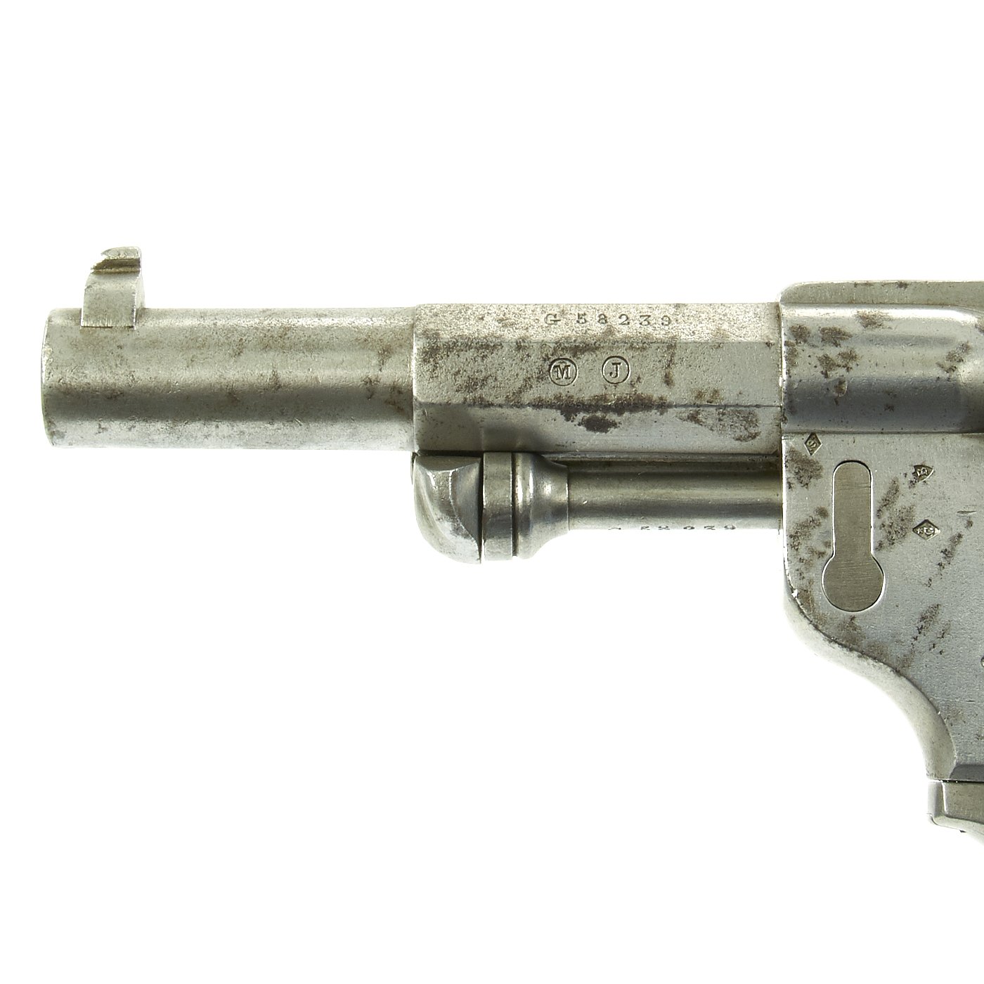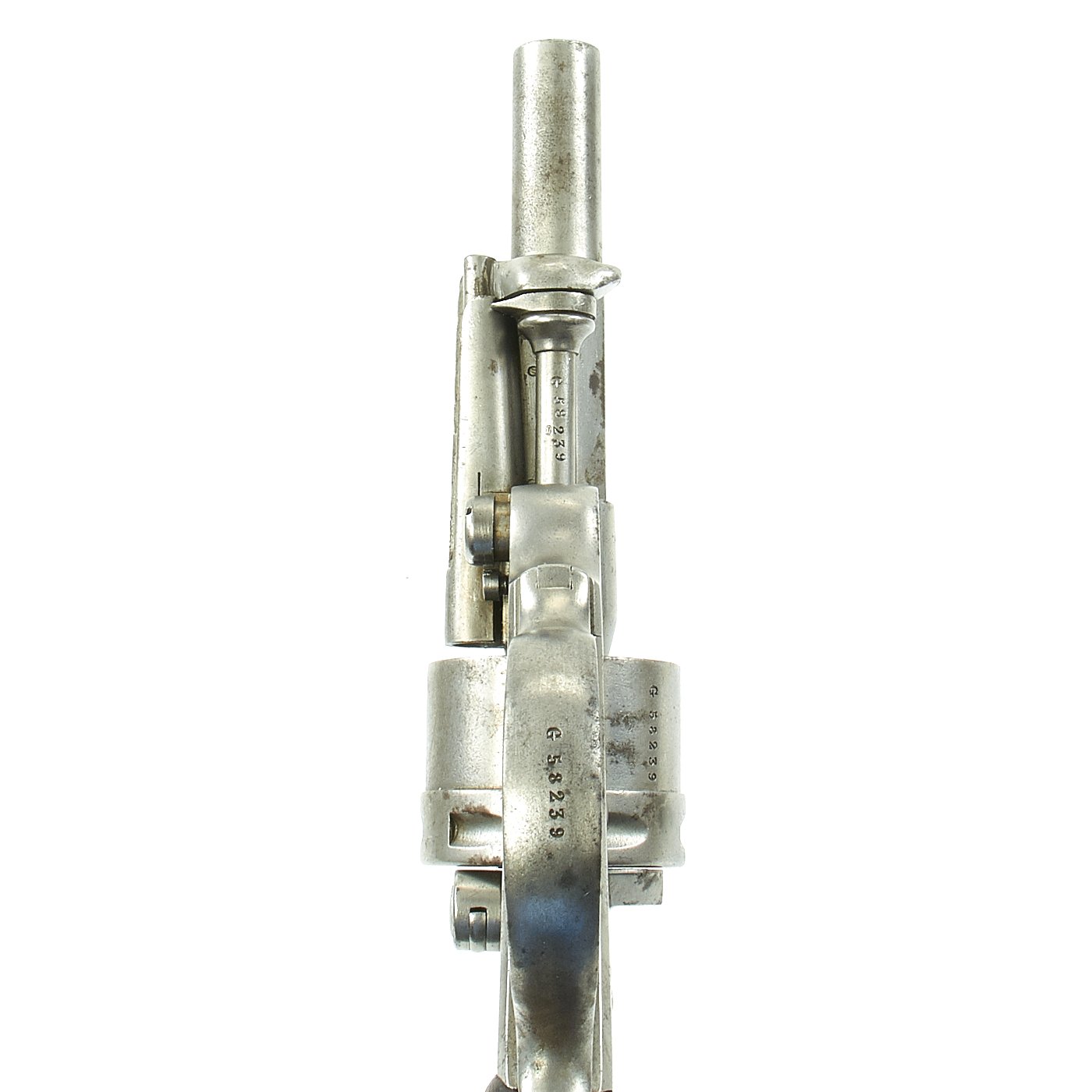 This excellent mechanically sound example is in the original bright finish, though it does have some staining and light pitting due to over 100 years of age. It is marked Mre d'Armes / Saint-Étienne on the right side of the frame and features all matching serial number G58239 on the barrel, frame, trigger guard, cylinder, trigger, hammer, and cylinder axis pin. Definitely an "All Matching" example. The top of the barrel is marked Mle 1873 and the side of the barrel is marked S. 1877, indicating the revolver was manufactured in 1877. Many of the small parts of the revolver are also marked with assembly number H/39.