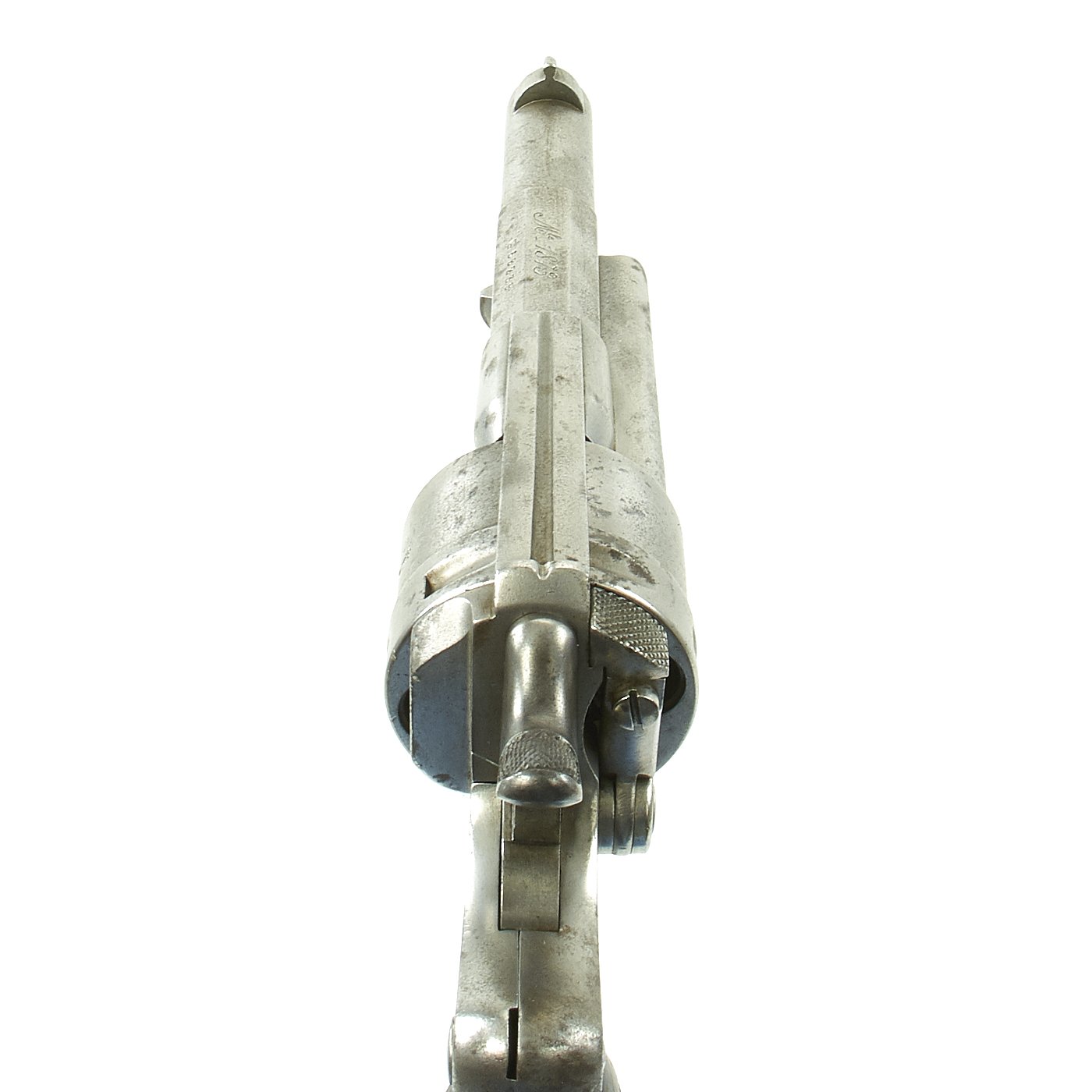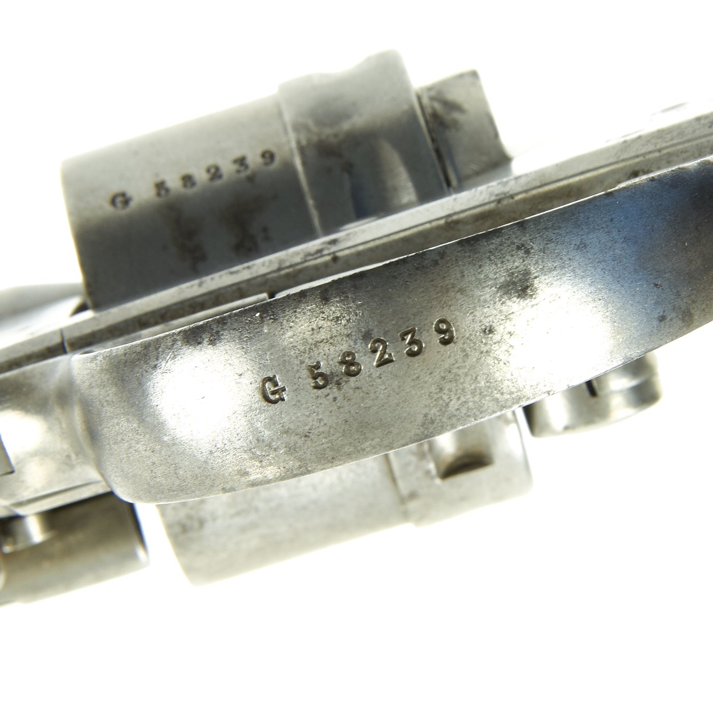 The checkered wooden grips are original and the overall condition of the revolver is very good. Finish is still mostly bright steel, with some staining from age, and a bit of past pitting. Barrel is in good condition, with clear lands and grooves and a bright finish. The lanyard ring is still present, and is not damaged or dented. The action works well, with good cylinder lockup and indexing.