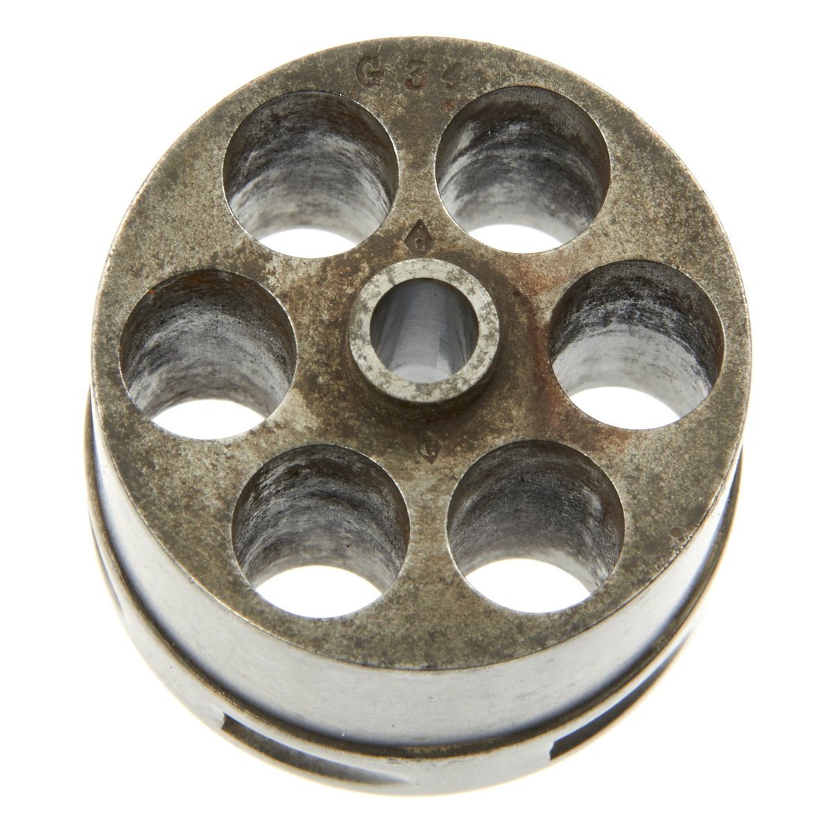 The checkered wooden grips are original and the overall condition of the revolver is very good. Finish is still mostly bright steel, with some staining from age, and a bit of past pitting. Barrel is in good condition, with clear lands and grooves and a bright finish. The lanyard ring is still present, and is not damaged or dented. Interestingly, the loading gate on the right side of the cylinder's rear has been removed to facilitate quick re-loading, often a real necessity when fighting the Arab Rebels in the North African Desert. Also, the small screw holding the ejector spring in place was removed long ago.