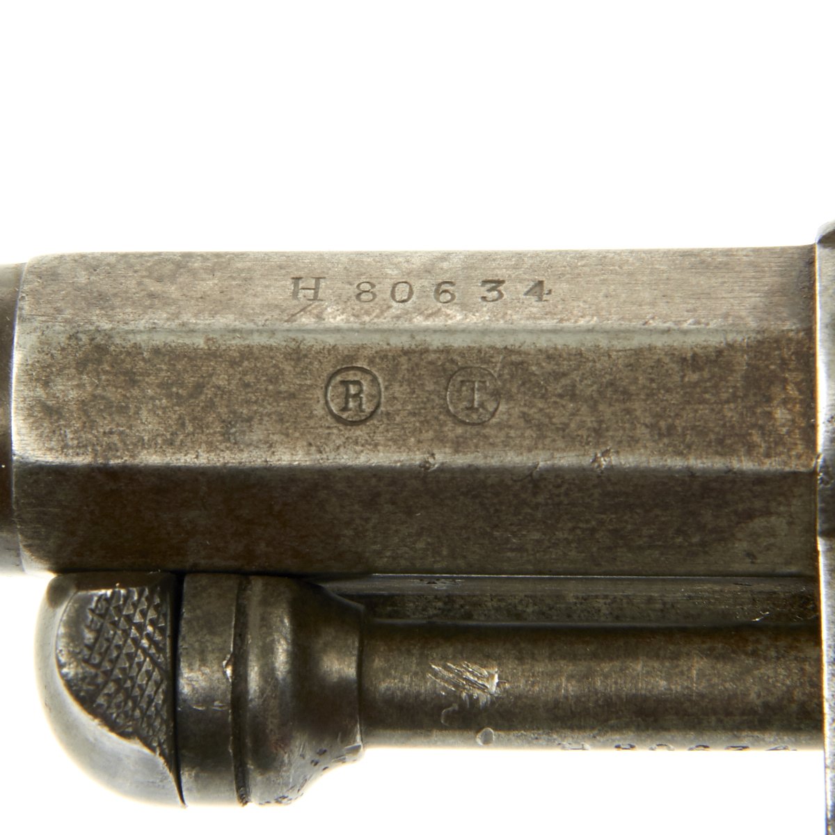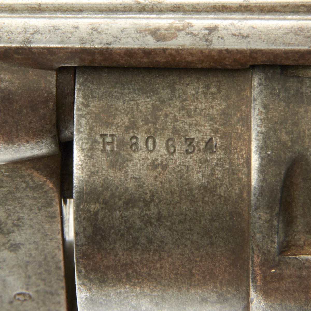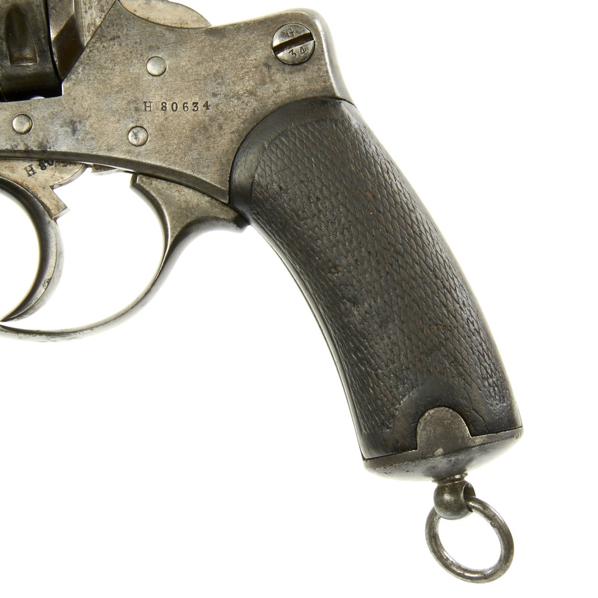 This excellent mechanically sound example is in the original bright finish, though it does have some staining and light pitting due to over 100 years of age. It is marked Mre d'Armes / Saint-Étienne on the right side of the frame and features all matching serial number H80634 on the barrel, frame, trigger guard, cylinder, trigger, hammer, and cylinder axis pin. The top of the barrel is marked Mle 1873 and the side of the barrel is marked S. 1882, indicating the revolver was manufactured in 1882. Many of the small parts of the revolver are also marked with assembly number G/34.