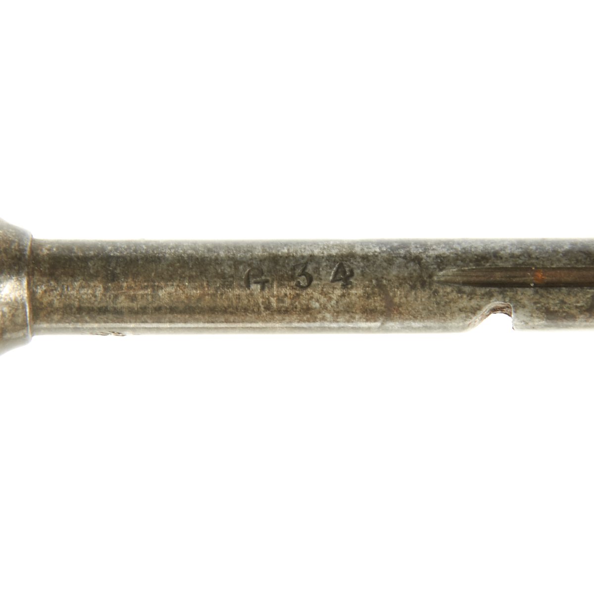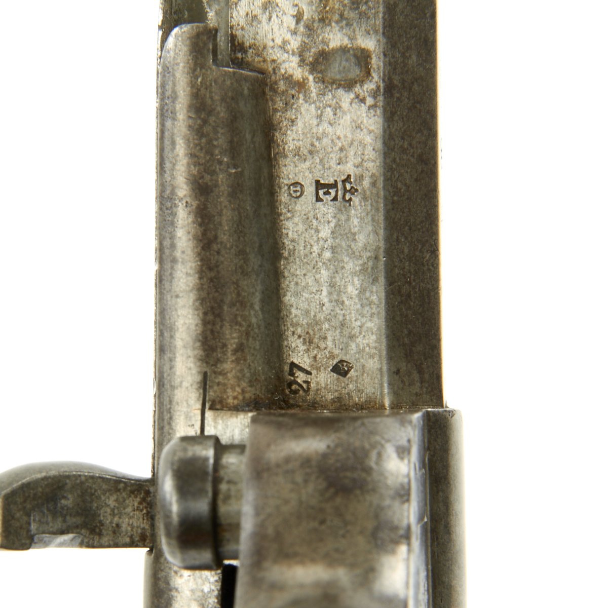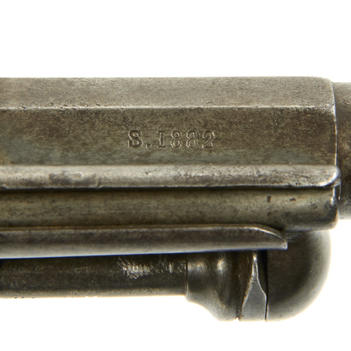 This excellent mechanically sound example is in the original bright finish, though it does have some staining and light pitting due to over 100 years of age. It is marked Mre d'Armes / Saint-Étienne on the right side of the frame and features all matching serial number H80634 on the barrel, frame, trigger guard, cylinder, trigger, hammer, and cylinder axis pin. The top of the barrel is marked Mle 1873 and the side of the barrel is marked S. 1882, indicating the revolver was manufactured in 1882. Many of the small parts of the revolver are also marked with assembly number G/34.