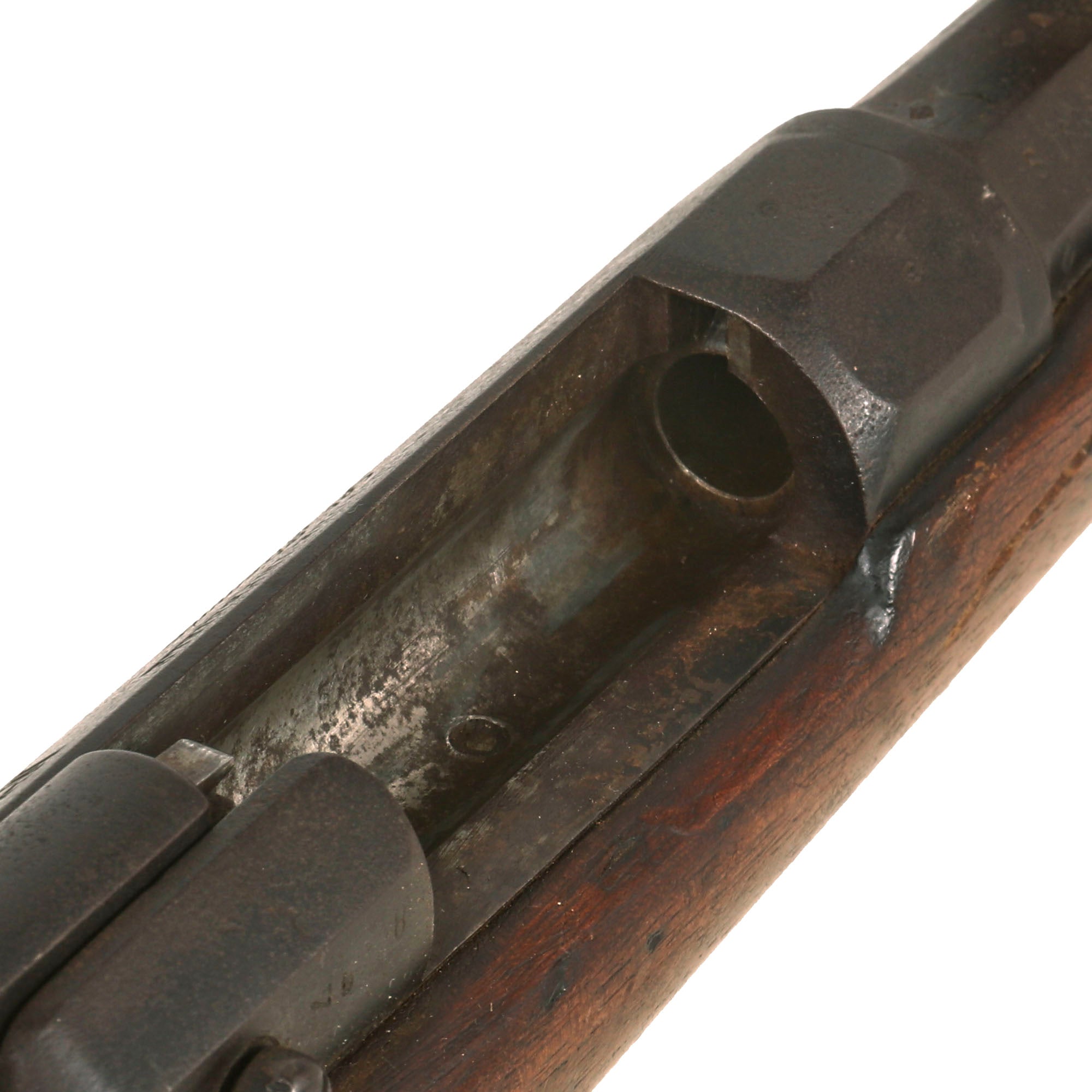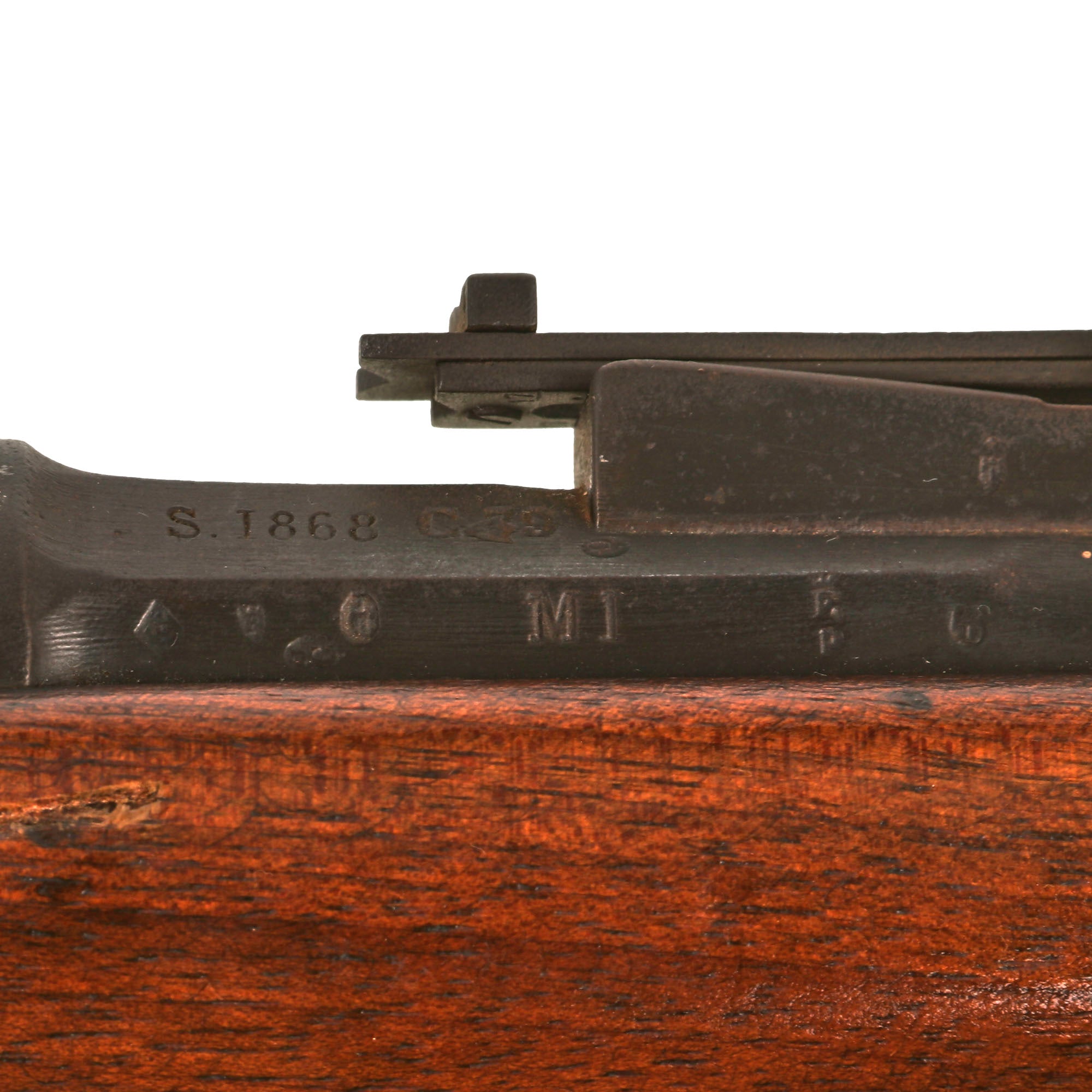 Condition of the rifle is good, though it is missing the cleaning rod. The stock is in great shape and retains its original markings, with arsenal roundels on the buttstock and the serial number still solid. The stock has a nice color and no cracks or repairs that we can see, with the expected dings and scratches from service. Metalwork is in good condition, but does show signs of past pitting throughout. The rifle cycles well, though can be stiff due to wear and age, as it has seen much service. The bore is mostly bright, with clear lands and grooves, which do show wear. There are also small areas of fouling in the grooves. Both sling swivels are still present and functional, and the rear sight is intact and functional.