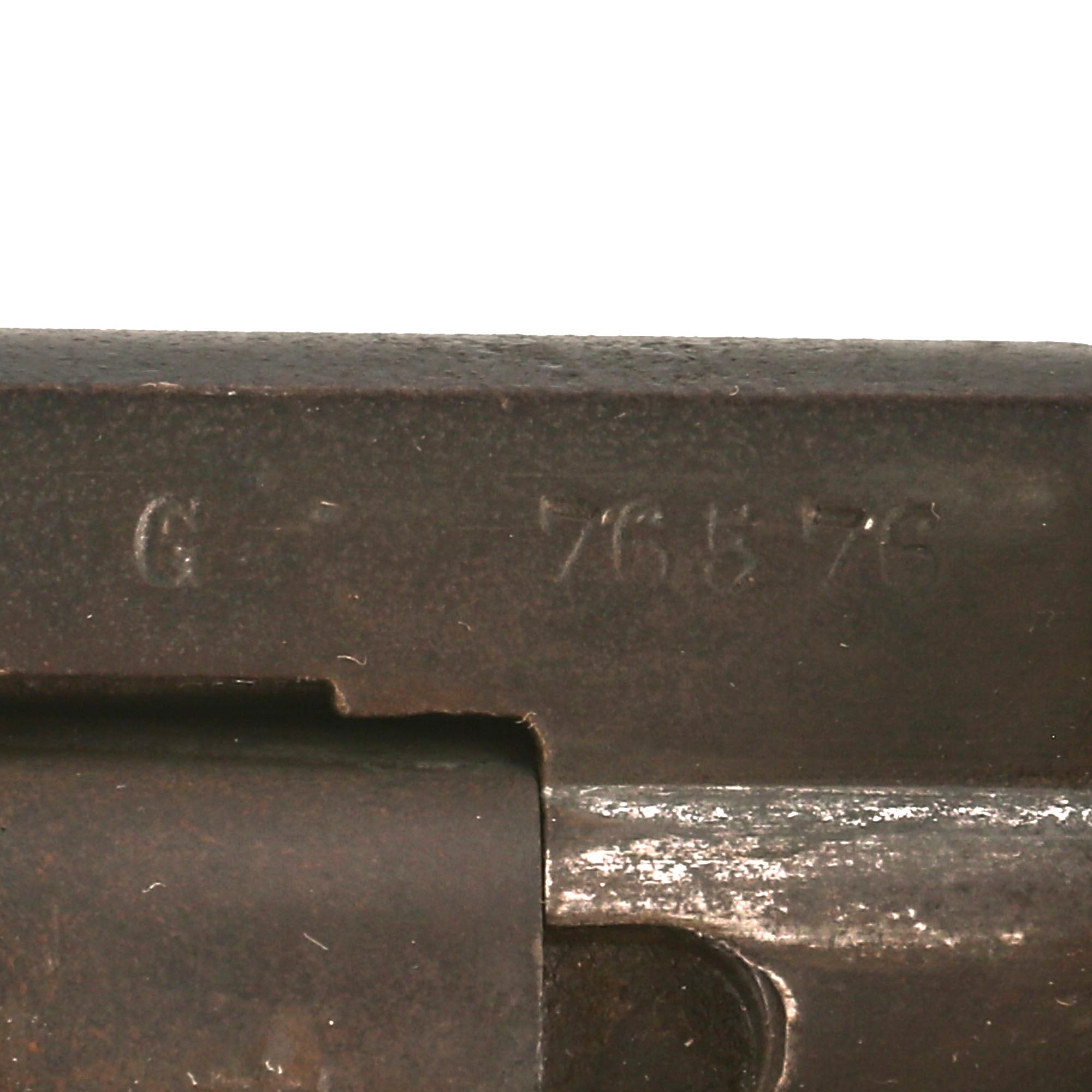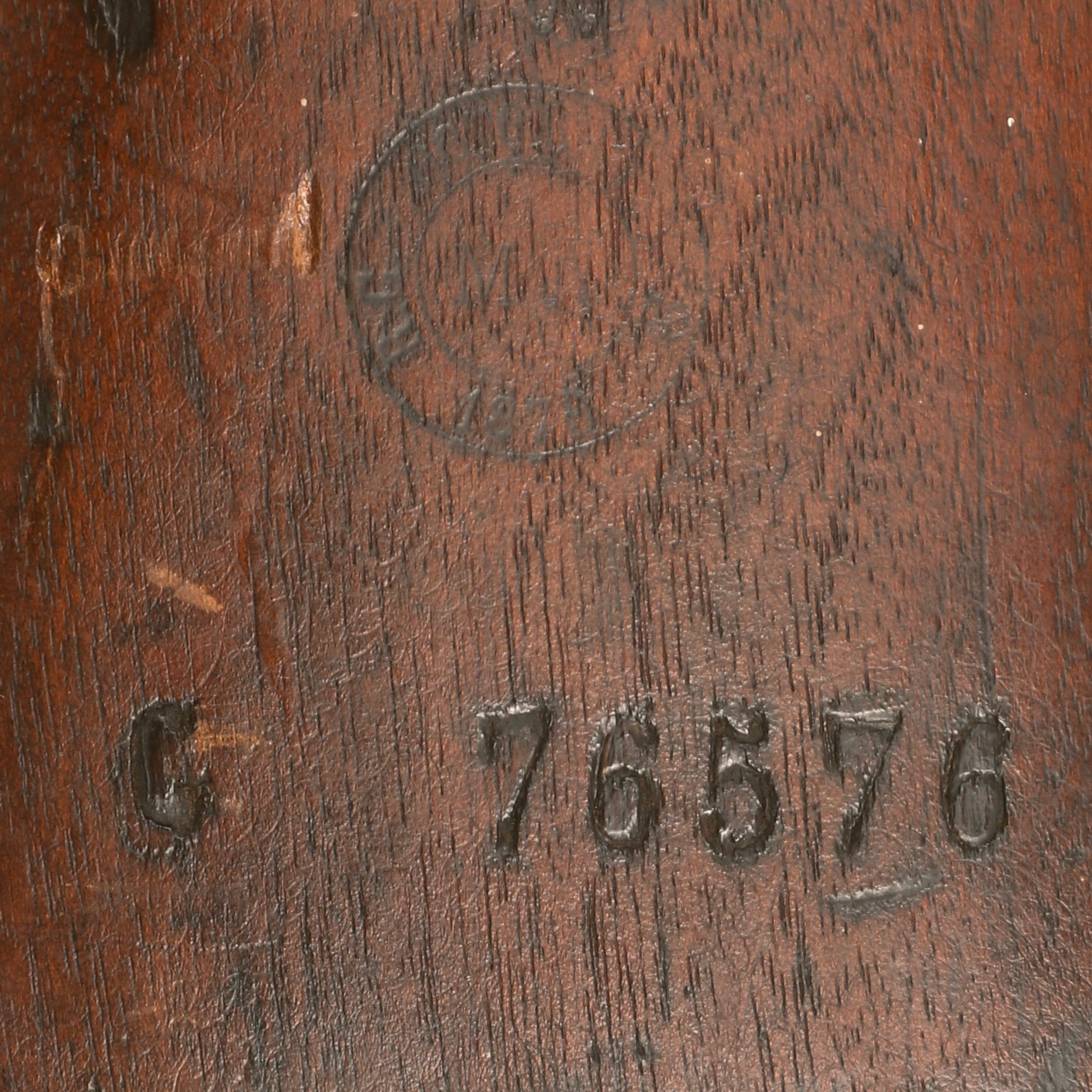 The receiver on this nice service used example is marked MANUFACTURE IMPÉRIALE / St. Étienne and to the right of this is MLE 1866-74. There is no "M.80" marking indicating that the bolt and receiver were modified to allow gas escape, which we have confirmed by inspecting the rifle. The rifle has an original issue date stamped into the barrel of S.1868, indicating that it was originally manufactured at St. Étienne Arsenal as a Chassepot in 1868. It was then later converted to the Gras rifle system in 1879 at Châtellerault Arsenal, indicated by the marking C 79. The rifle has all matching serial numbers, with G 76576 on the barrel, bayonet stand, stock, and all parts of the bolt. It's quite rare to see one of these converted rifles that is still all matching.