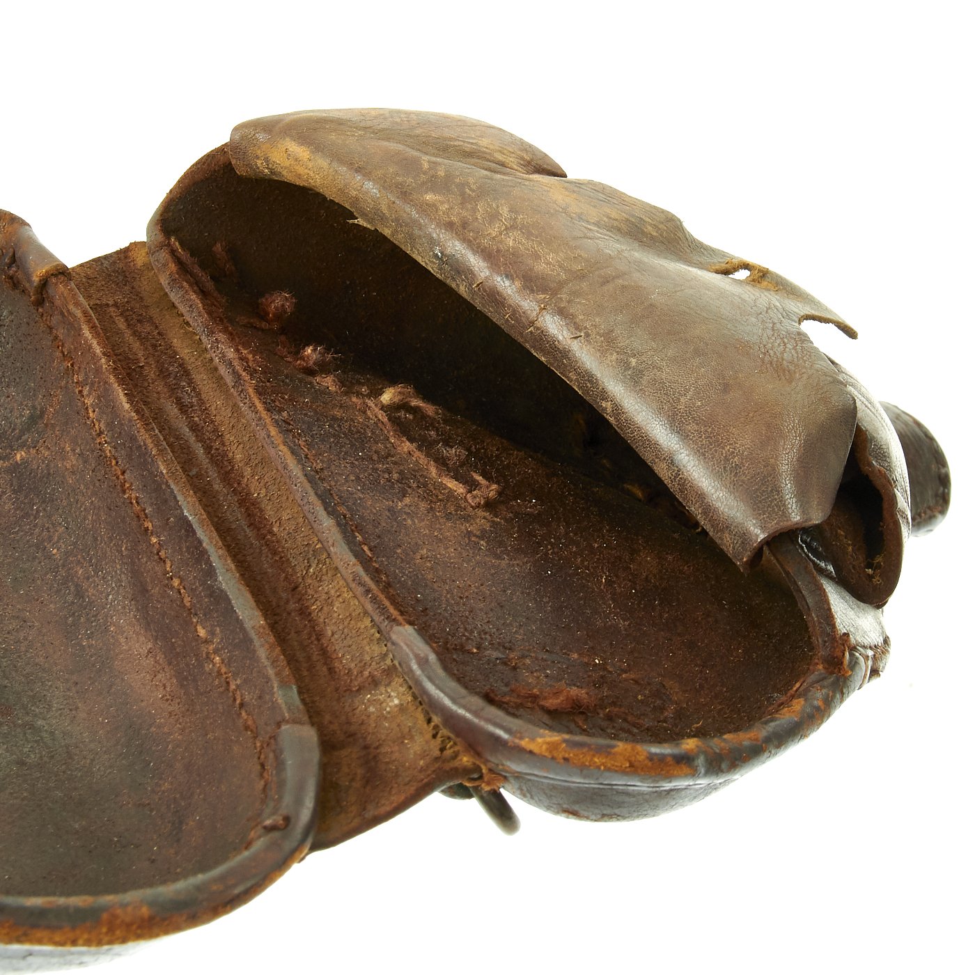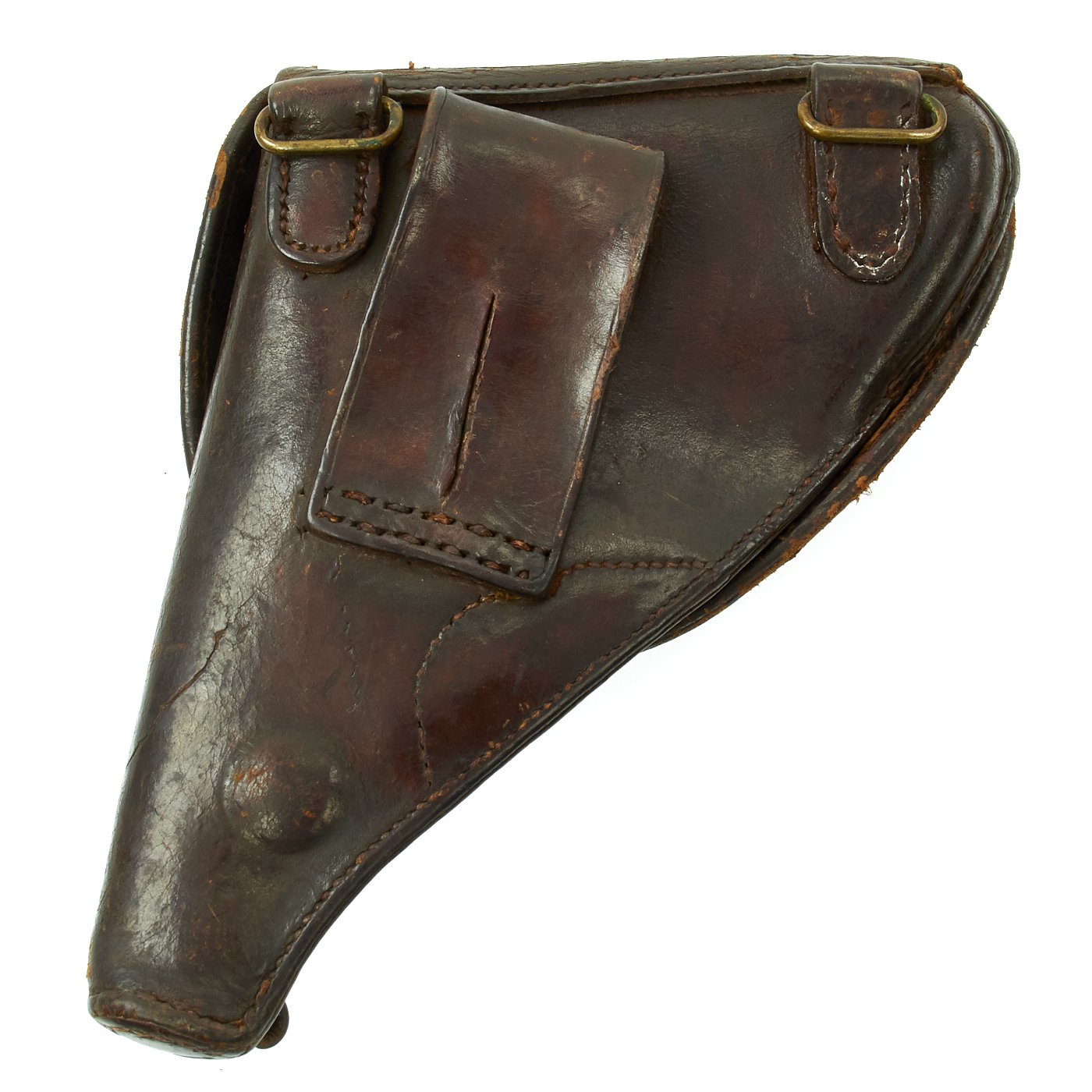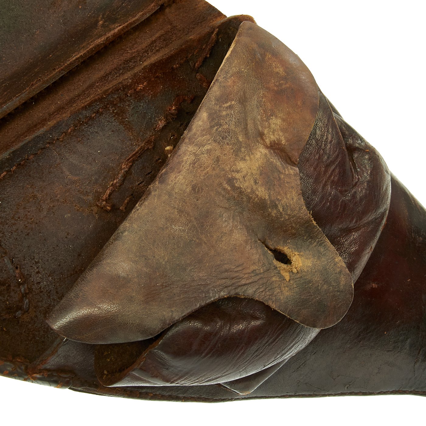 The original holster is the standard hardshell top flap holster, used with both the MAS 1873 and M 1892. It has a lovely aged look, the brown having matured to almost black in some areas. It is structurally sound, with the expected wear of age. it has the correct three loops inside, having been converted to use the "stacks" of 8mm French Ordnance. It also has various stampings and ink markings on the under side of the ammo pouch and main flap. Sadly the shoulder strap is missing.