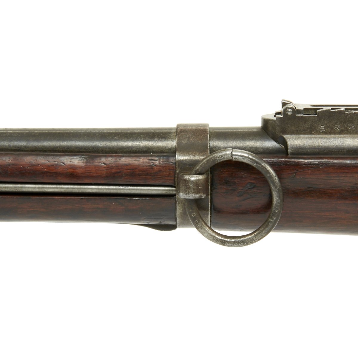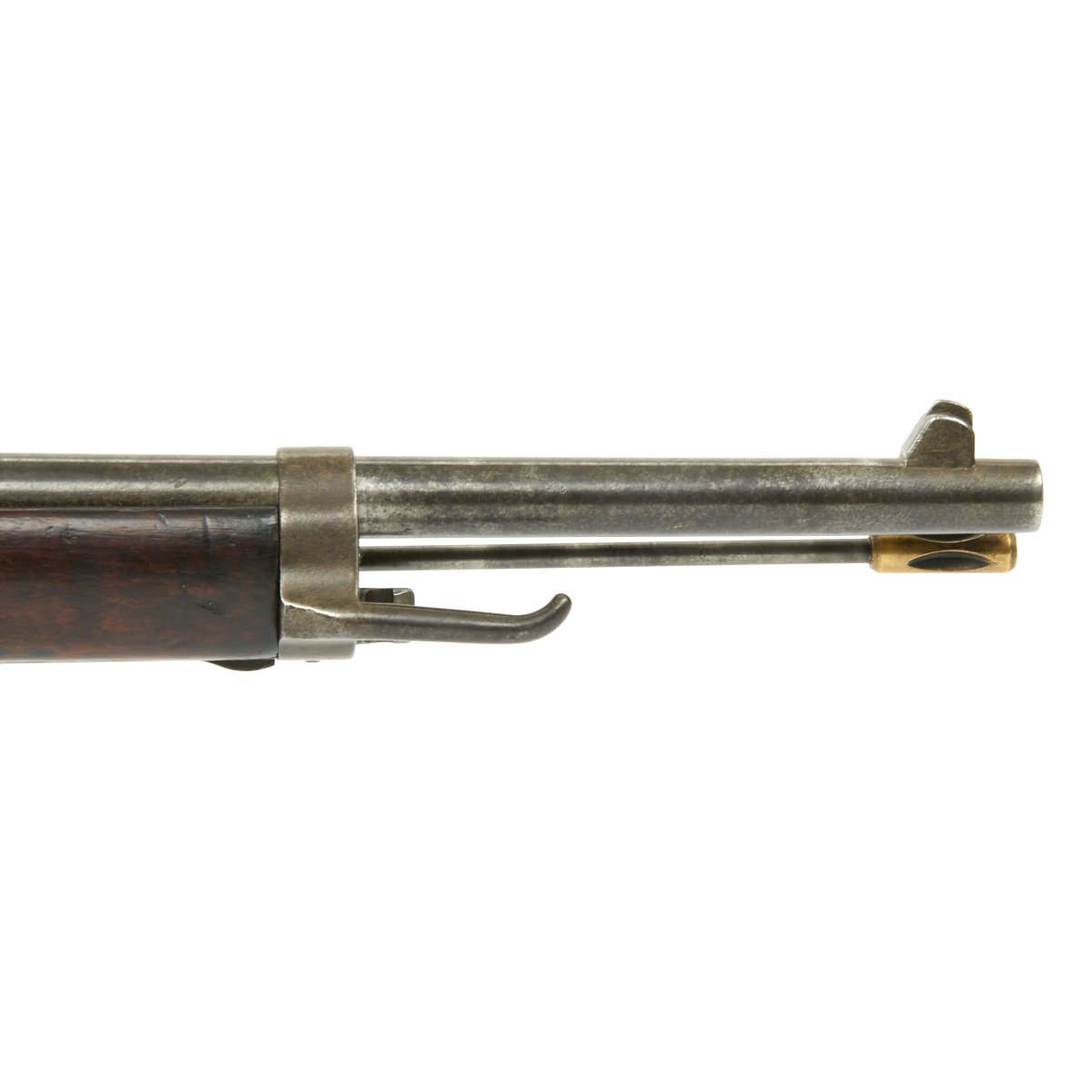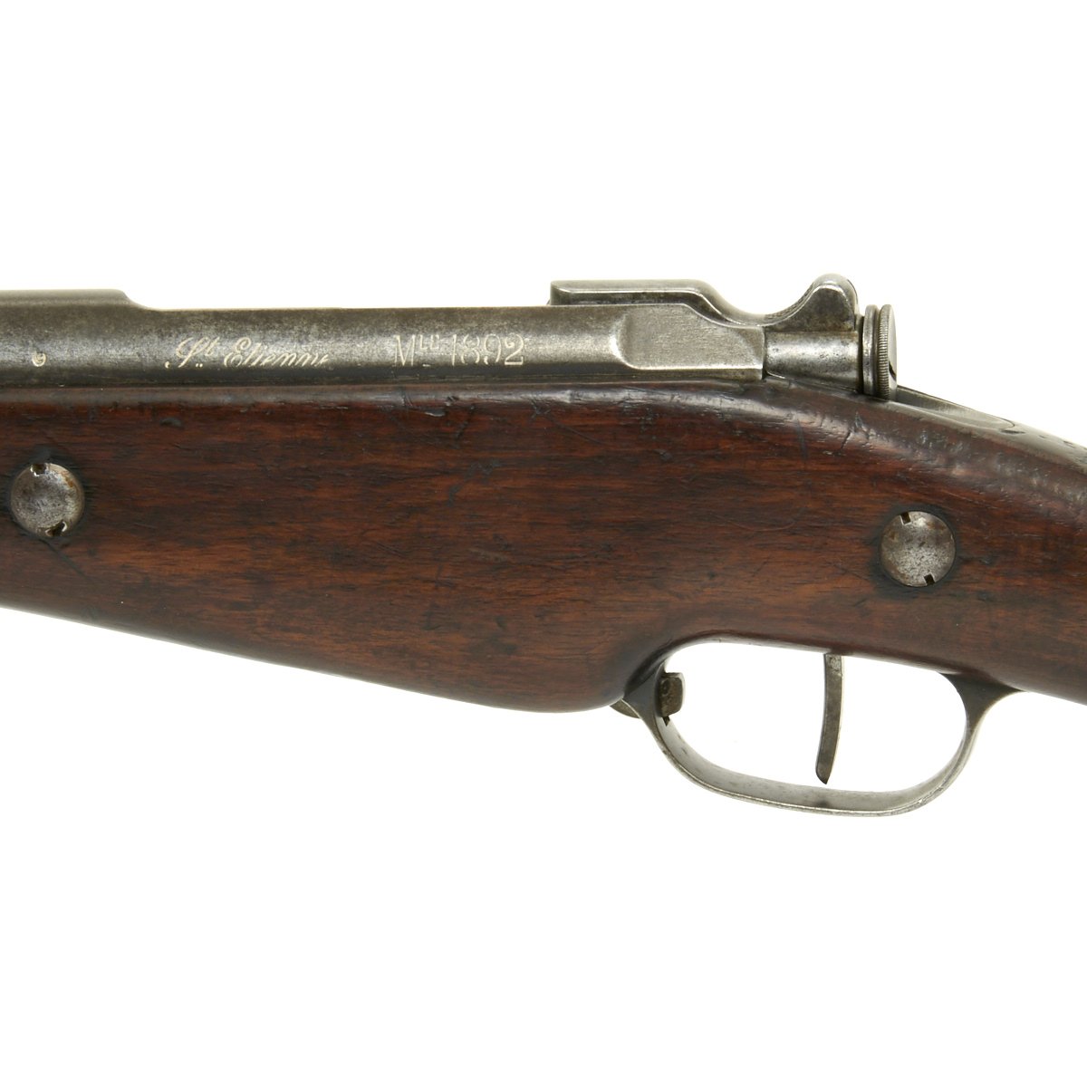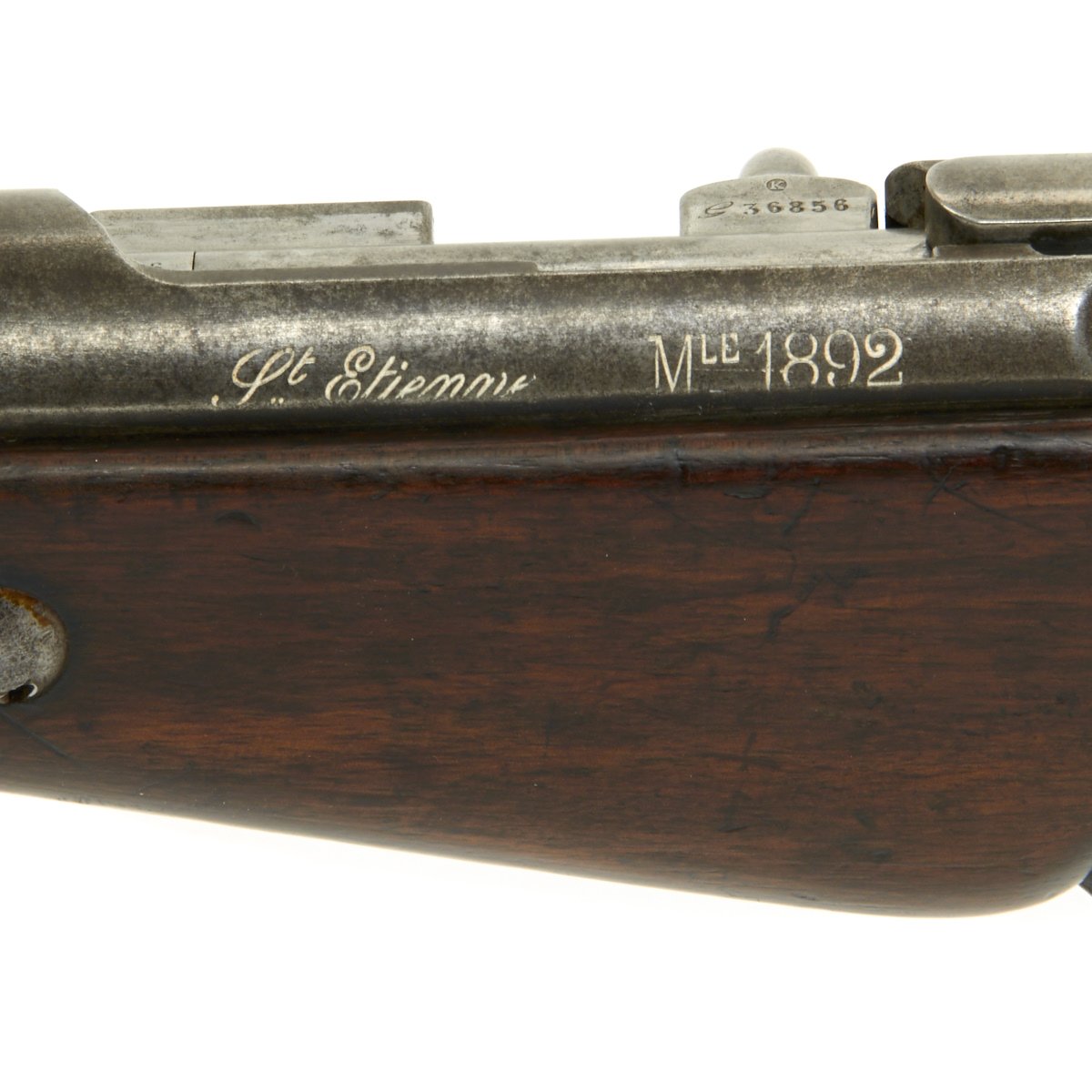 This is a fine example of the Mle 1982 "Musketoon" artillery carbine, with an very nice condition bore. It has clear lands and grooves, with a mostly bright finish. The receiver is marked St. Etiénne MLE1892, indicating manufacture at the Government Arsenal at Saint-Étienne. From this time forward the arsenal began to be known by the abbreviation MAS, for Manufacture de Armes St. Etienne. The rifle has an issue date stamped into the barrel of MA S 1894. It comes with all original steel mounts and correct brass-tipped cleaning rod. Most fittings bear the correct government proof marks, though some are worn. Overall metal finish is a nice worn gray, typical for a rifle that had a long service life.