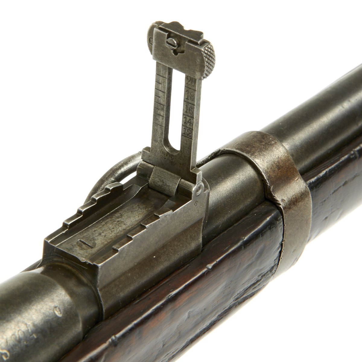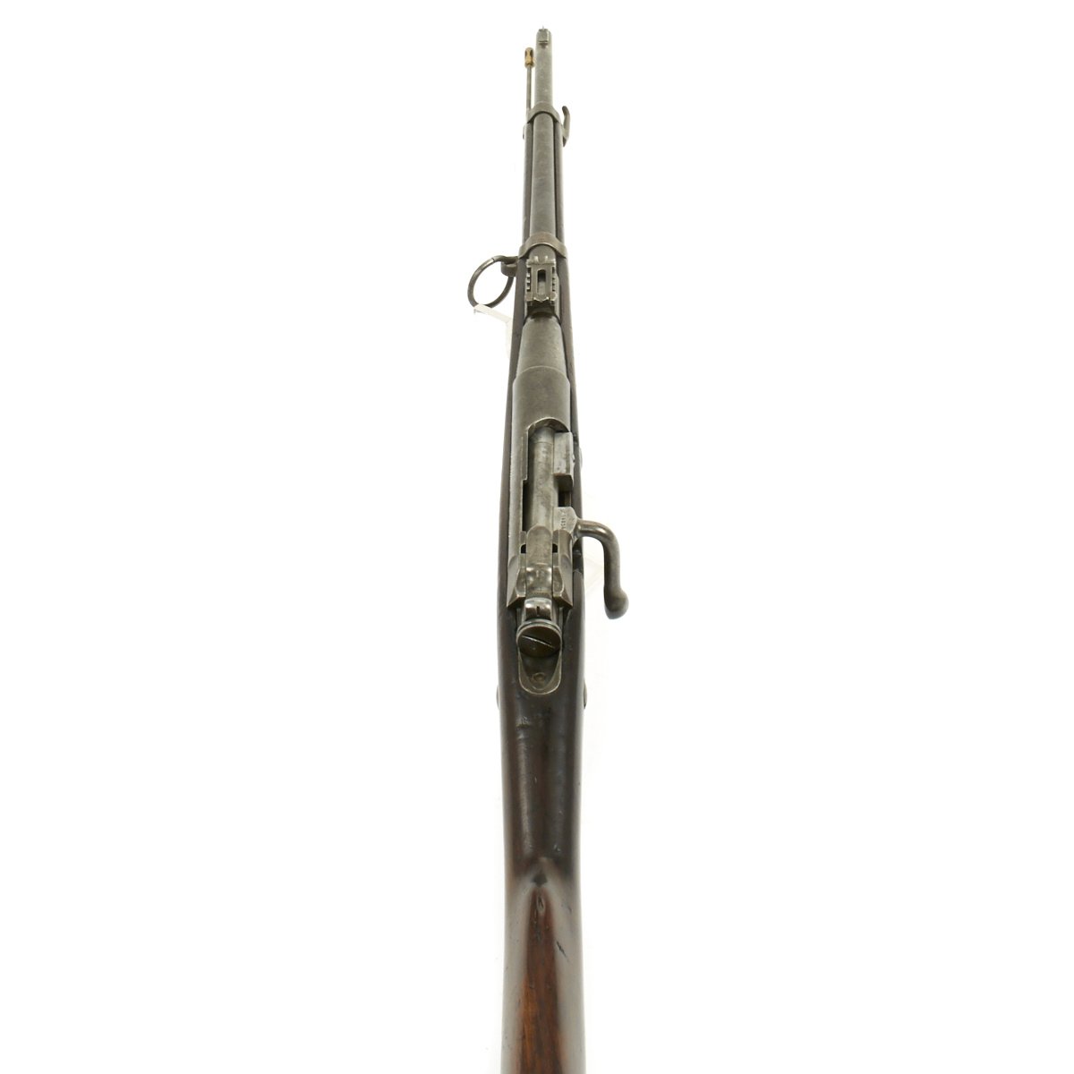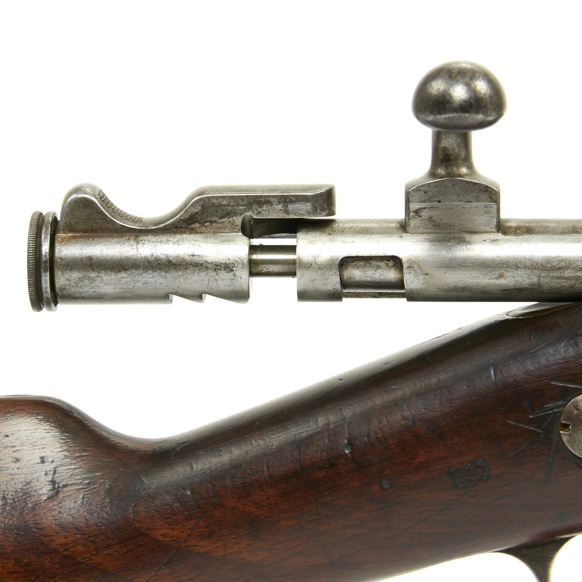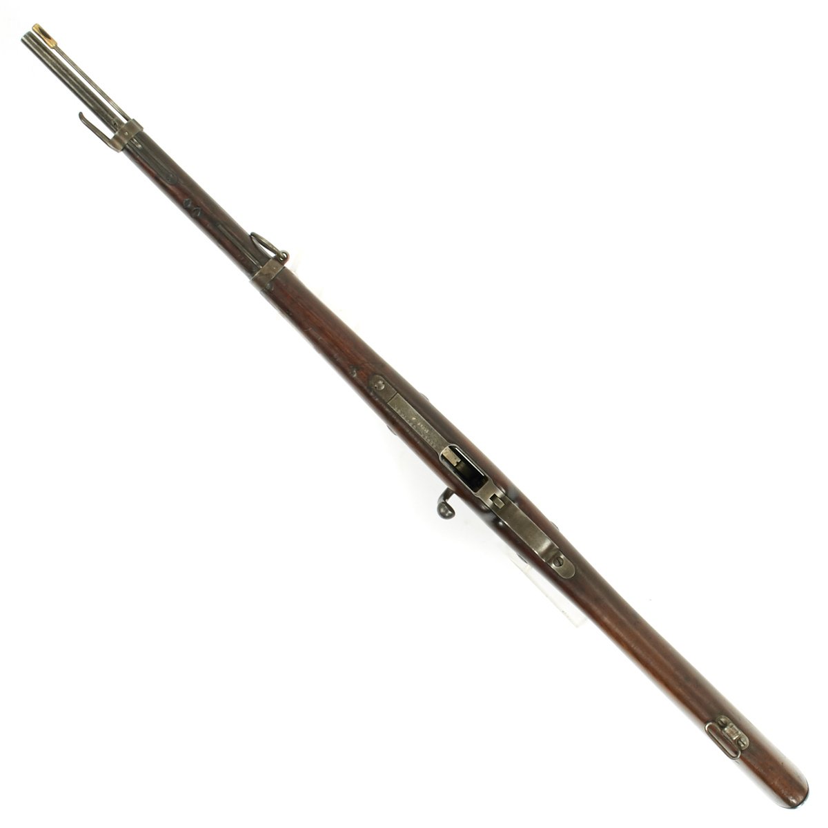 This is a fine example of the Mle 1982 "Musketoon" artillery carbine, with an very nice condition bore. It has clear lands and grooves, with a mostly bright finish. The receiver is marked St. Etiénne MLE1892, indicating manufacture at the Government Arsenal at Saint-Étienne. From this time forward the arsenal began to be known by the abbreviation MAS, for Manufacture de Armes St. Etienne. The rifle has an issue date stamped into the barrel of MA S 1894. It comes with all original steel mounts and correct brass-tipped cleaning rod. Most fittings bear the correct government proof marks, though some are worn. Overall metal finish is a nice worn gray, typical for a rifle that had a long service life.
