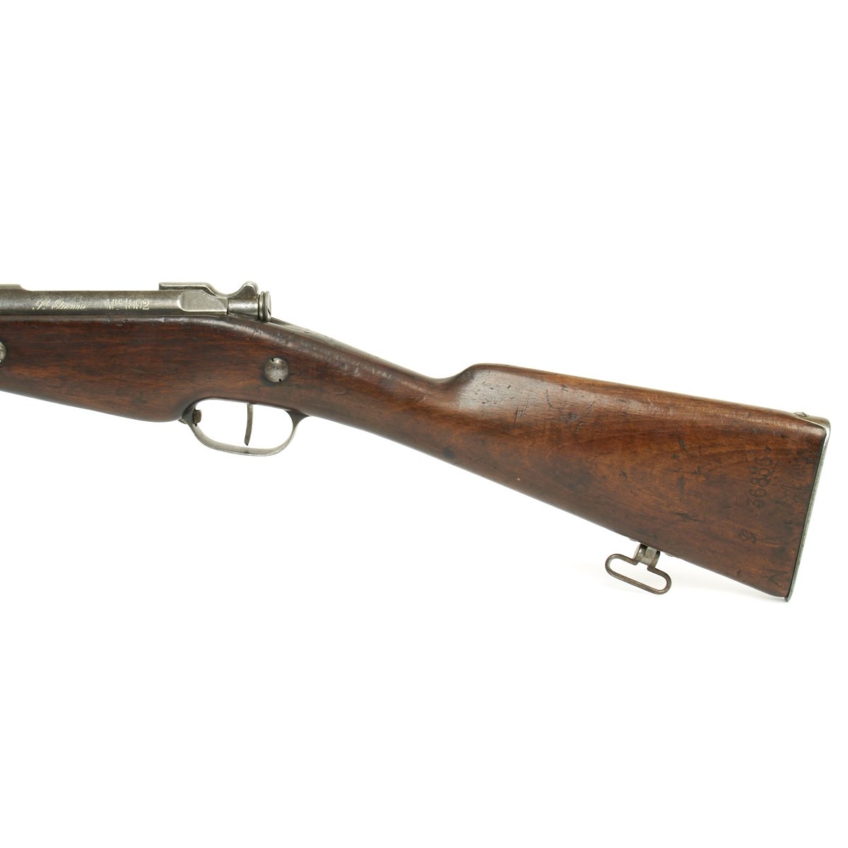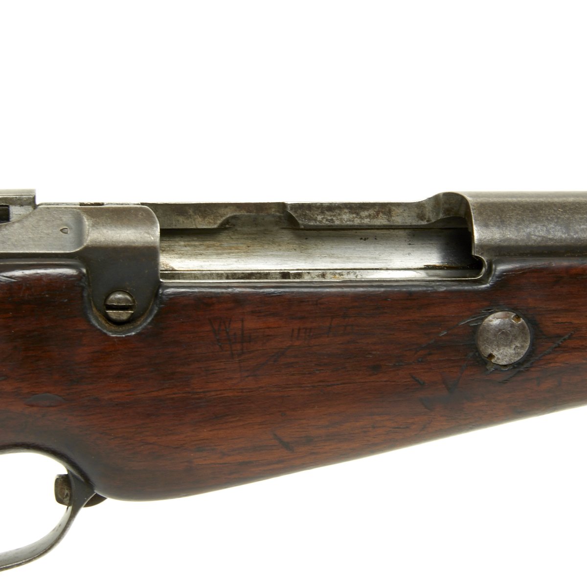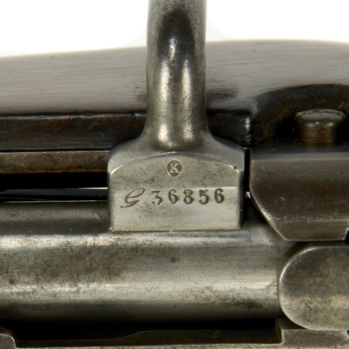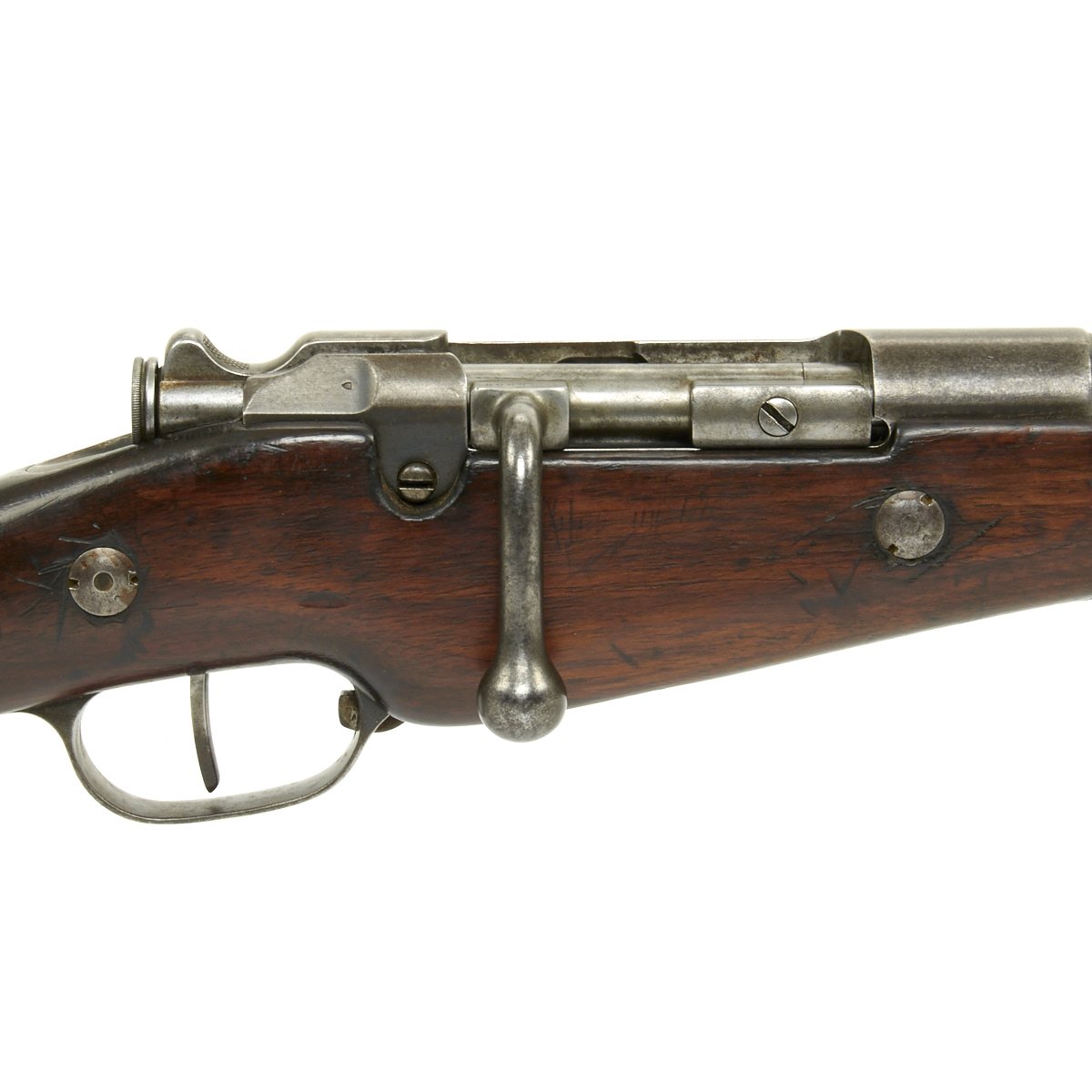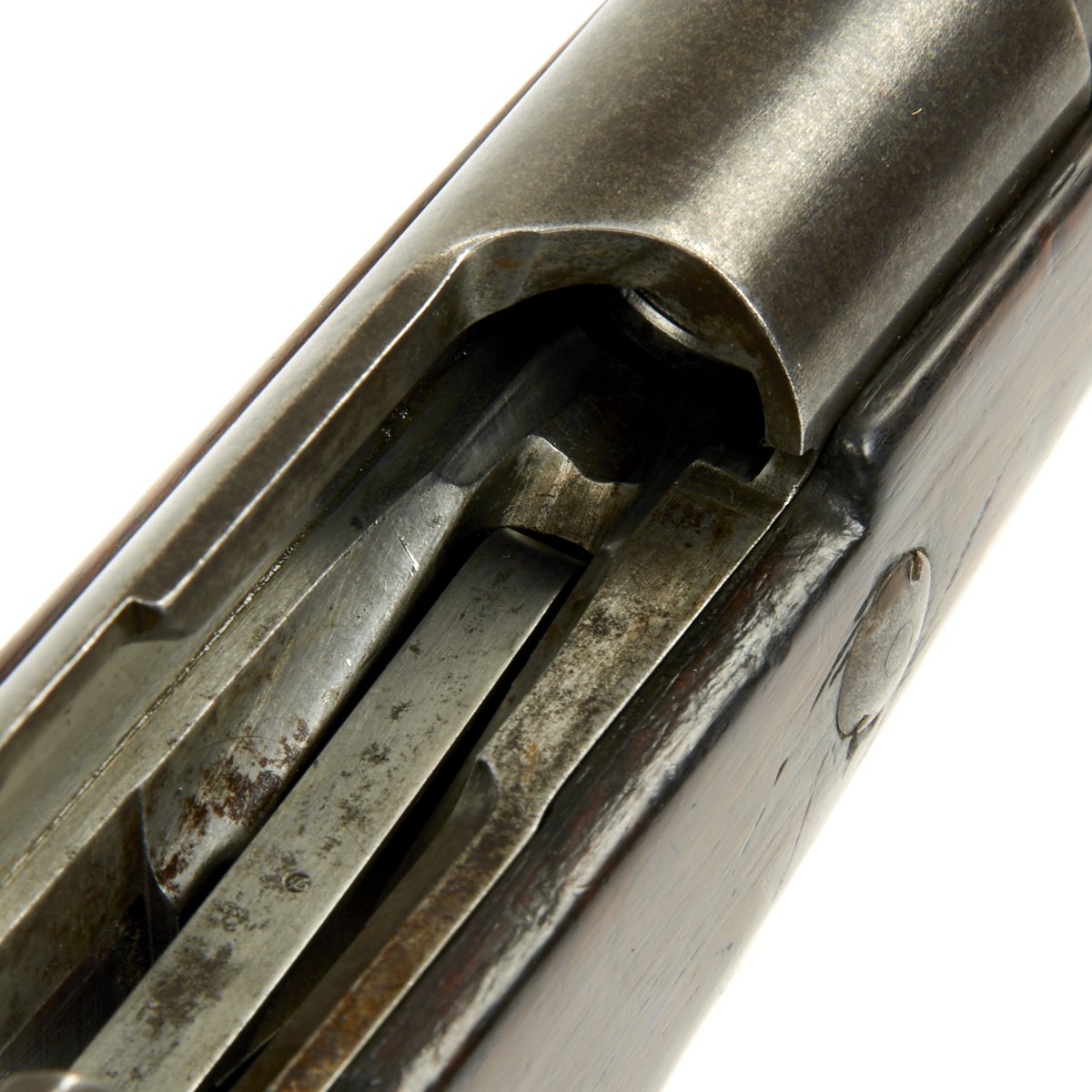 This is a fine example of the Mle 1982 "Musketoon" artillery carbine, with an very nice condition bore. It has clear lands and grooves, with a mostly bright finish. The receiver is marked St. Etiénne MLE1892, indicating manufacture at the Government Arsenal at Saint-Étienne. From this time forward the arsenal began to be known by the abbreviation MAS, for Manufacture de Armes St. Etienne. The rifle has an issue date stamped into the barrel of MA S 1894. It comes with all original steel mounts and correct brass-tipped cleaning rod. Most fittings bear the correct government proof marks, though some are worn. Overall metal finish is a nice worn gray, typical for a rifle that had a long service life.