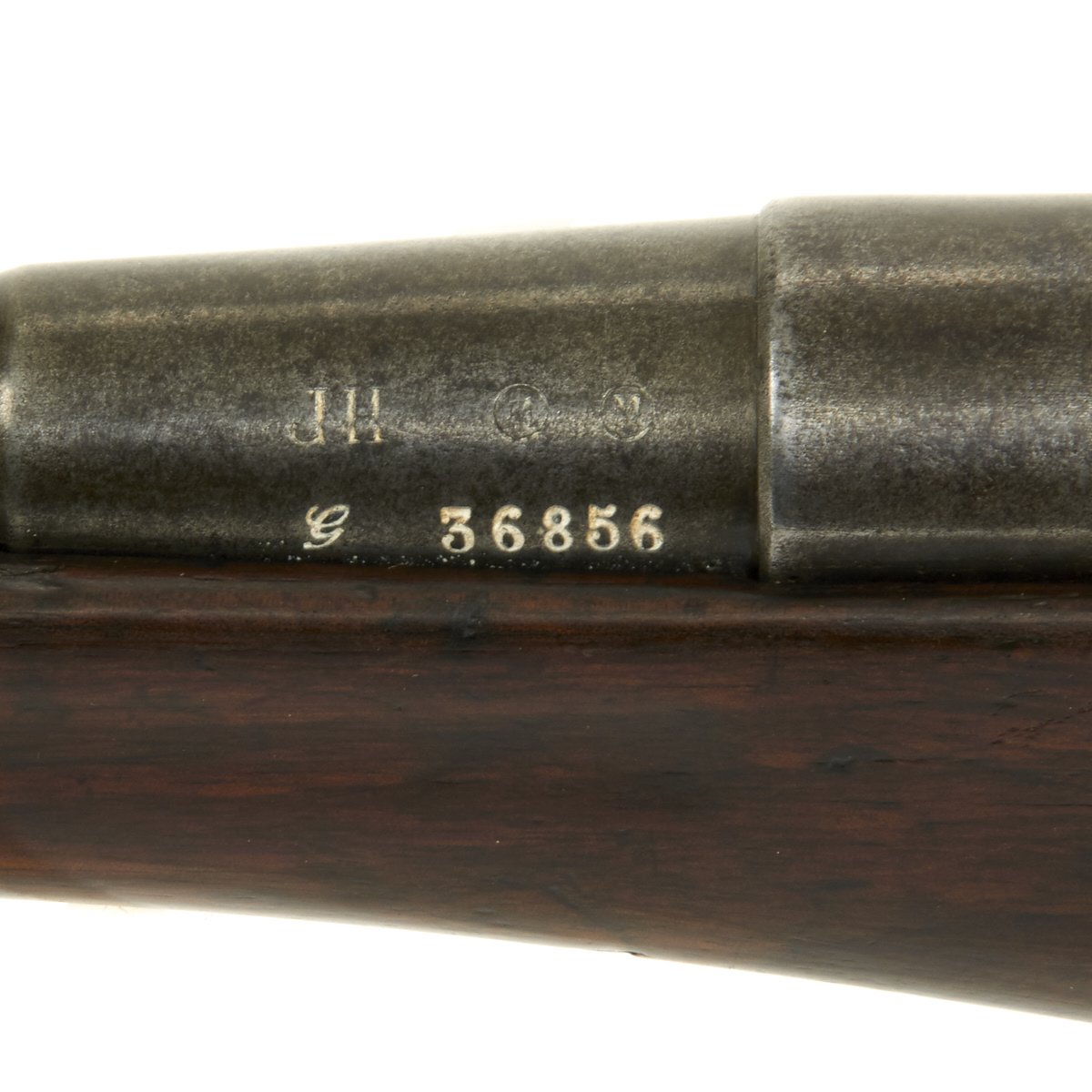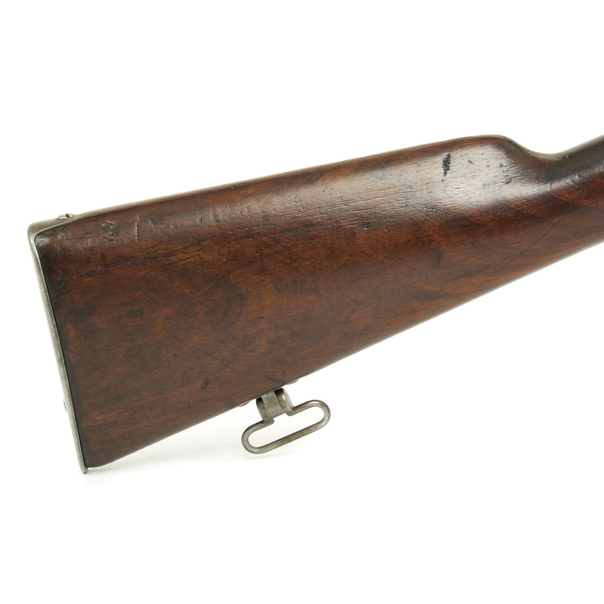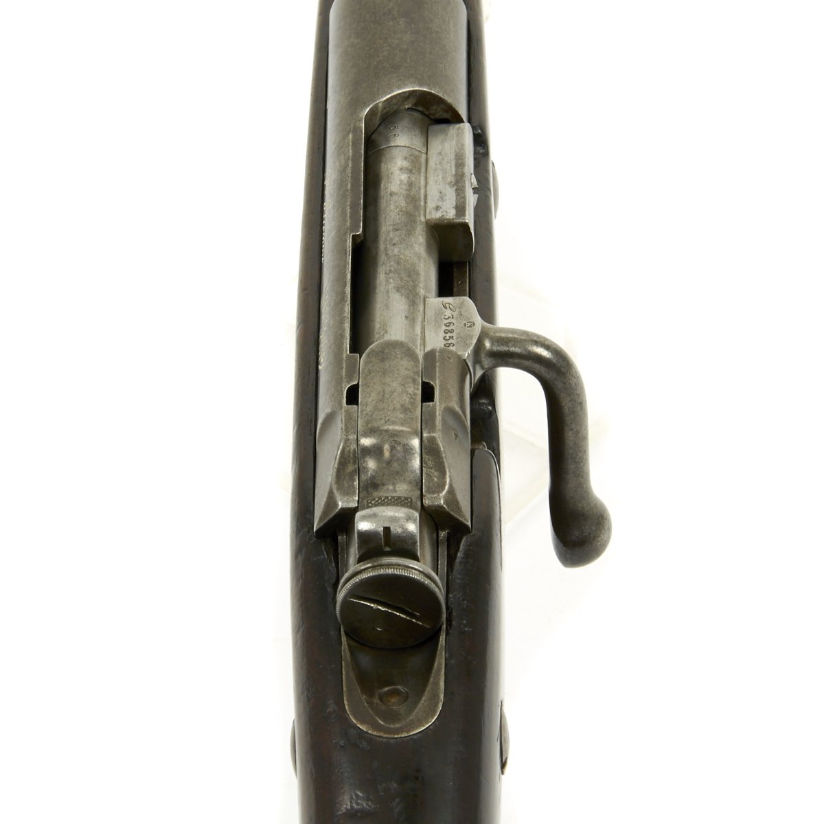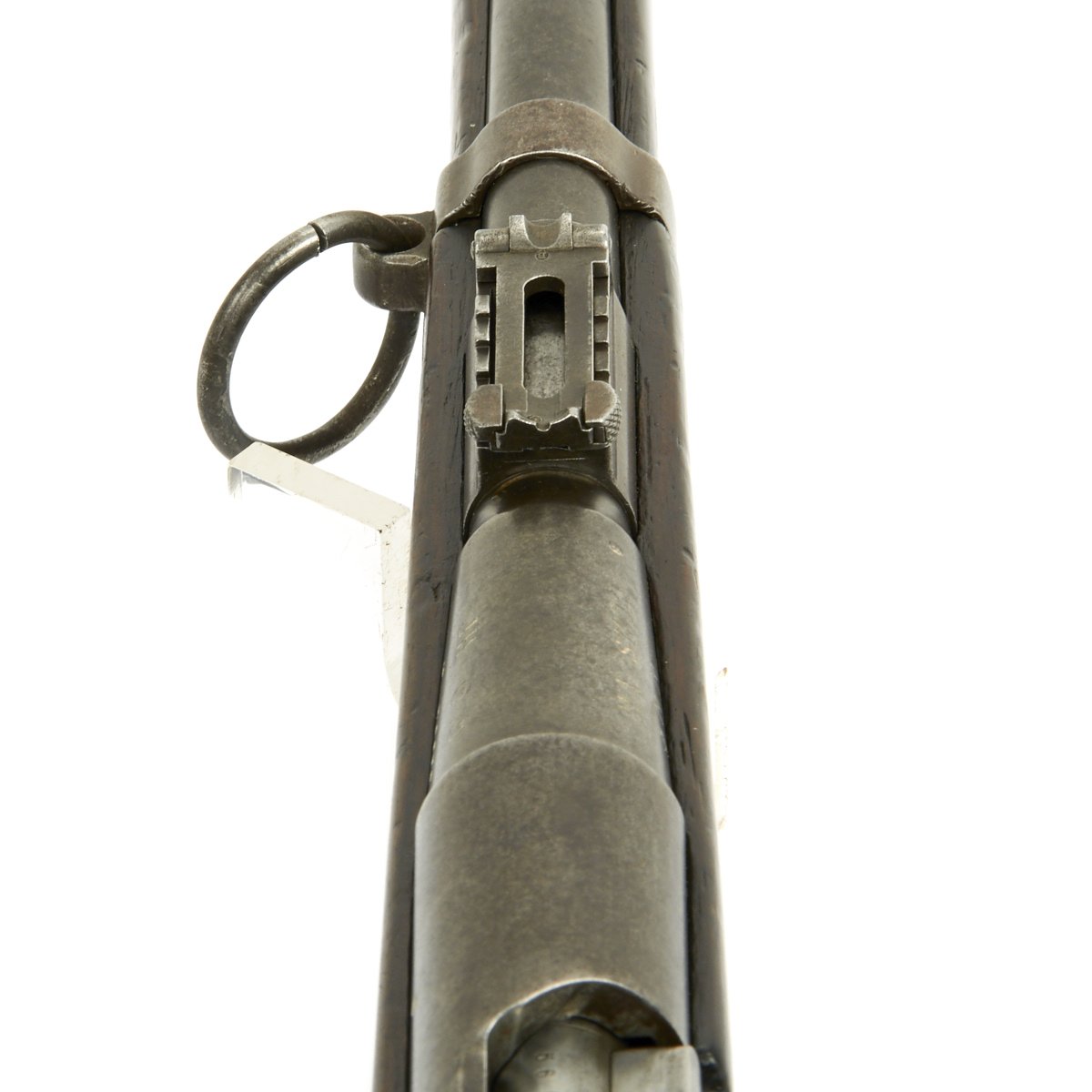 This is a fine example of the Mle 1982 "Musketoon" artillery carbine, with an very nice condition bore. It has clear lands and grooves, with a mostly bright finish. The receiver is marked St. Etiénne MLE1892, indicating manufacture at the Government Arsenal at Saint-Étienne. From this time forward the arsenal began to be known by the abbreviation MAS, for Manufacture de Armes St. Etienne. The rifle has an issue date stamped into the barrel of MA S 1894. It comes with all original steel mounts and correct brass-tipped cleaning rod. Most fittings bear the correct government proof marks, though some are worn. Overall metal finish is a nice worn gray, typical for a rifle that had a long service life.