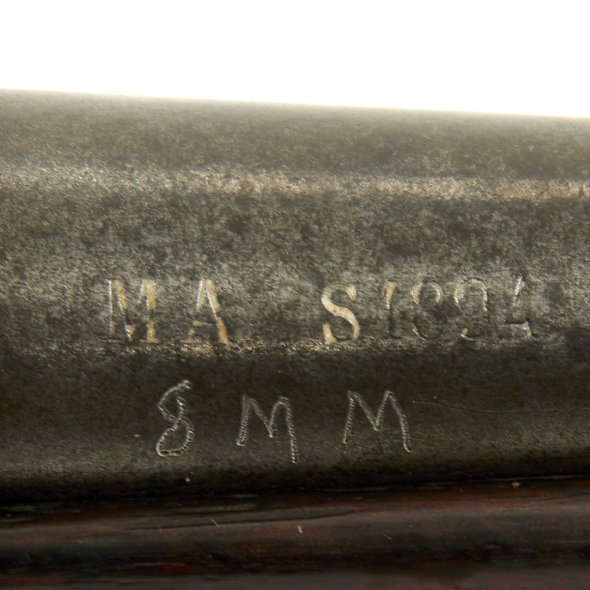 The serial number marked on the side of the chamber is C 36856, which matches the number on the stock, bolt body, bolt head, and magazine floor plate/trigger guard. This rifle does not appear to have had any parts replaced, as far as we can tell. There are some markings added with an electric pen, such as 8MM next to the date, and a name on the magazine floor plate. It also still retains the large "saddle ring" a holdover from the cavalry model, and used to secure the weapon, sometimes with a sling, as the carbine still had a butt stock swivel.