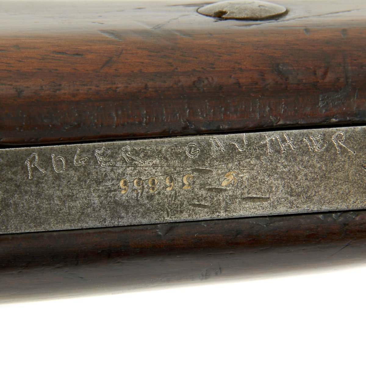 The stock is in good condition, though it does appear to have been sanded and refinished. There are also some gouges on the front right forestock, and overall it has seen a lot of use. It has traces of the usual round cartouche on the right side of the butt stock, however it is very faint, so it is not legible at all. Great color and an excellent finish overall.