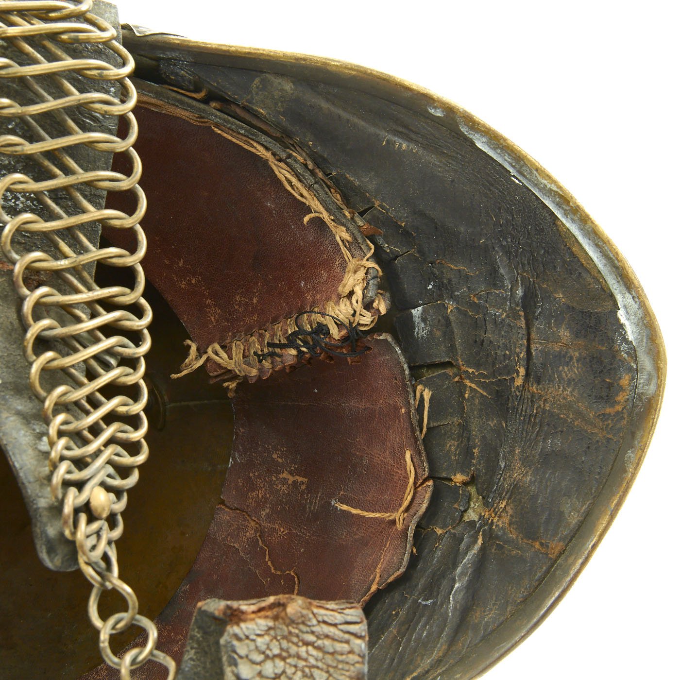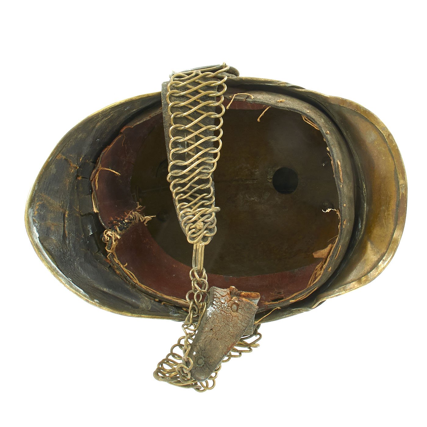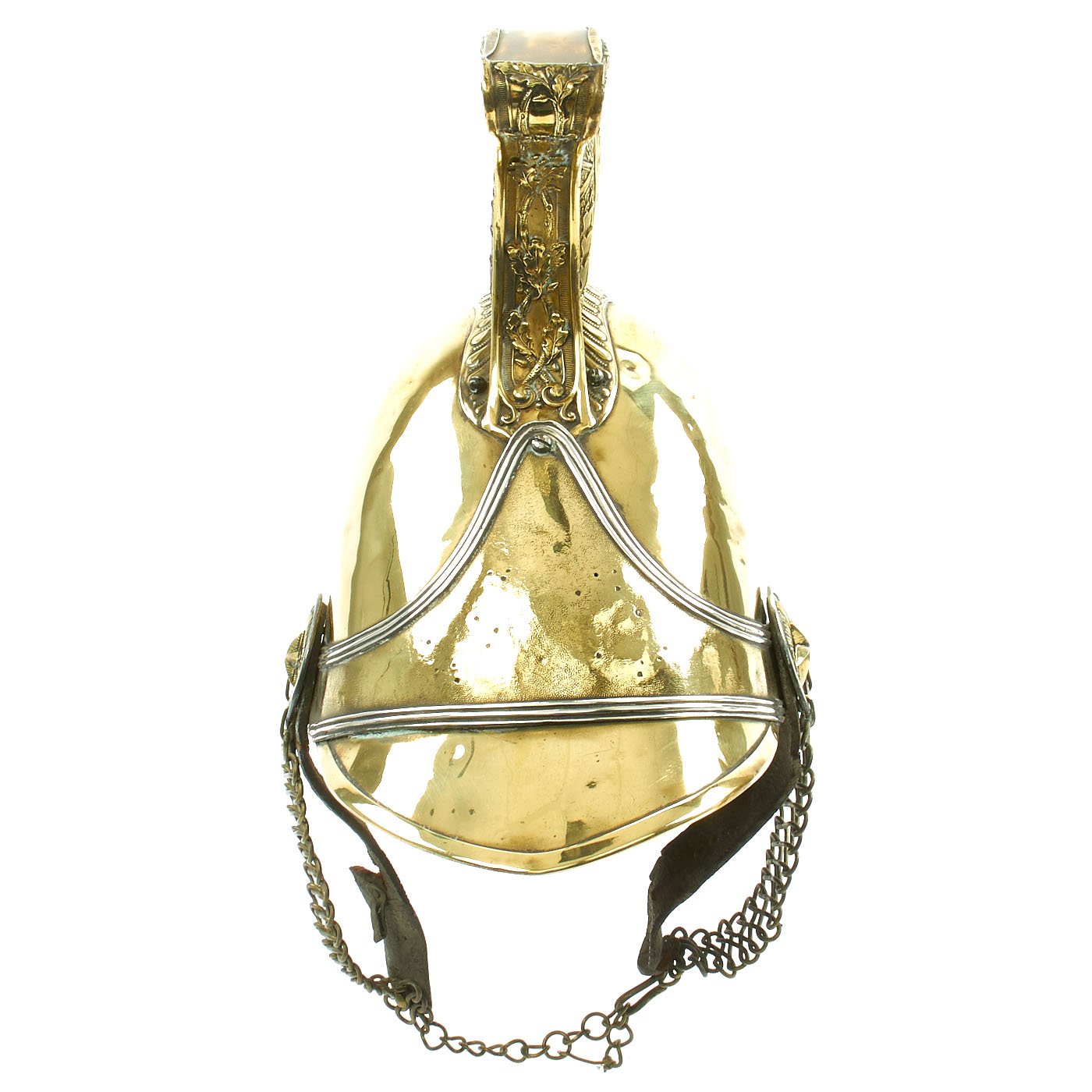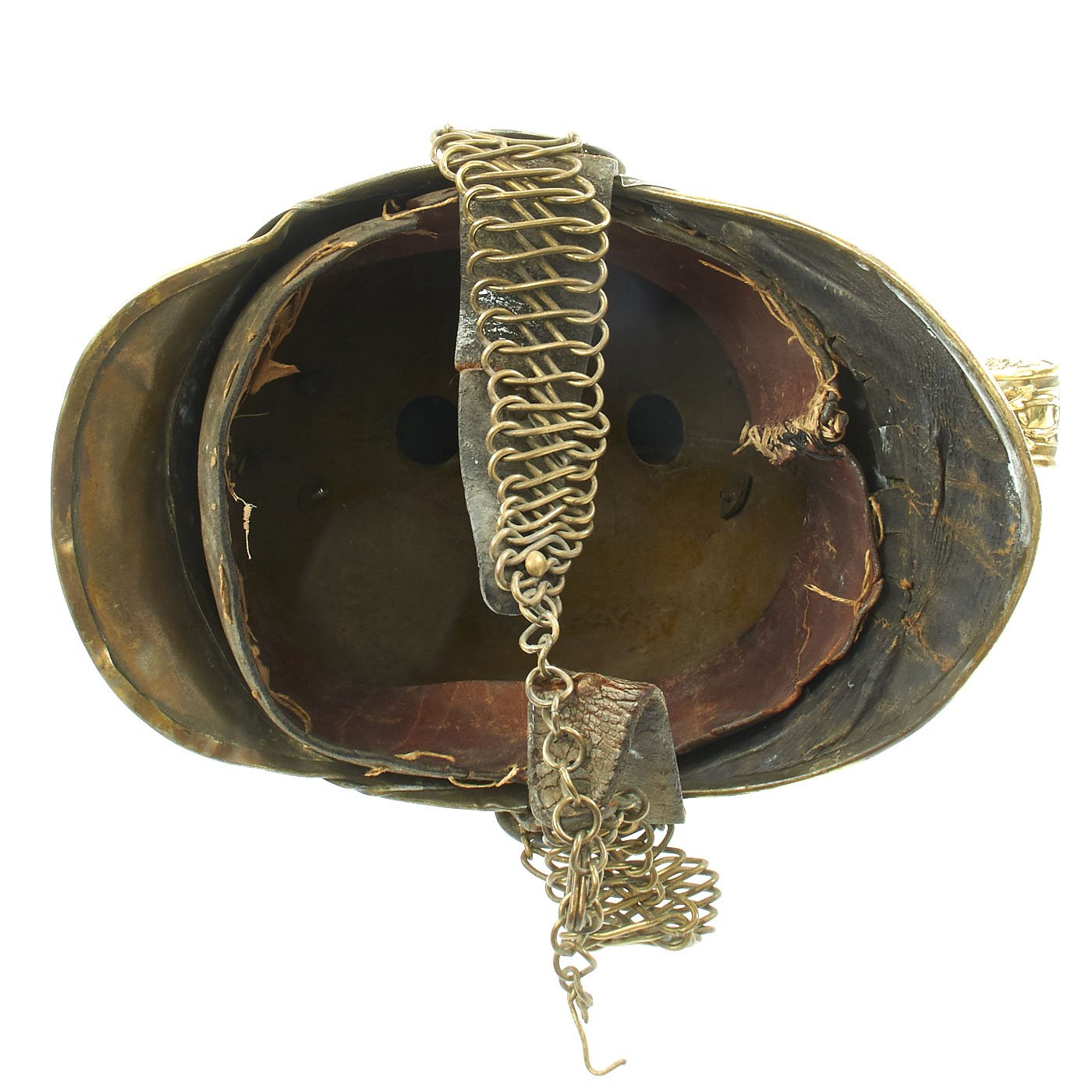 The helmet retains part of its original leather liner/sweat band and still comes complete with is intertwined brass wire chin scales mounted on their leather backing. The original Comb is still in place fully embossed with its original floral decorations. A striking helmet even today, original and ready to display!
