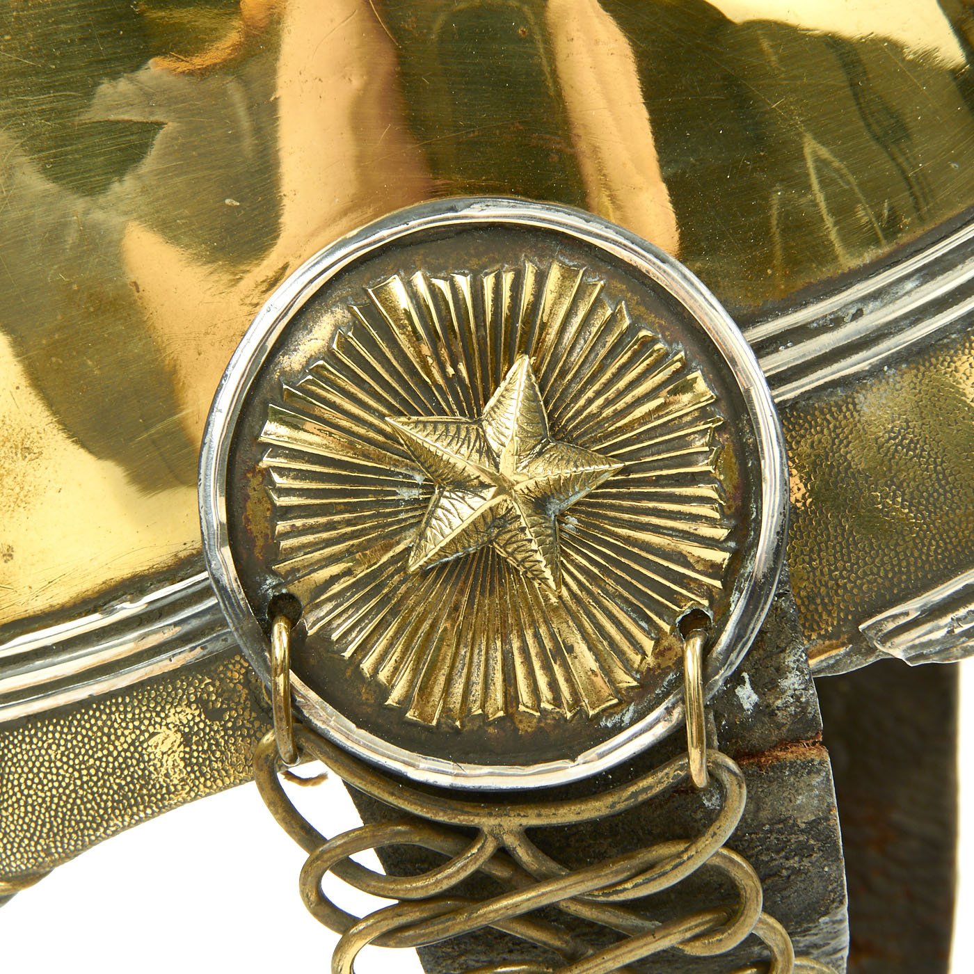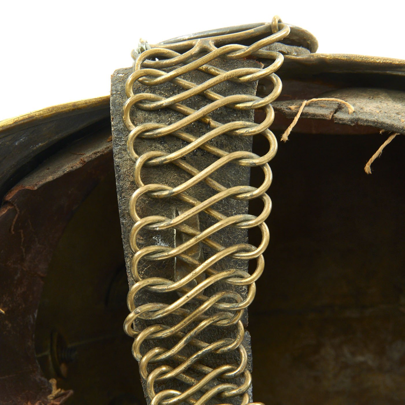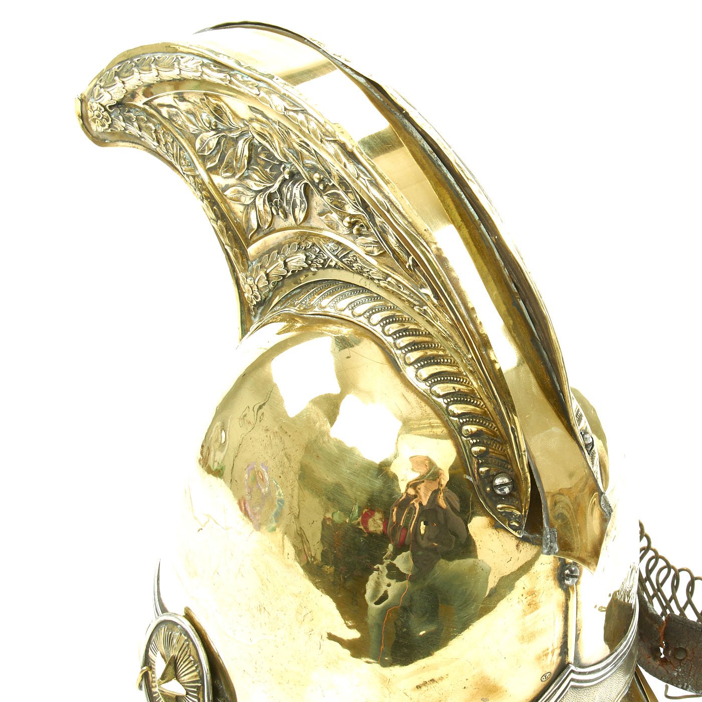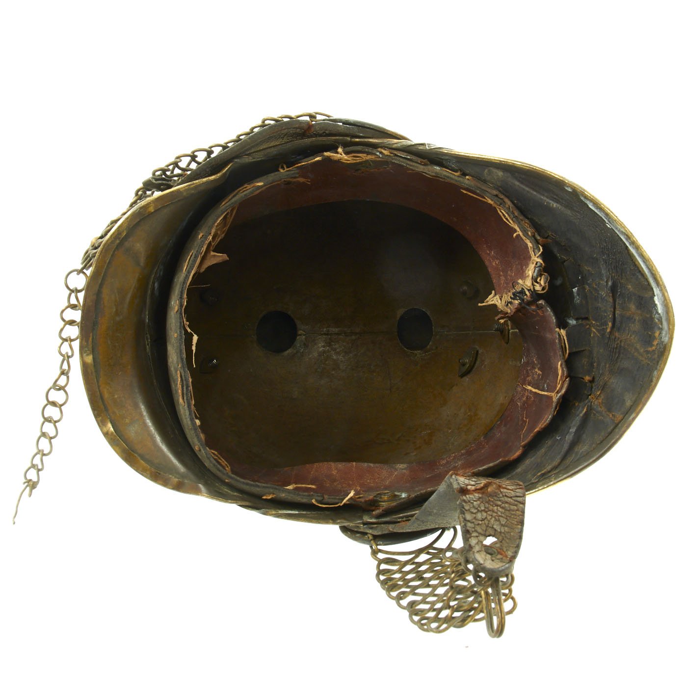 The helmet retains part of its original leather liner/sweat band and still comes complete with is intertwined brass wire chin scales mounted on their leather backing. The original Comb is still in place fully embossed with its original floral decorations. A striking helmet even today, original and ready to display!