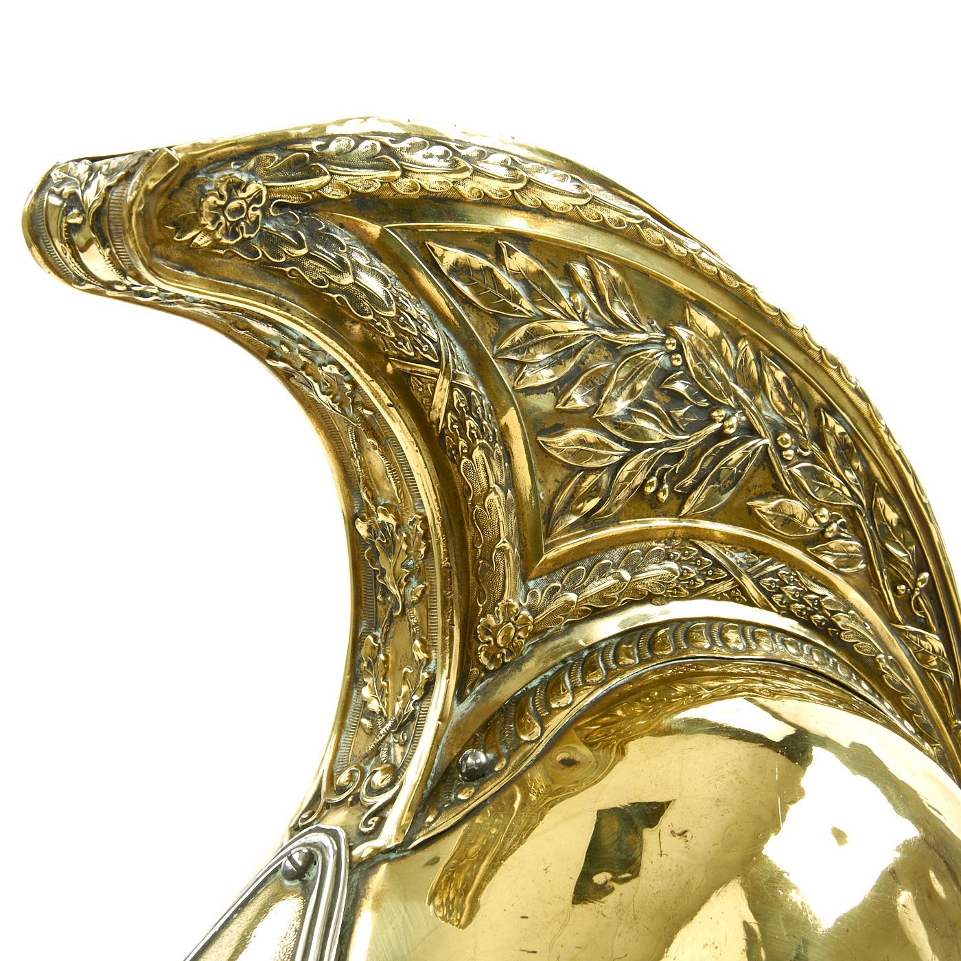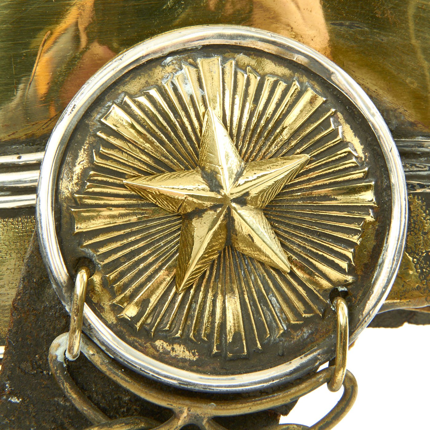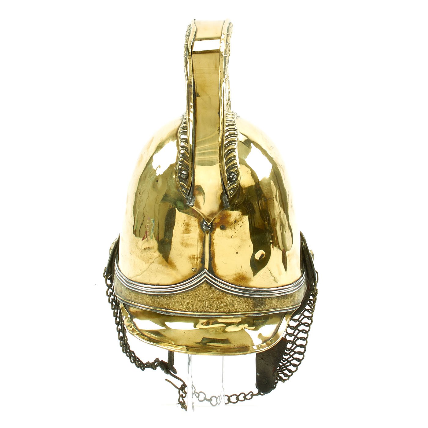 Original Item: Only One Available. If only this had not been re-purposed! Here is an original French Napolenic Carabinier (Rifleman) brass Cavalry Helmet, that after the end of the Napoleonic Wars in 1815 was de-Napoleonized by having the large "N" removed from the face plate. It originally came with a very large Polar Bear Skin dyed red top crest that very attractively terminated to the front in what appeared to be a suspended ball of fur. This red fitting was also removed when the helmet was re-issued in the later 1800's for use by Pompier (Firemen) of the French Fire Departments.