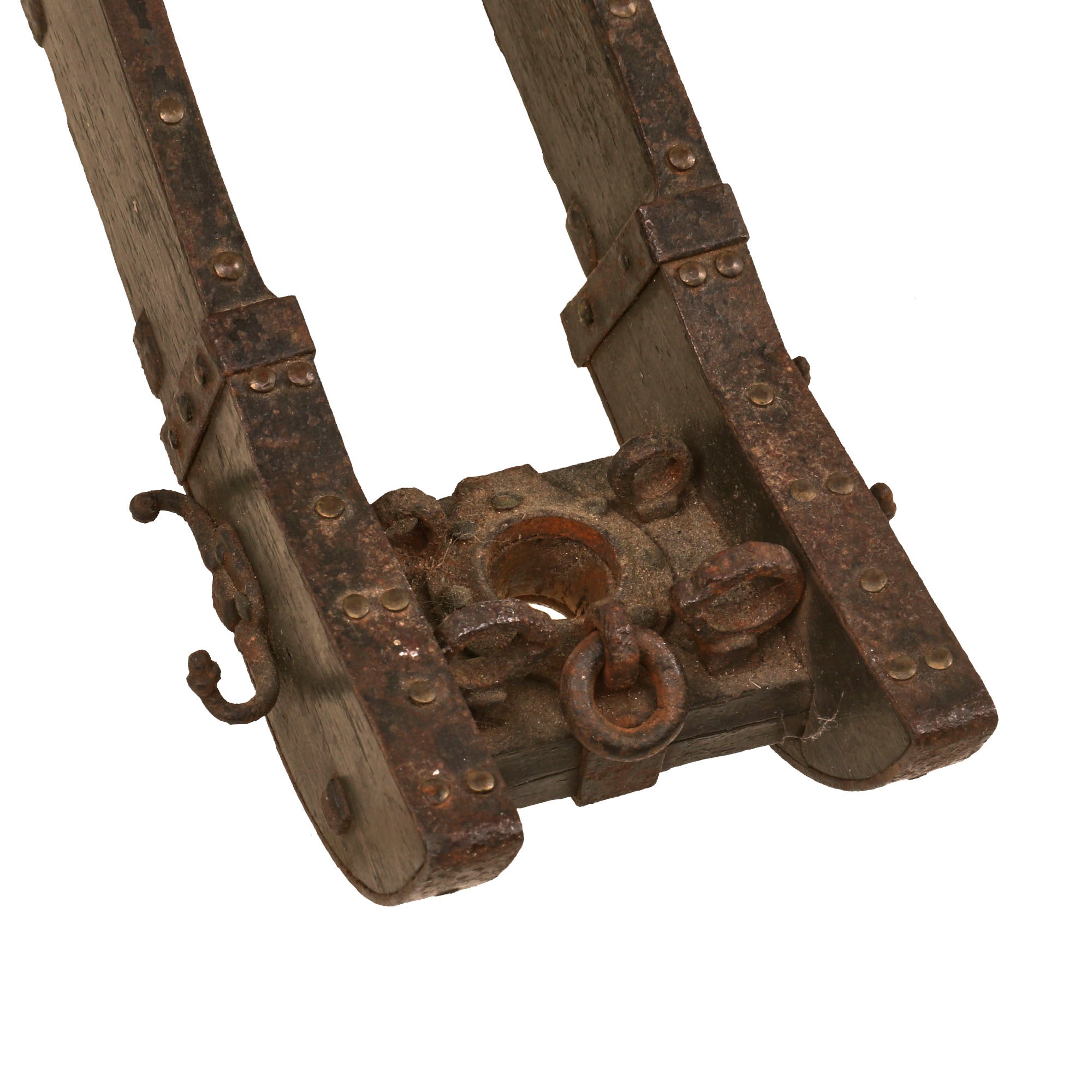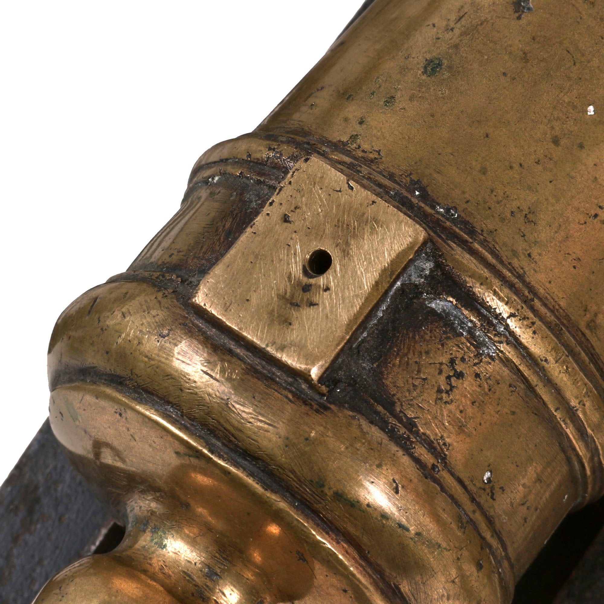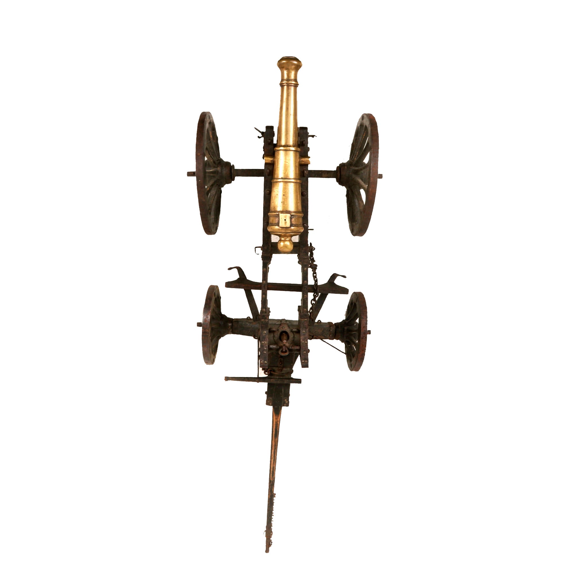 The cannon barrel is cast bronze, just like a real cannon, and is still “functional” with a small touch hole at the back end for firing, although it’s certainly meant to just make a nice puff of smoke, not to launch actual projectiles with any degree of accuracy. The cannon comes complete on its gun carriage, however the pieces that would allow the cannon to be fastened to the carriage are gone, so the barrel just sits on the carriage for display. The elevation screw is still intact and allows the changing of the cannon’s angle.