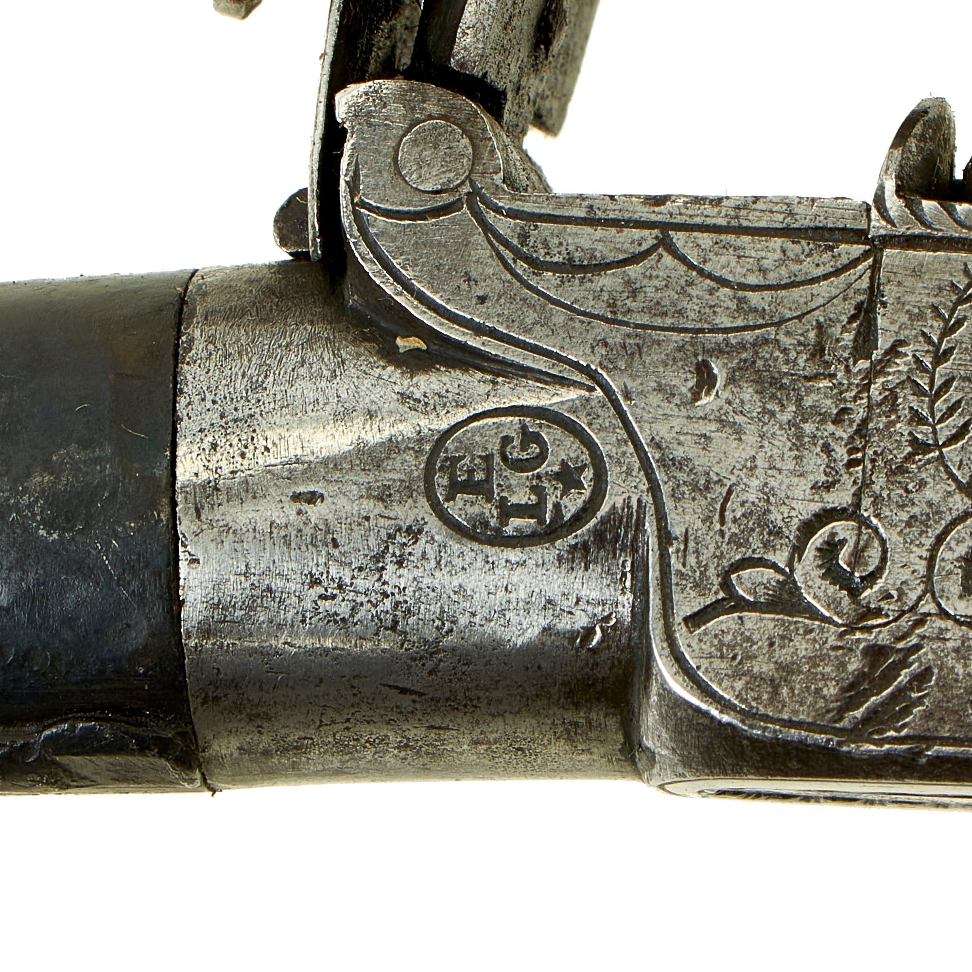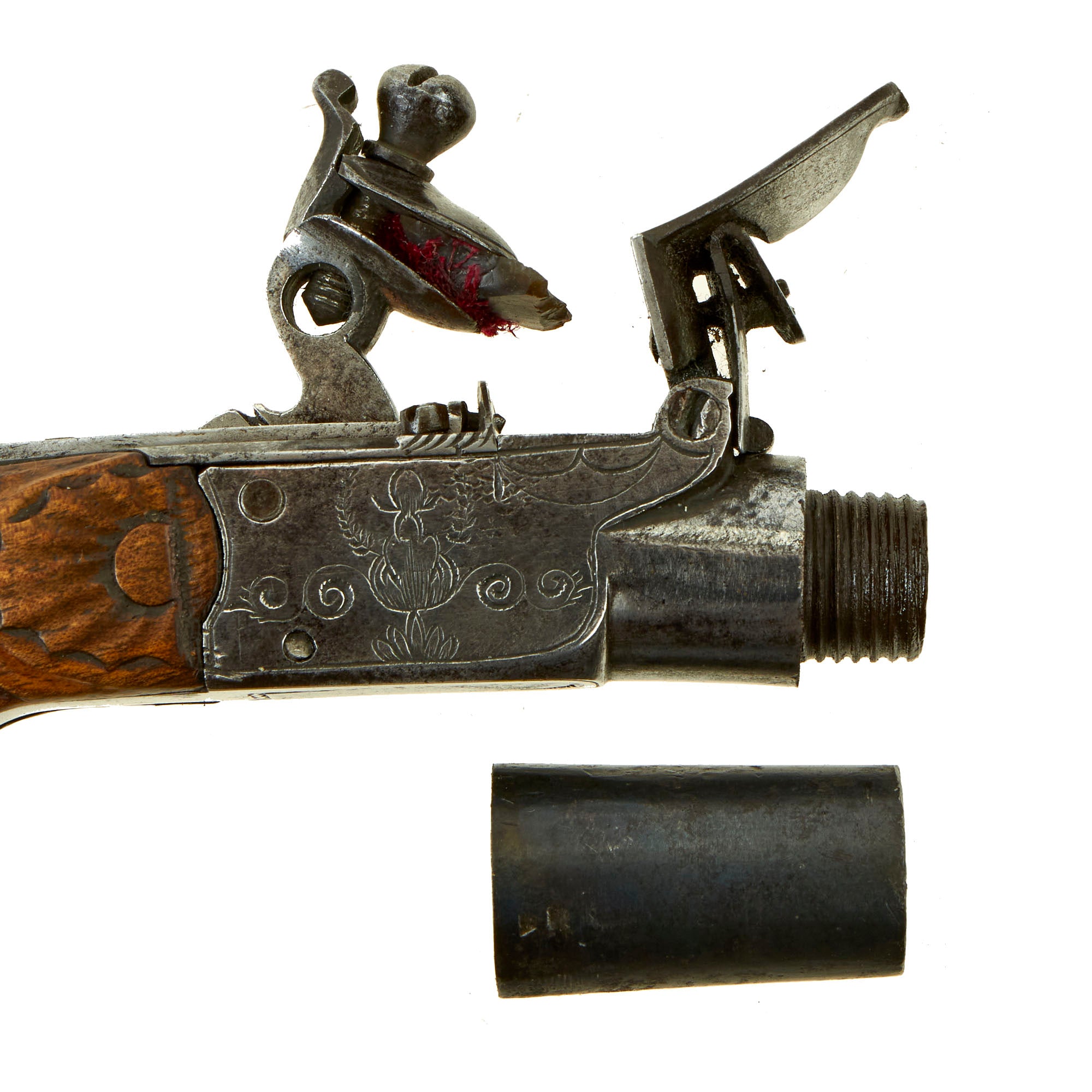 This is a truly charming small Flintlock Pocket Pistol with an overall length of 5 3/4", featuring a lovely engraved box frame and checkered "bag" grip. There is no maker name listed on the pistol, just the E / L G / * in an oval proof of Liège on the left side of the frame under the frizzen pivot. The pistol features a fold away trigger that only appears once the hammer is cocked, and has a turn off 1 3/8" barrel with a smooth bore of approximately 0.48". It also features a safety on the cock, which also locks the frizzen closed over the pan, though it requires adjustment due to wear, as it does not correctly hold the hammer in place.