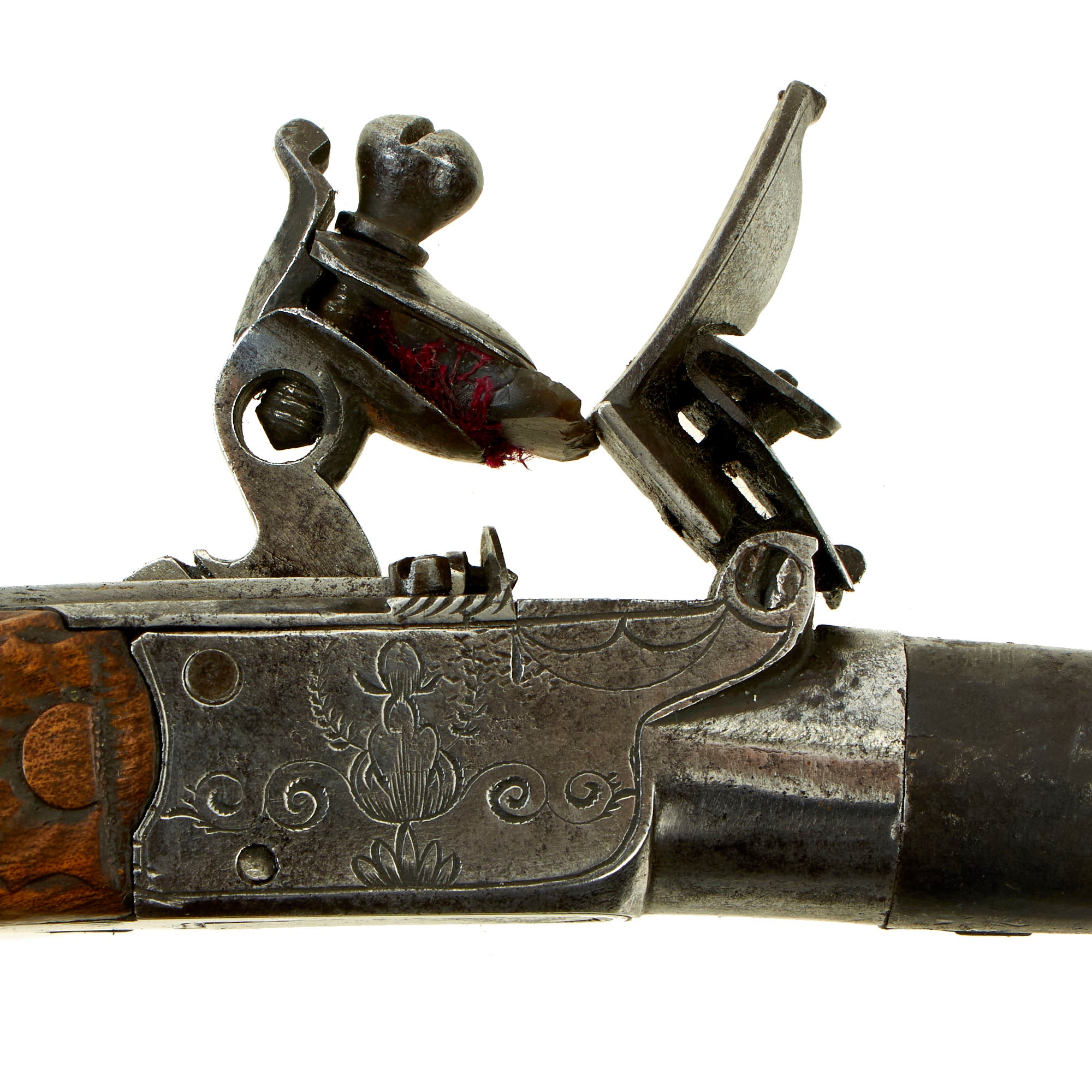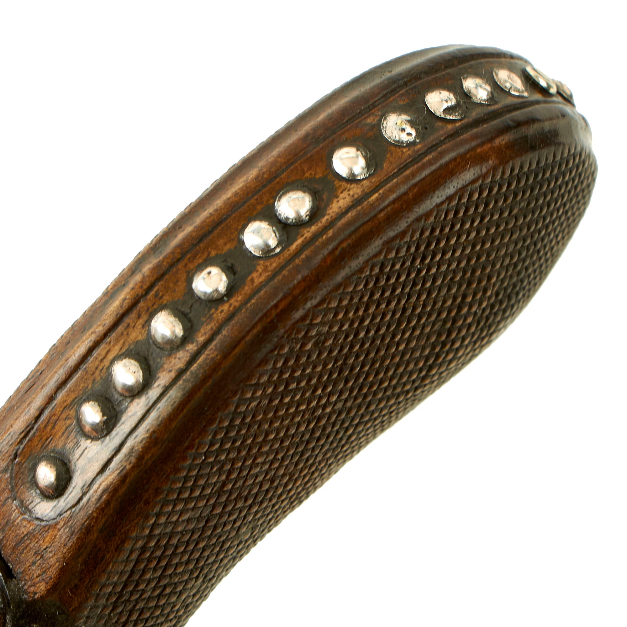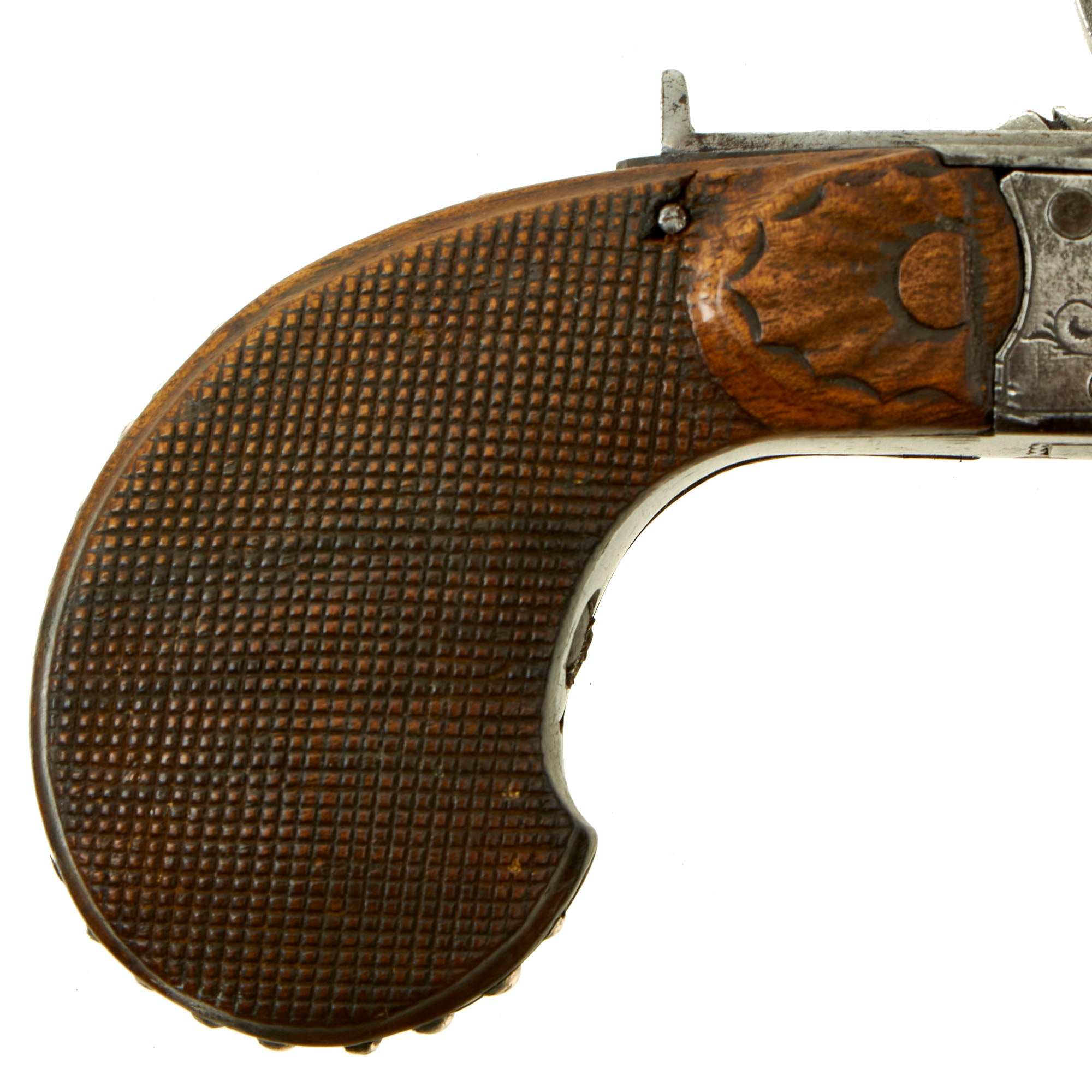 The action works well, and as there is a half cock safety, the tumbler has no half cock position. The trigger folds out correctly, though it does need to be manually returned to the closed position. We are not sure if this is the way it was designed, or if there is a spring missing. The checkered wooden "bag" grip is lovely, with some carved designs near the receiver, and it also features 21 silver studs around the edge.