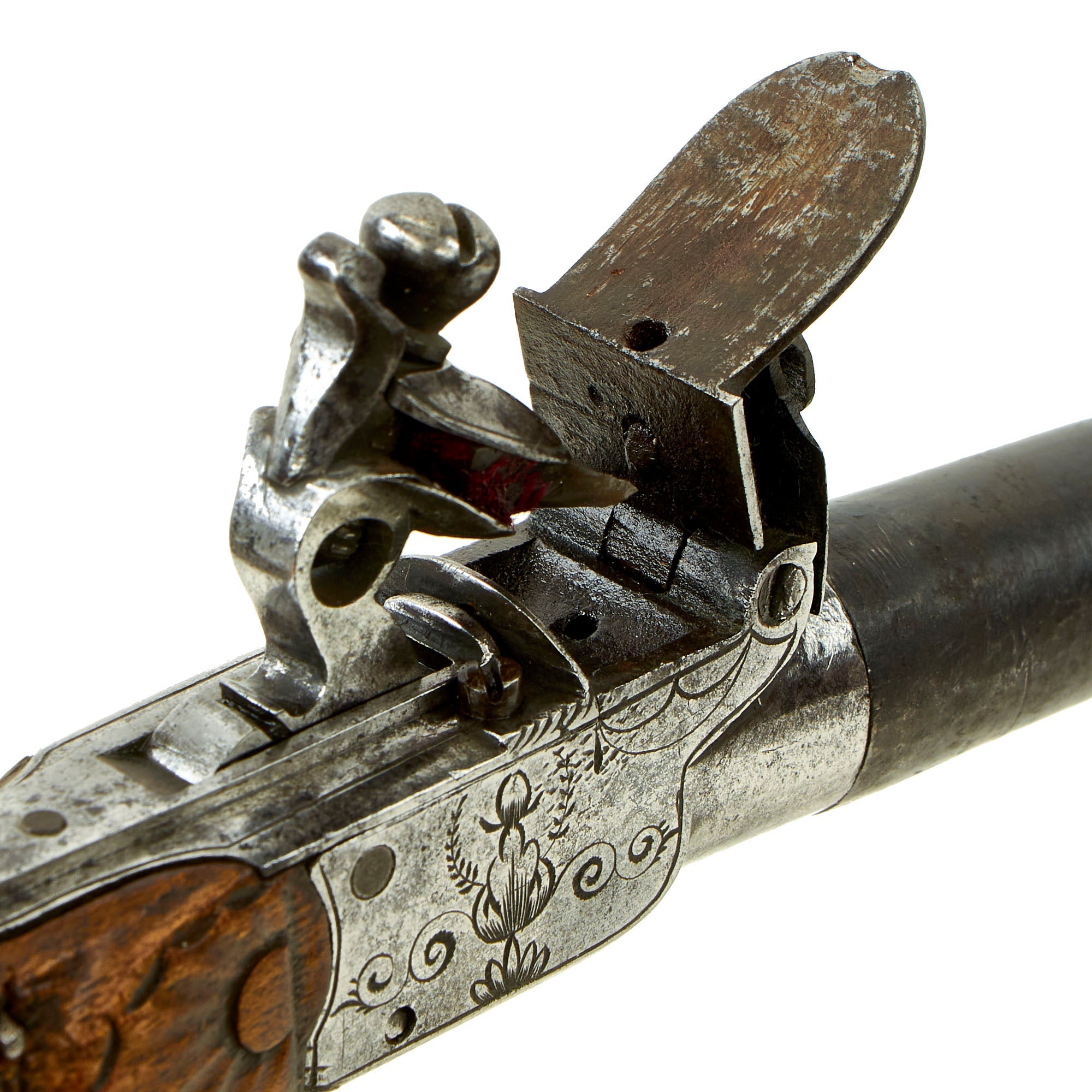 This flintlock pistol is from the early Napoleonic period during the late 18th century, when Liège was still firmly under French control. This city was a gunmaking powerhouse, which would later manufacture guns for countries all over the world.