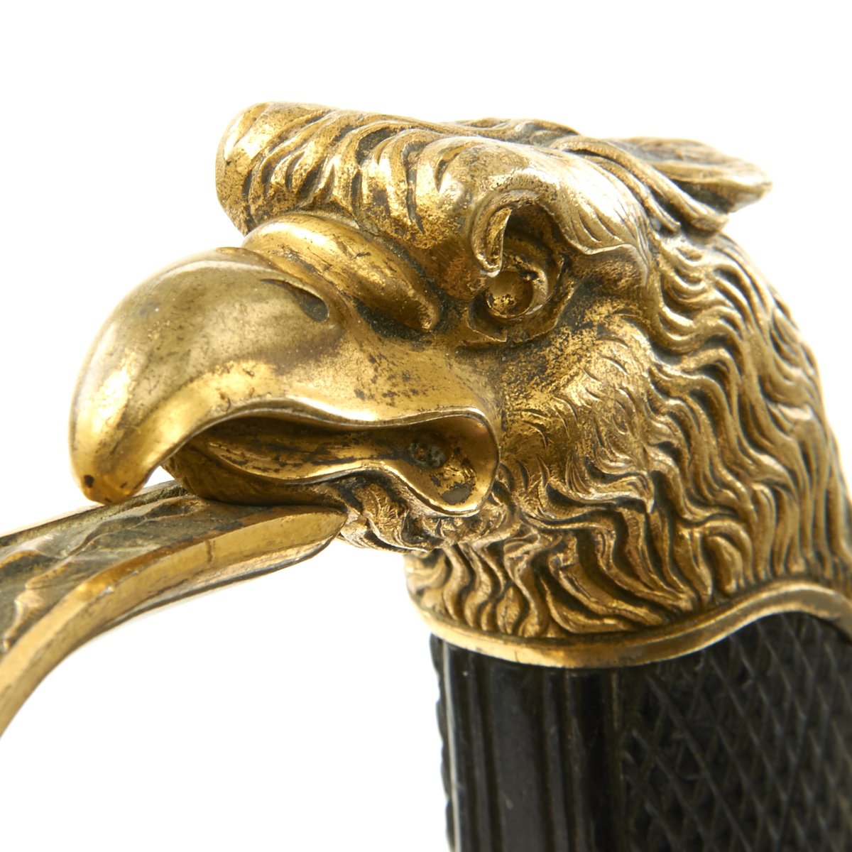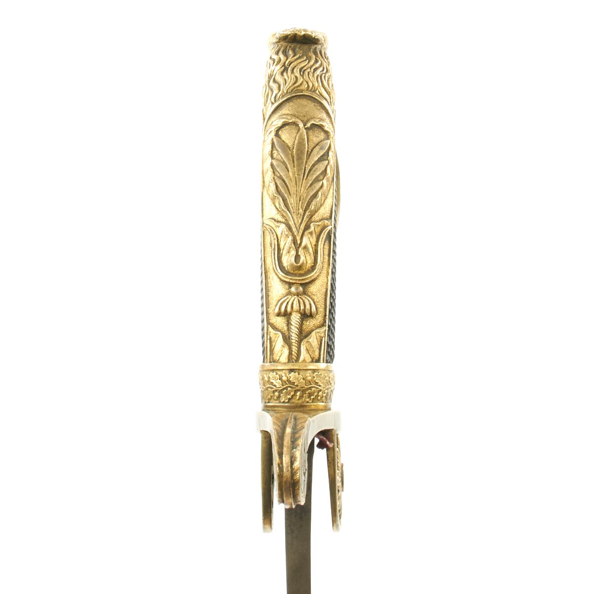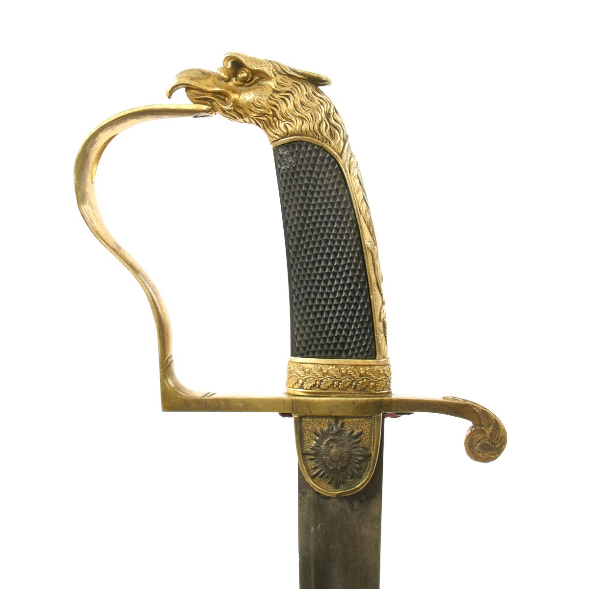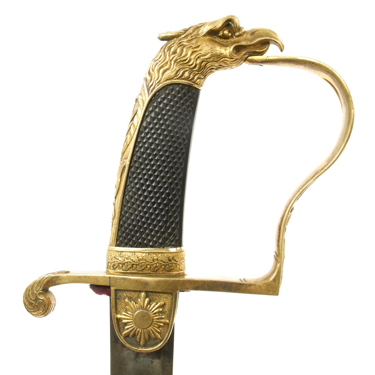 Original item: Only One Available. This is one of the most elegant of Swords, a majestical gilt brass hilt with an amazing Eagle head pommel and decorated single branch guard fully decorated, including a Palm tree. The longettes/chappes bear the Coat of Arms of the Officer, clearly an aristocrat. The gracefully curved 31 1/2" blade is covered in intricate faint etchings virtually the entire length on both sides. In the center of the right hand side the engraving includes a reference to GRENADIERS atop what appears to be a Regimental Coat of Arms with a "Flaming Bomb". There is also a manufacture mark on the spine of the blade just above the guard.