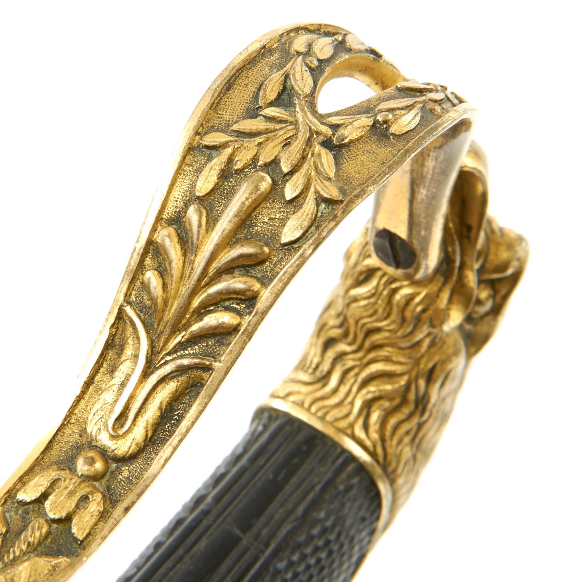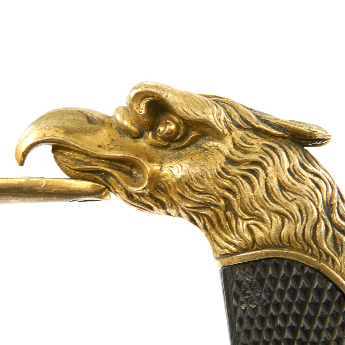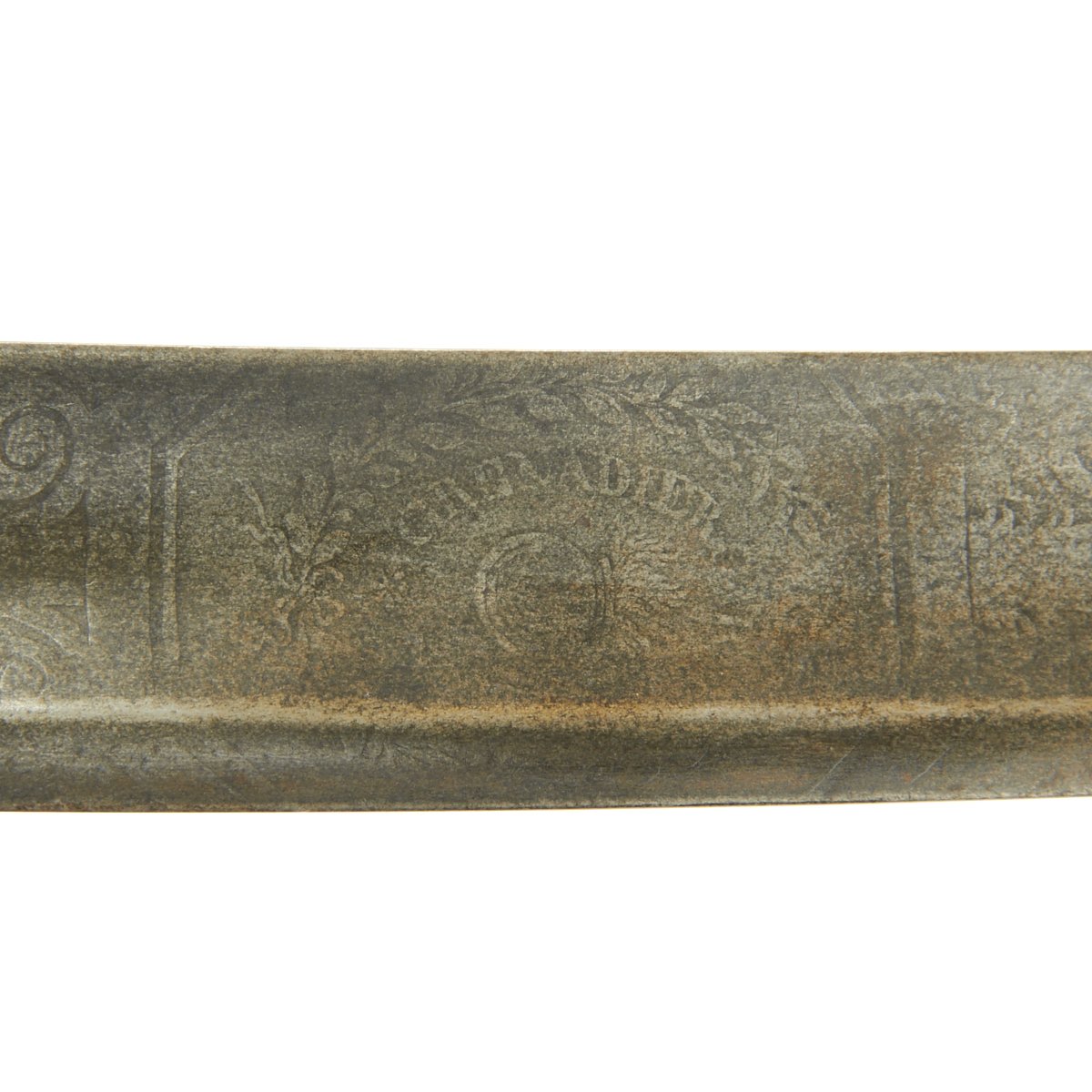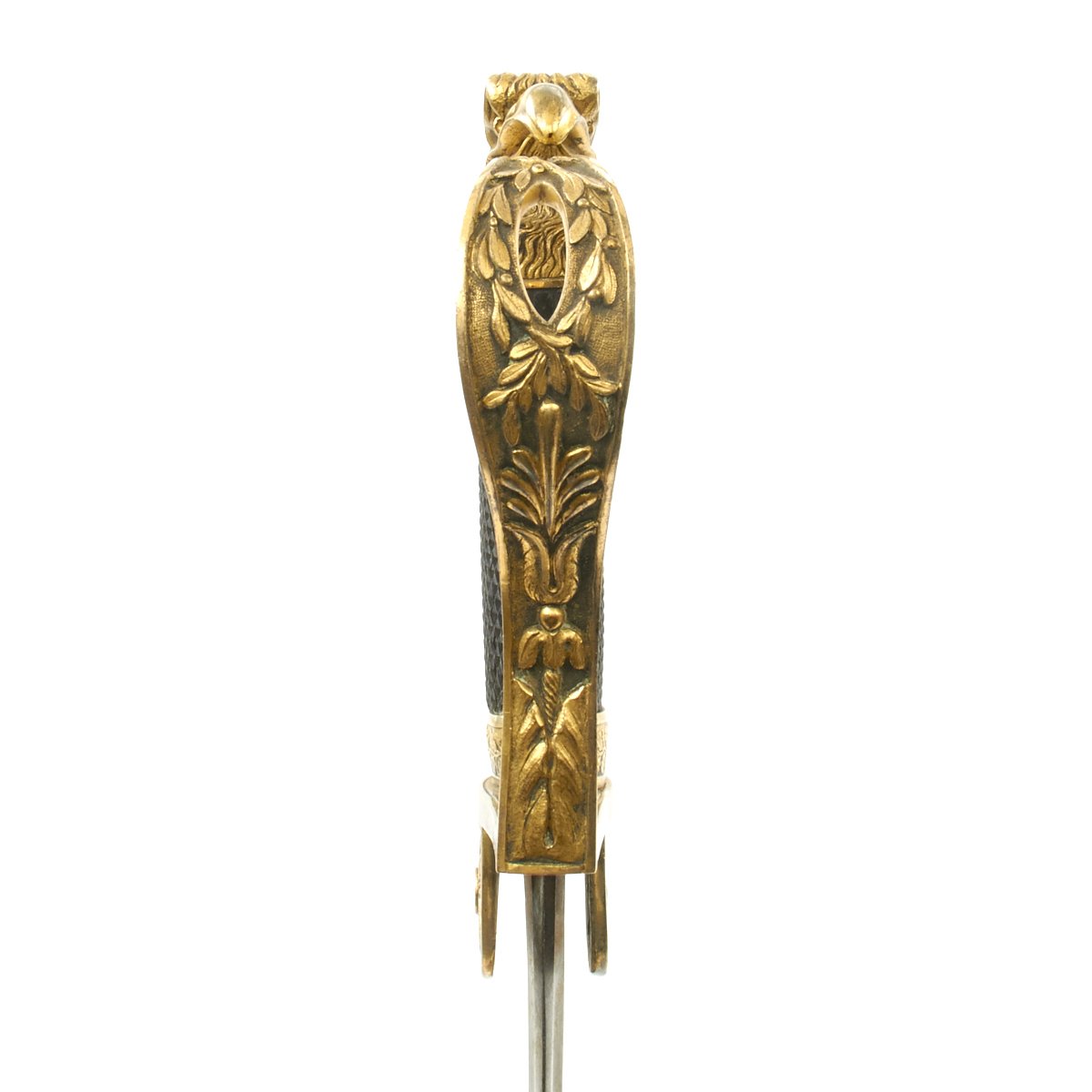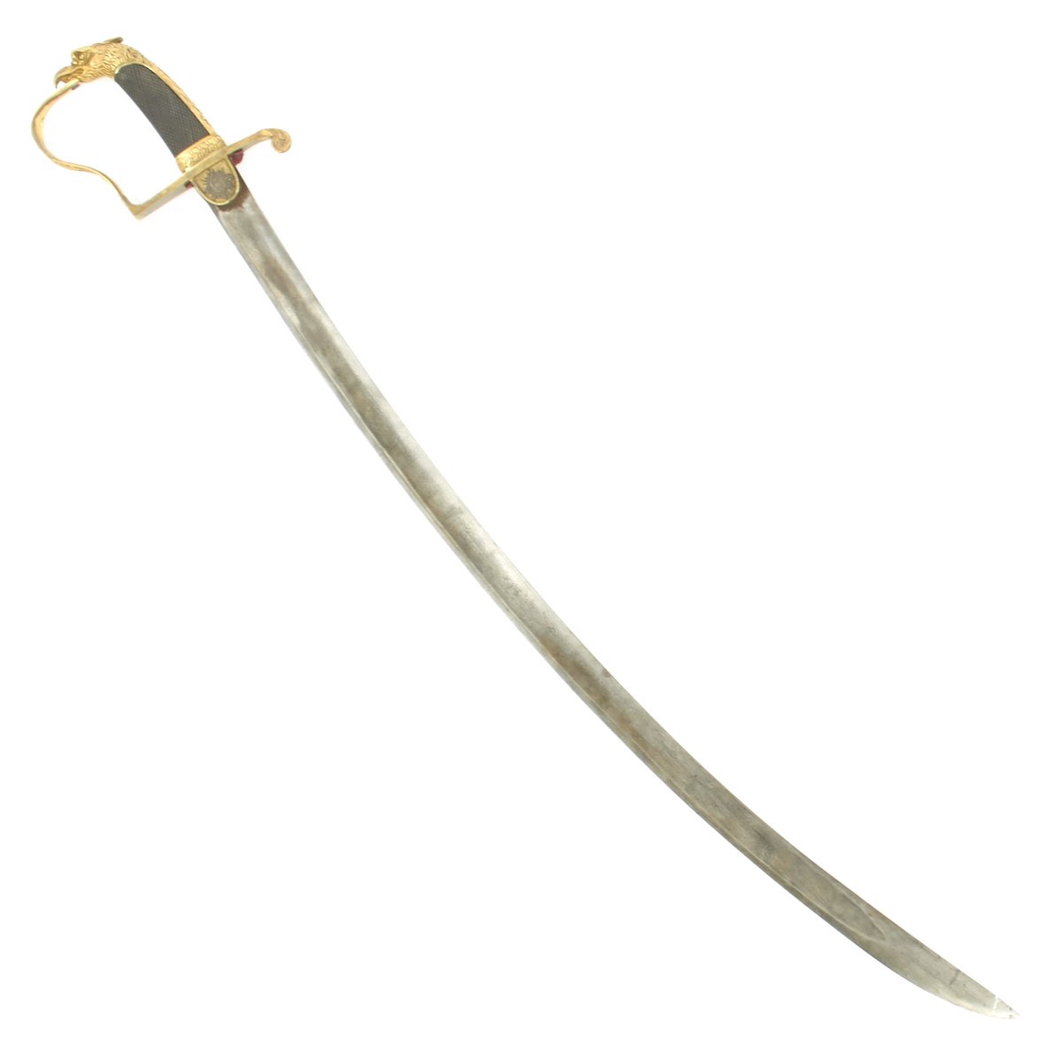 Original item: Only One Available. This is one of the most elegant of Swords, a majestical gilt brass hilt with an amazing Eagle head pommel and decorated single branch guard fully decorated, including a Palm tree. The longettes/chappes bear the Coat of Arms of the Officer, clearly an aristocrat. The gracefully curved 31 1/2" blade is covered in intricate faint etchings virtually the entire length on both sides. In the center of the right hand side the engraving includes a reference to GRENADIERS atop what appears to be a Regimental Coat of Arms with a "Flaming Bomb". There is also a manufacture mark on the spine of the blade just above the guard.
