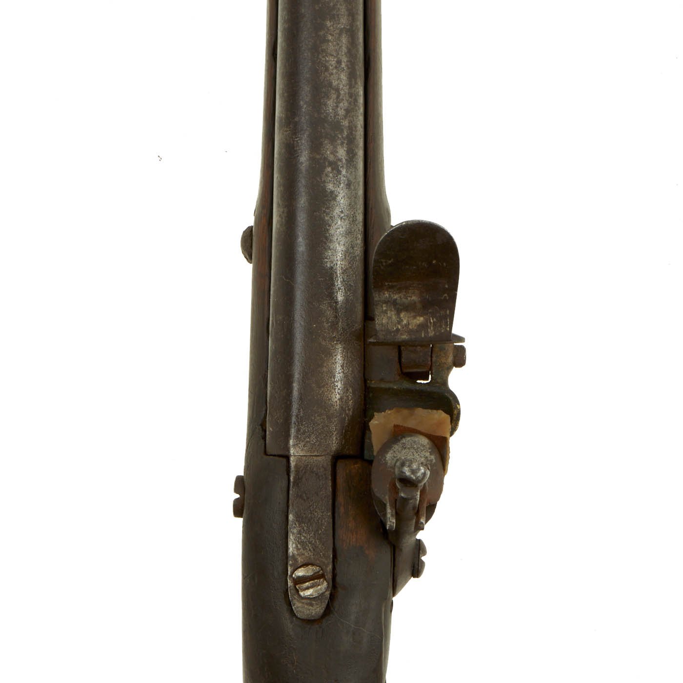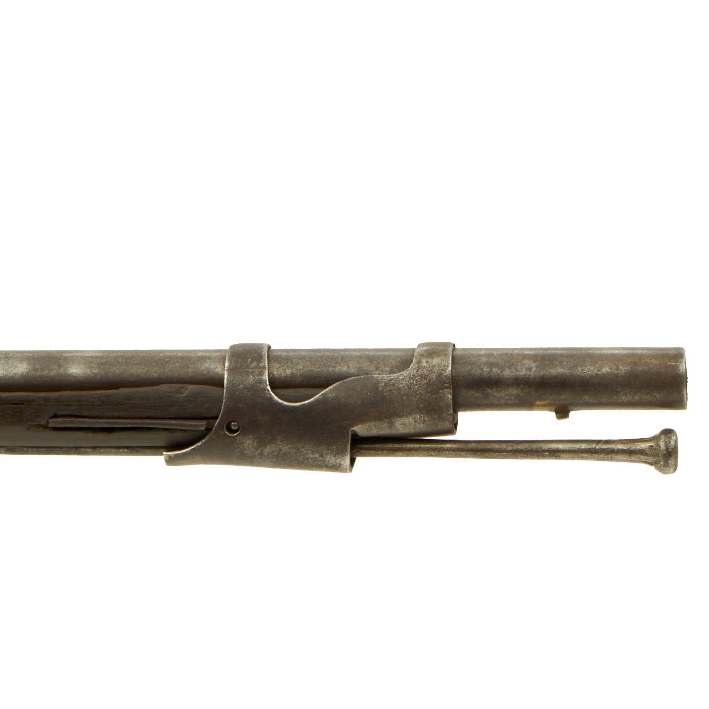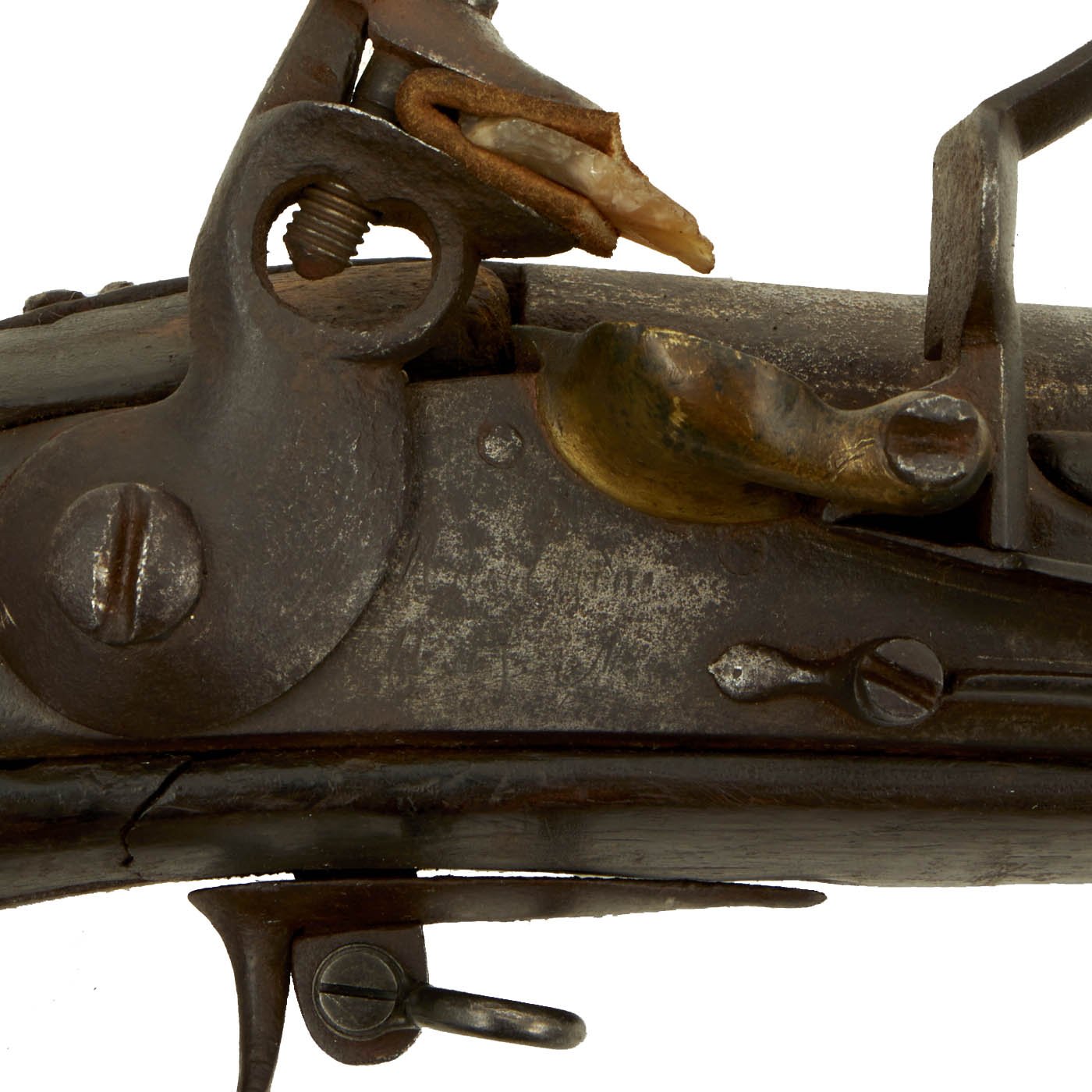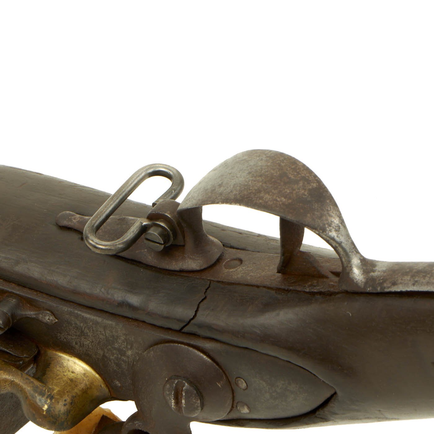 Condition is good, though does show significant wear, and some parts look to have been replaced over the years, such as the rear sling swivel and the top jaw of the cock. The lock is still functional, holding at half cock and firing at full, though the bolt for the top jaw is missing half of the head. The ramrod is a later "button top" style. We would wager that this musket saw use after military service, possibly left on the battlefield and picked up. This has resulted in most of the markings having eroded away due to powder burn and oxidation. The stock shows some cracking, and also has had a brown paint finish applied at some point.