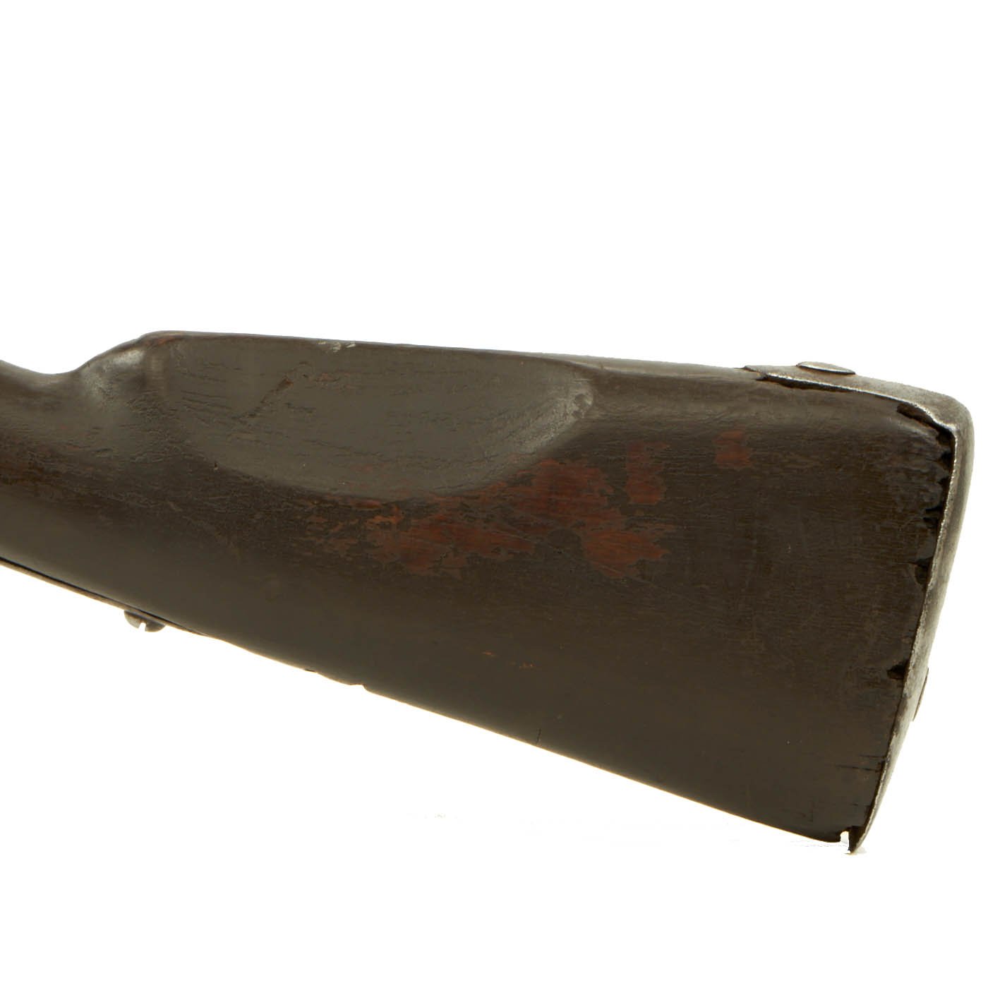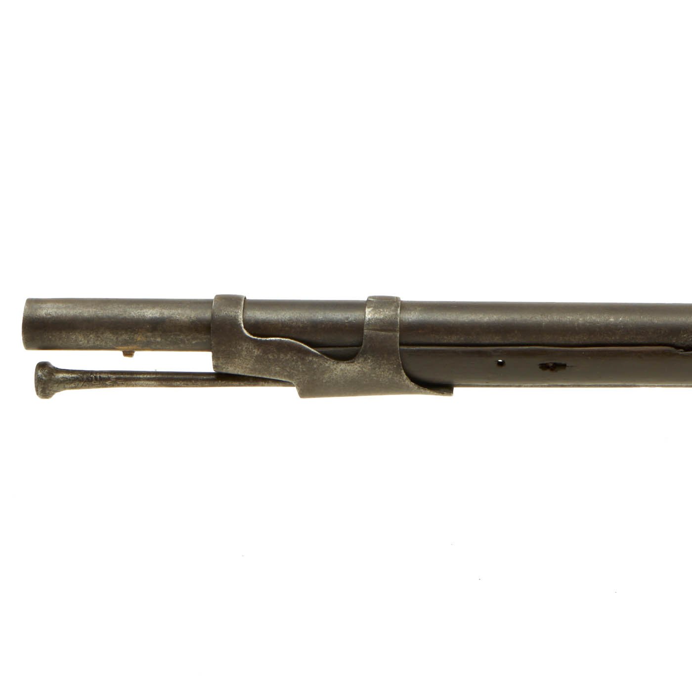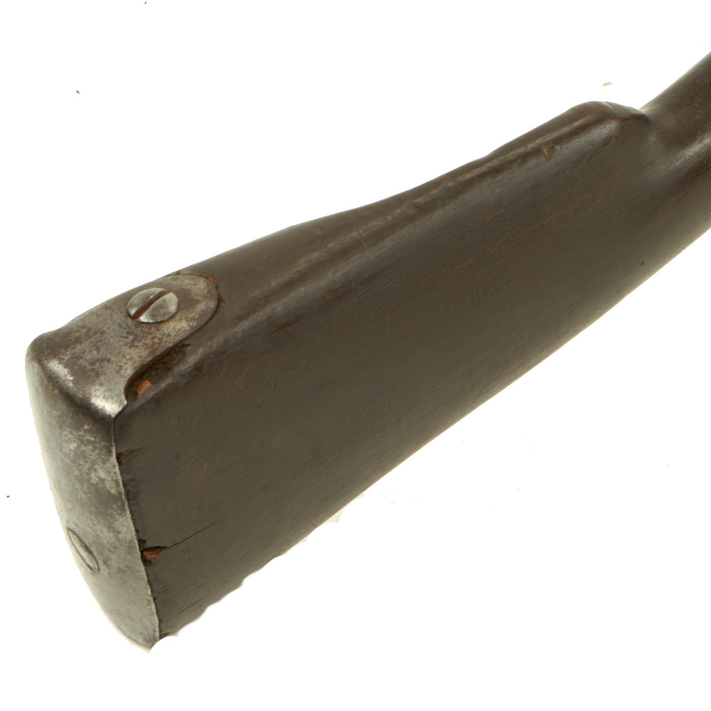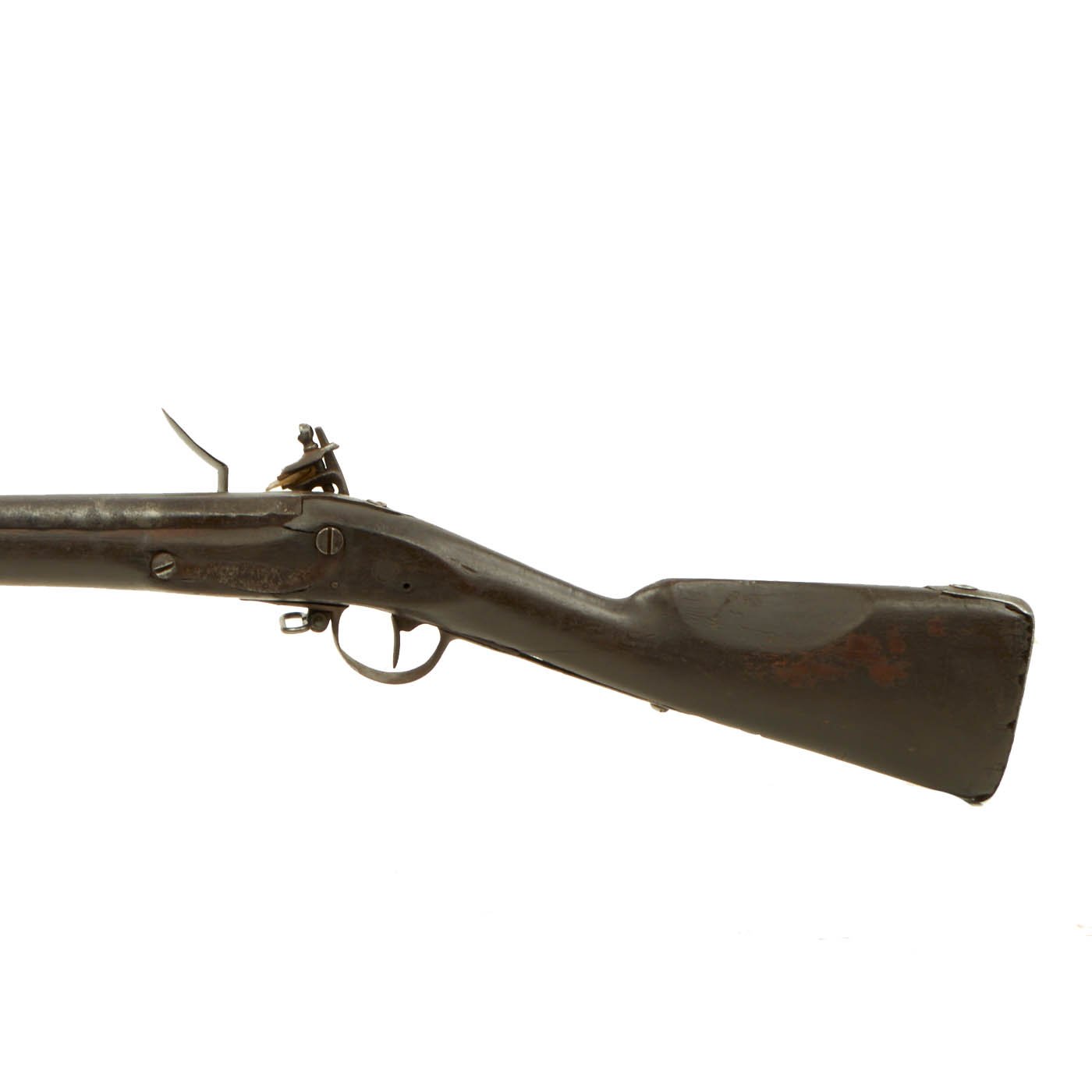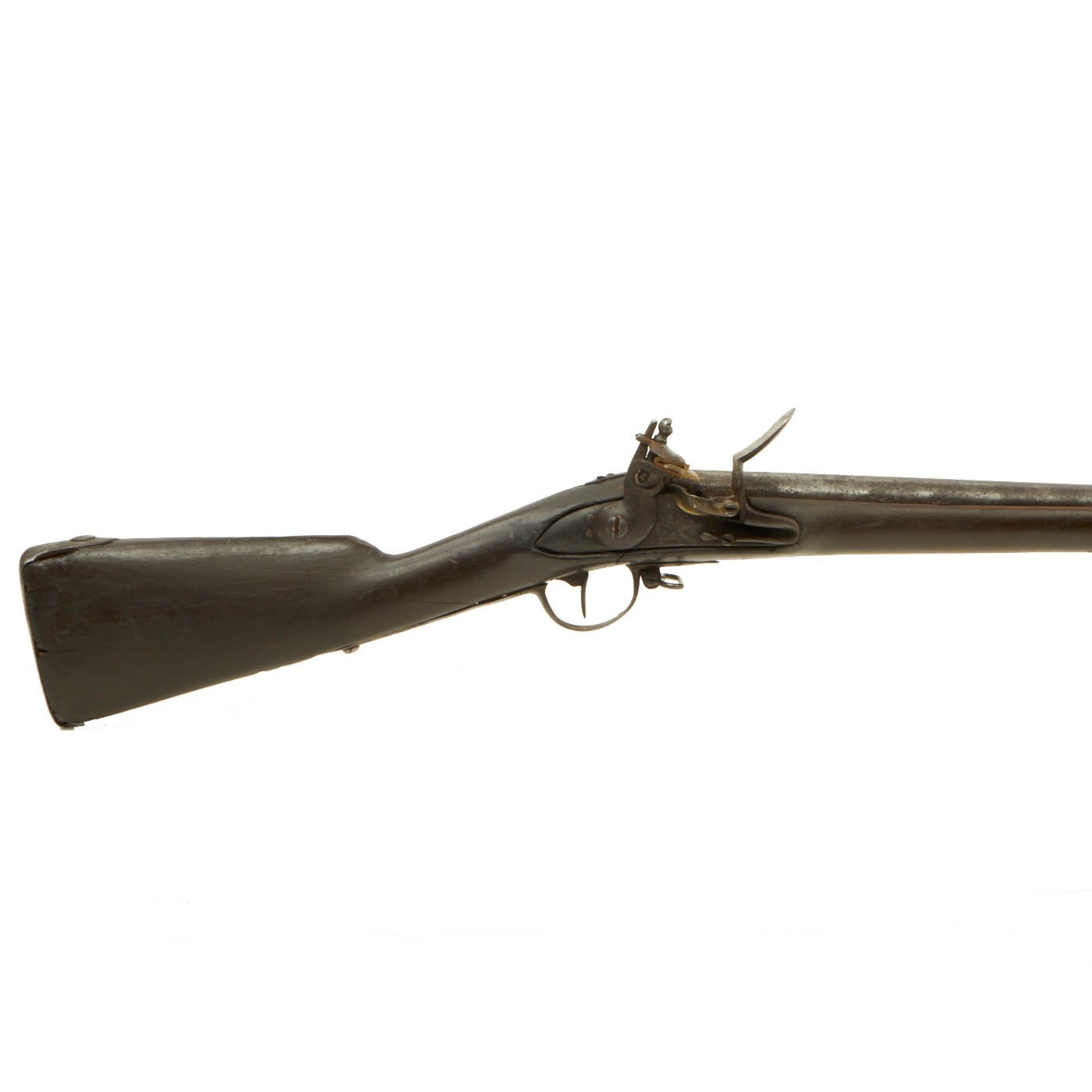 Condition is good, though does show significant wear, and some parts look to have been replaced over the years, such as the rear sling swivel and the top jaw of the cock. The lock is still functional, holding at half cock and firing at full, though the bolt for the top jaw is missing half of the head. The ramrod is a later "button top" style. We would wager that this musket saw use after military service, possibly left on the battlefield and picked up. This has resulted in most of the markings having eroded away due to powder burn and oxidation. The stock shows some cracking, and also has had a brown paint finish applied at some point.