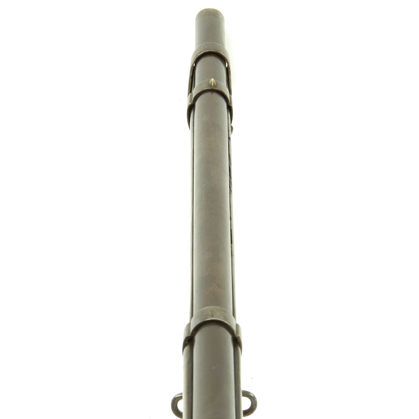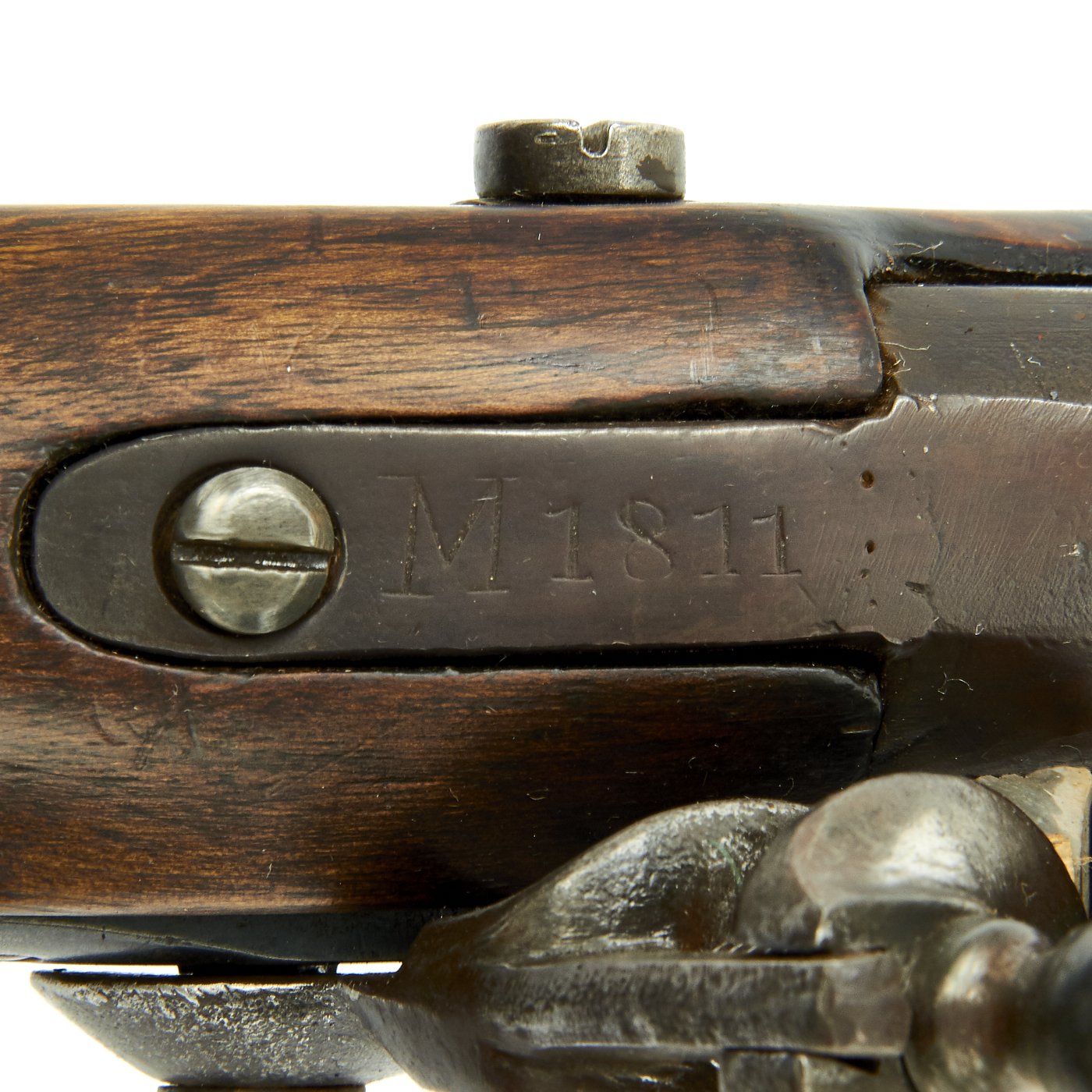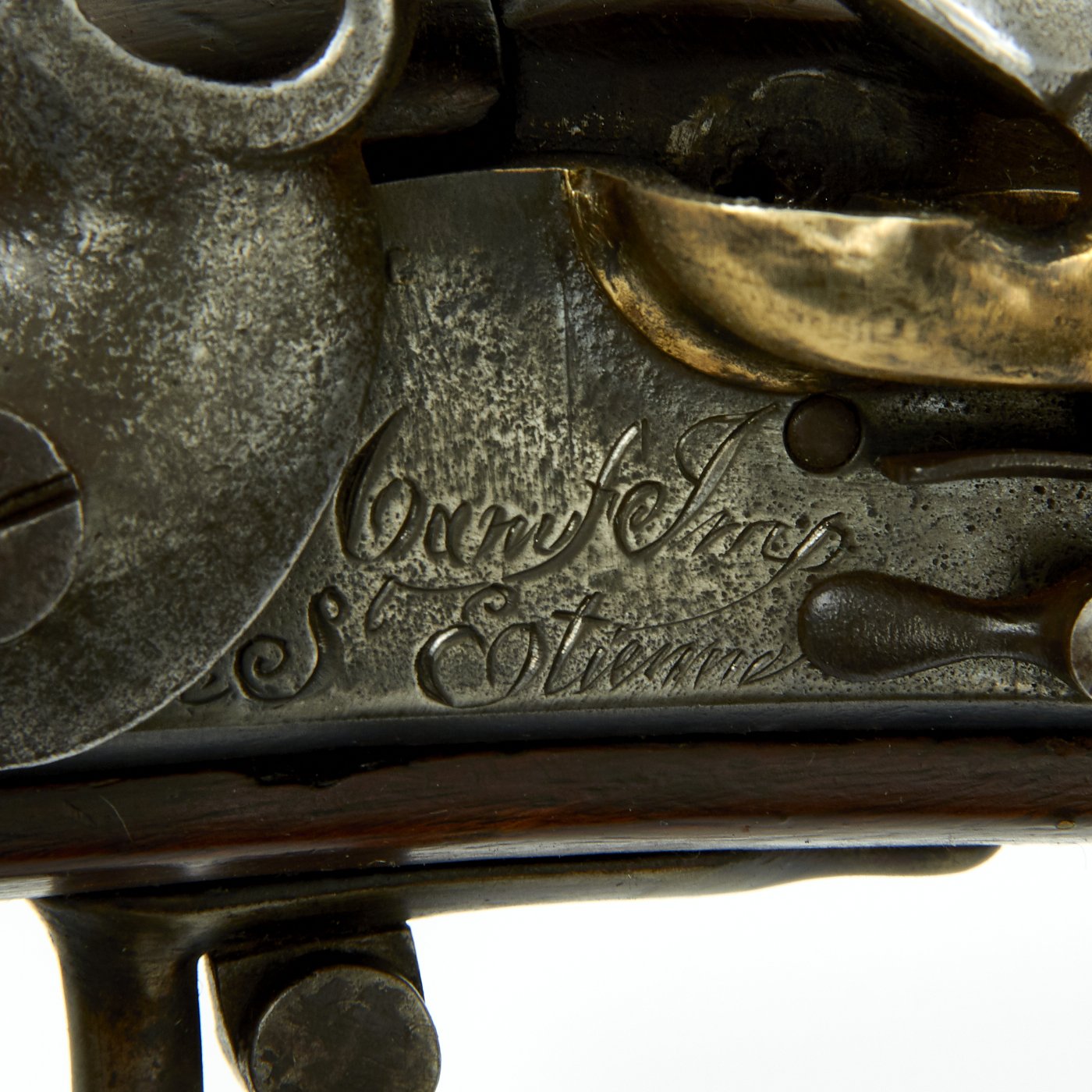 This example has all steel mounts, as brass mounts were generally only used for Naval issue. The lock is marked Manuf. Imp. de St.Étienne, the barrel tang marked M1811, indicating the year of manufacture. Differing from the Brown Bess not only using all steel mounts the barrel is secured by three-barrel bands and not pins. Very good used overall condition this musket comes with an early model all steel trumpet front ramrod. Stocks are in good condition, with some arsenal repairs.