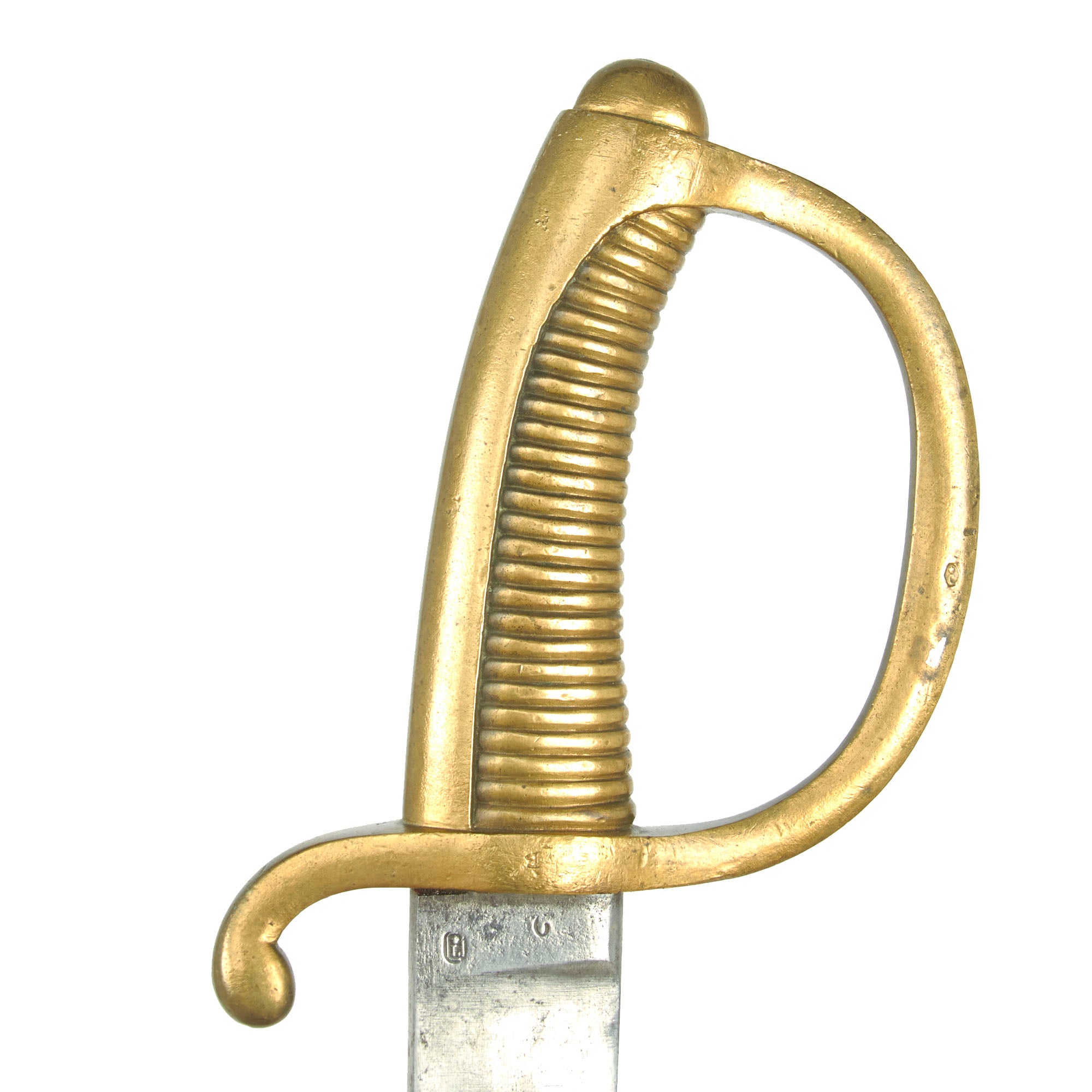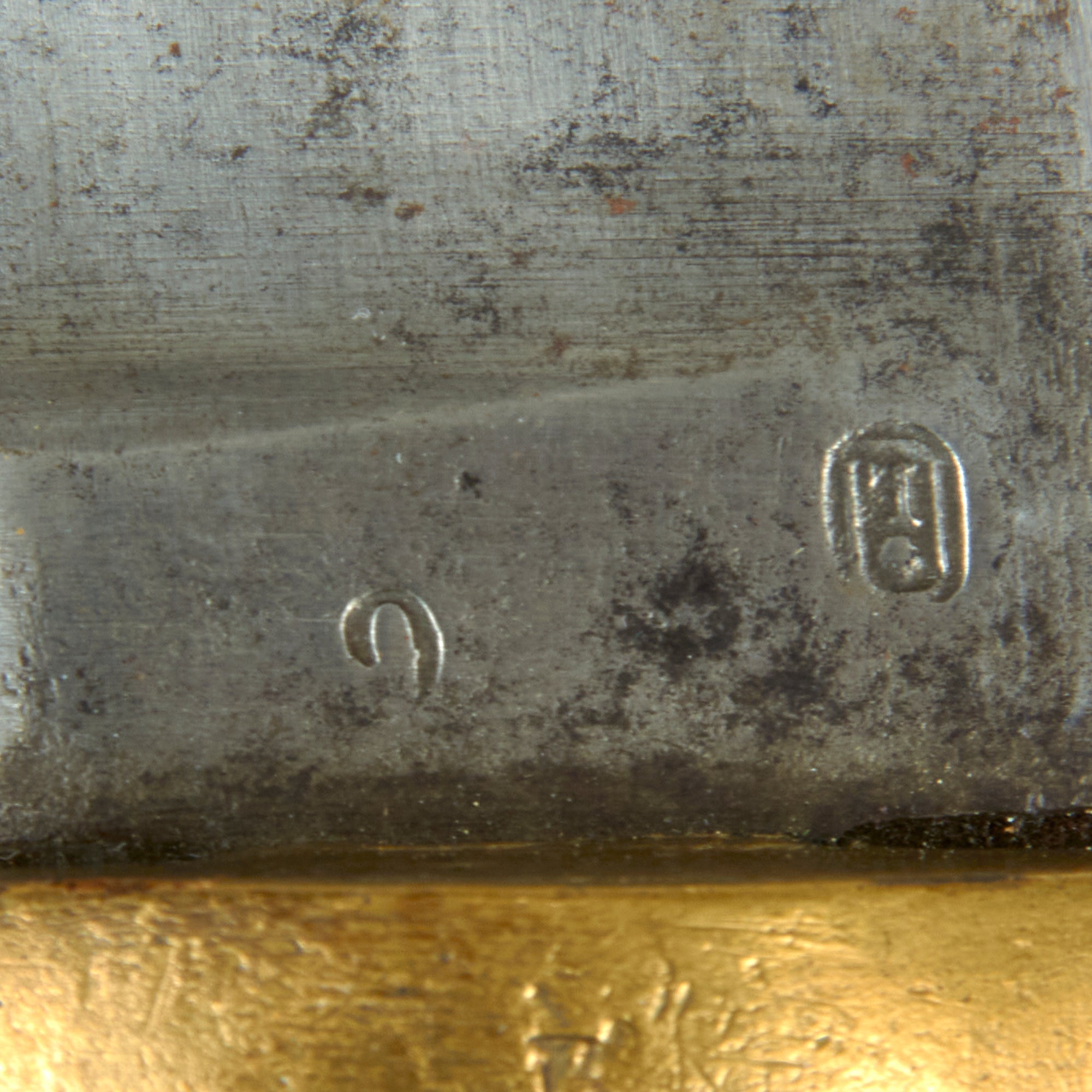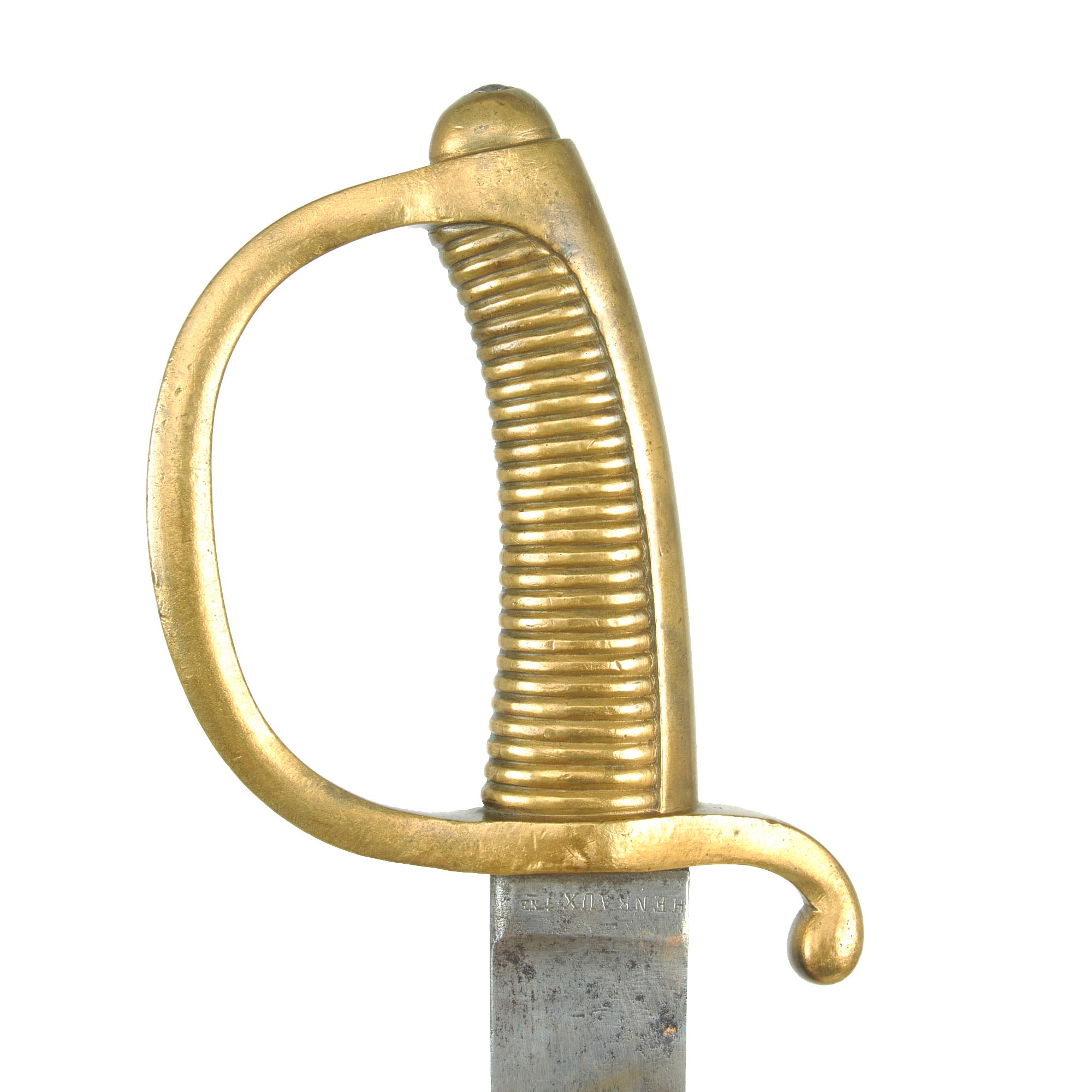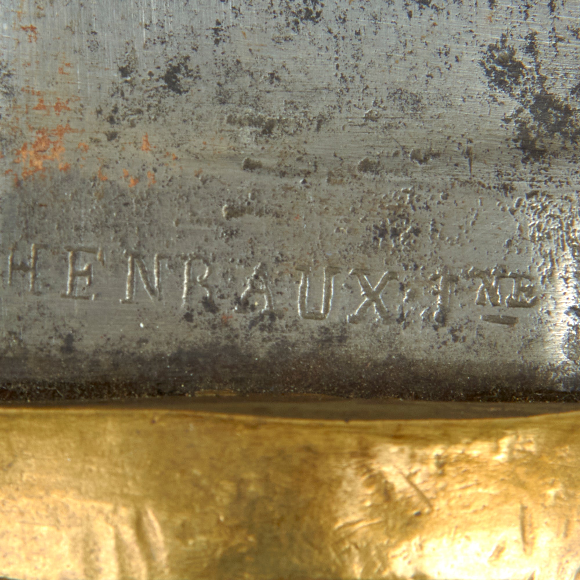 The sword features a 23½” blade with an overall length of 29”. The ricasso is marked on one side with HENRAUX J'NE for Henraux of Paris, who supplied these blades to the French military. The other side has several proof or inspection markings. The scabbard is absent.