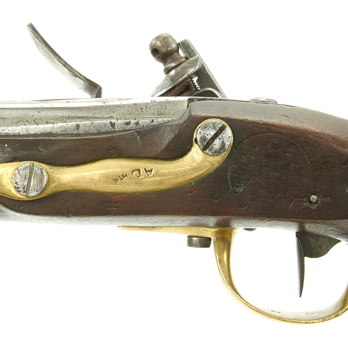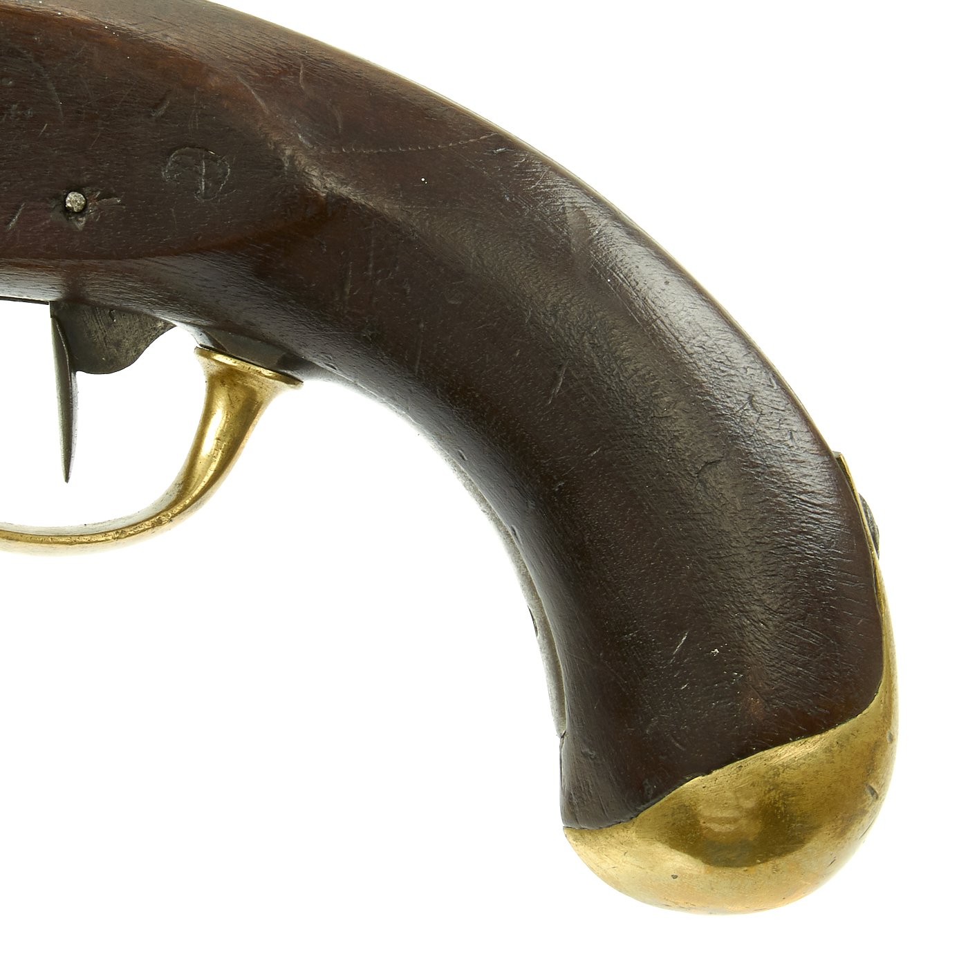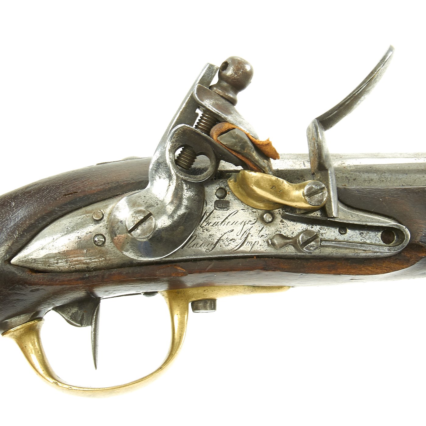 Original item. Ony One Available. This is the Classic Military Flintlock Pistol of the Napoleonic era, made at the IMPERIAL ARSENAL OF MAUBEUGE, an Arms Manufacturing installation created by King LOUIS XIV in 1678. It is Marked on the lock plate Maubeuge / Manuf. Imp. in scroll engraving below a proof mark. Brass mounts on walnut wood stock fitted with large skull crusher butt cap, and dated 1808 on the barrel. There are also numerous letter proof markings on the brass components, probably assembly matching numbers.