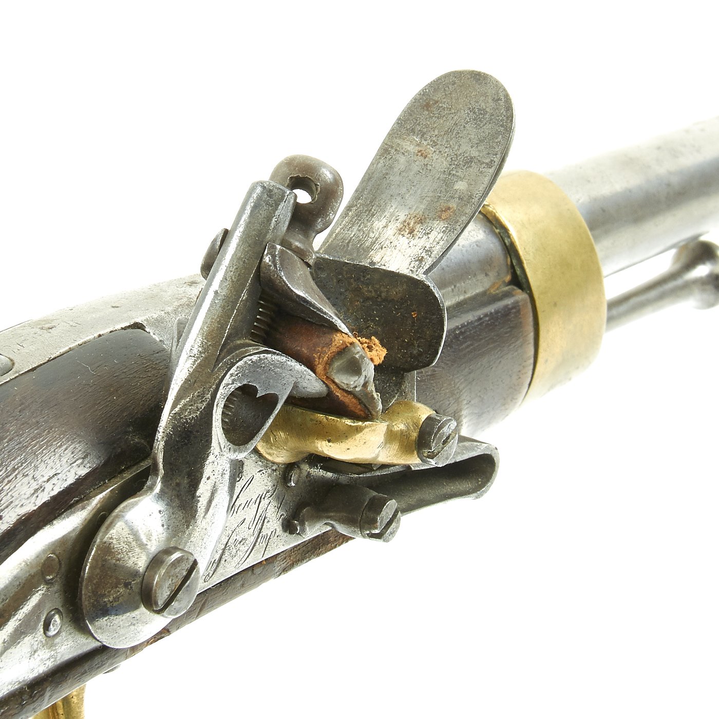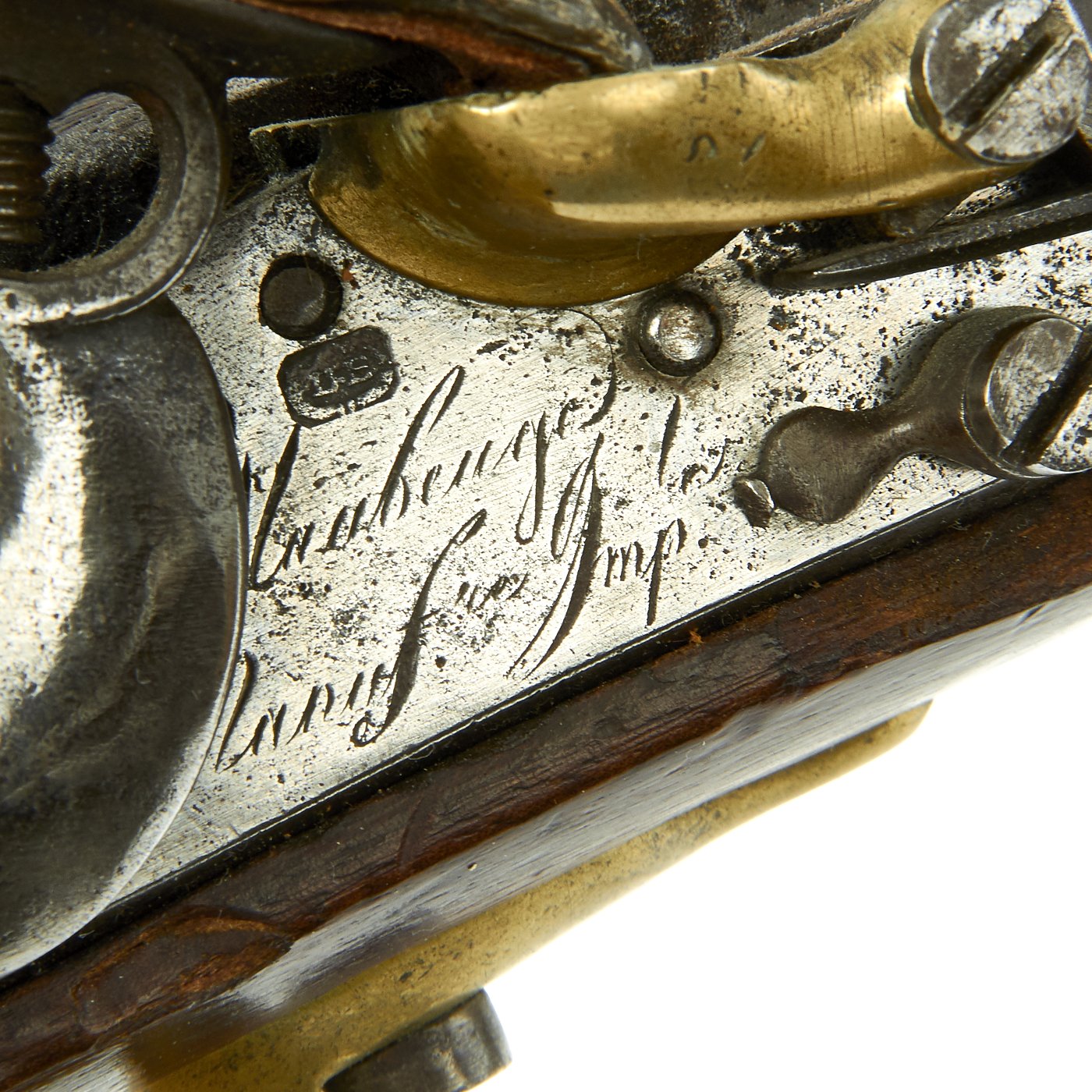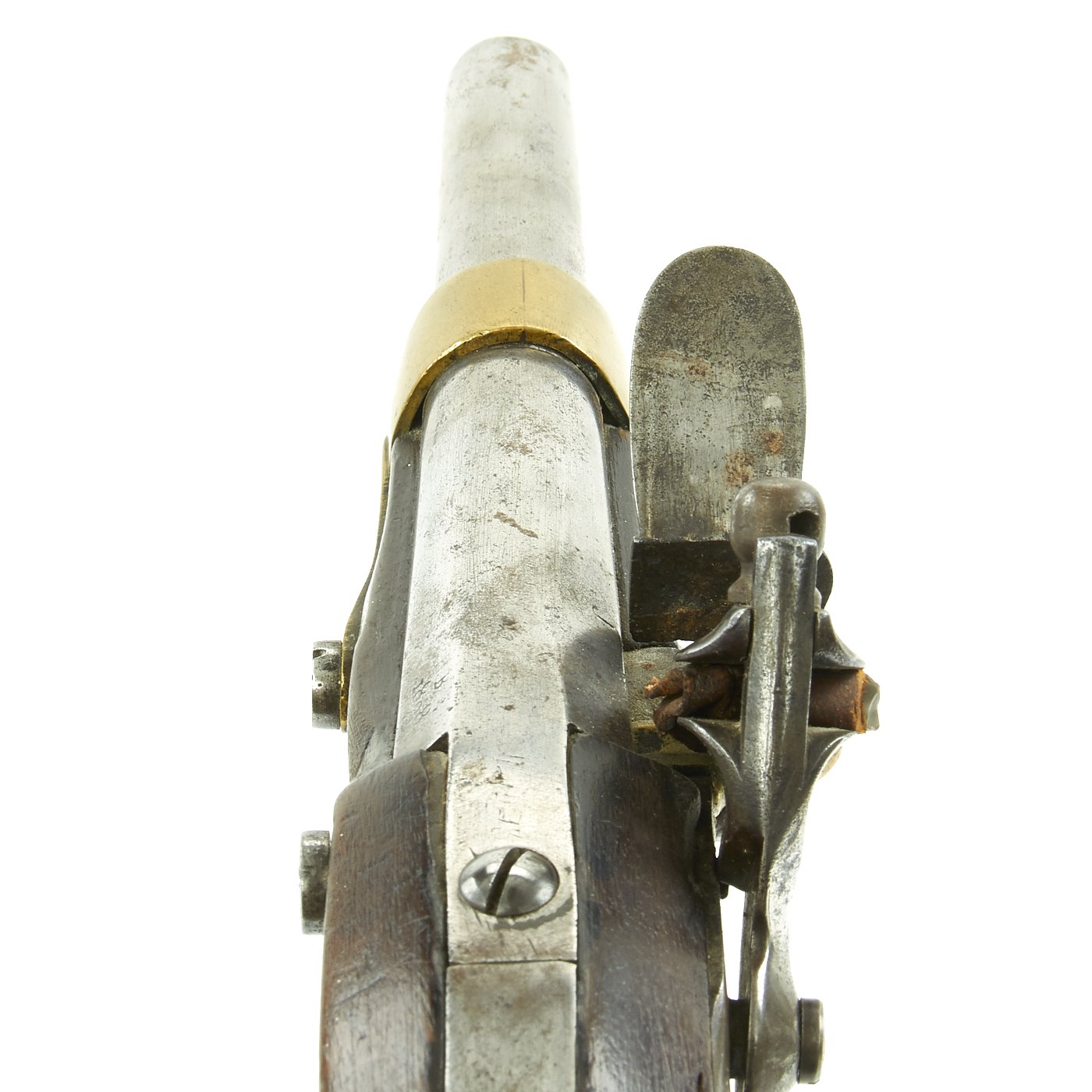 Original item. Ony One Available. This is the Classic Military Flintlock Pistol of the Napoleonic era, made at the IMPERIAL ARSENAL OF MAUBEUGE, an Arms Manufacturing installation created by King LOUIS XIV in 1678. It is Marked on the lock plate Maubeuge / Manuf. Imp. in scroll engraving below a proof mark. Brass mounts on walnut wood stock fitted with large skull crusher butt cap, and dated 1808 on the barrel. There are also numerous letter proof markings on the brass components, probably assembly matching numbers.