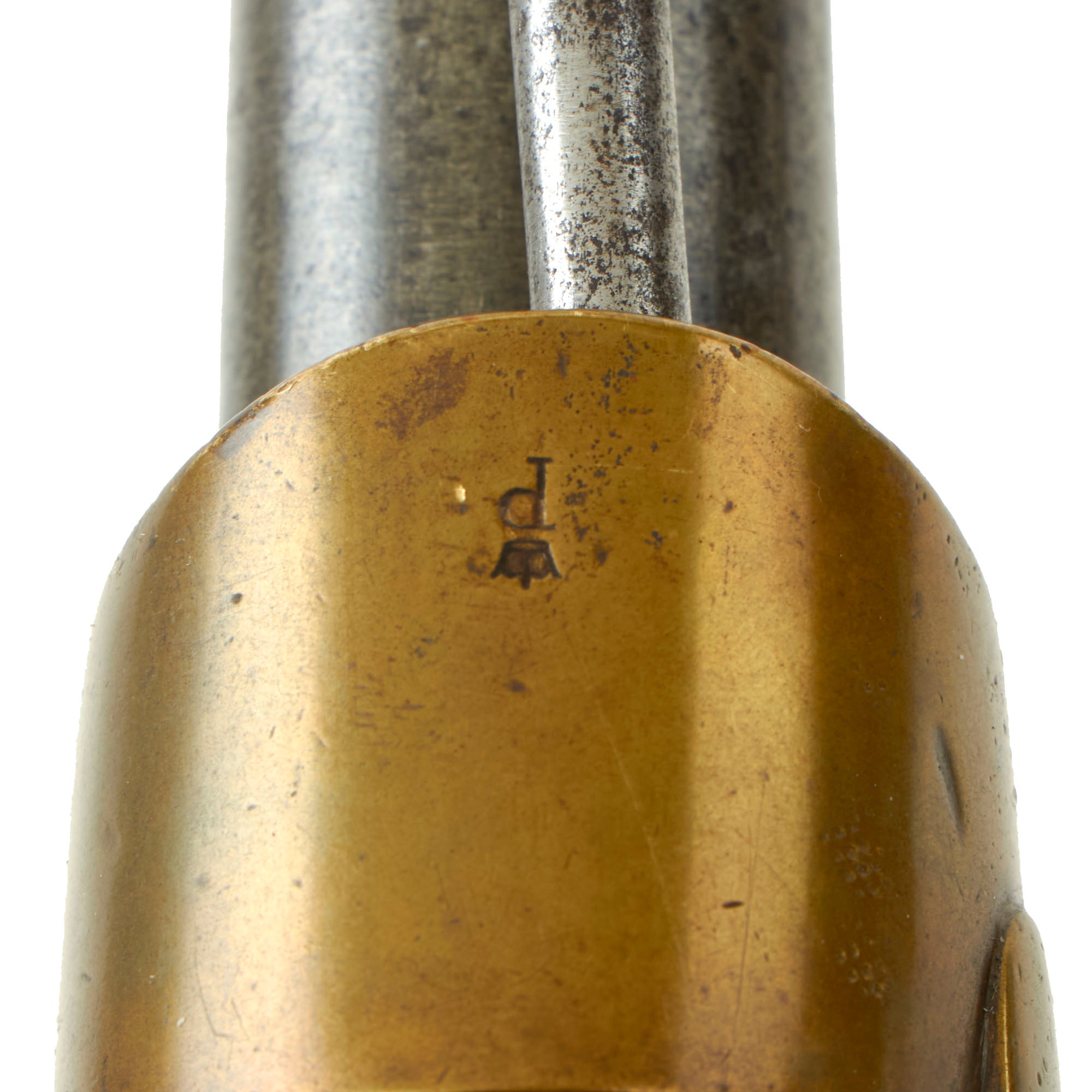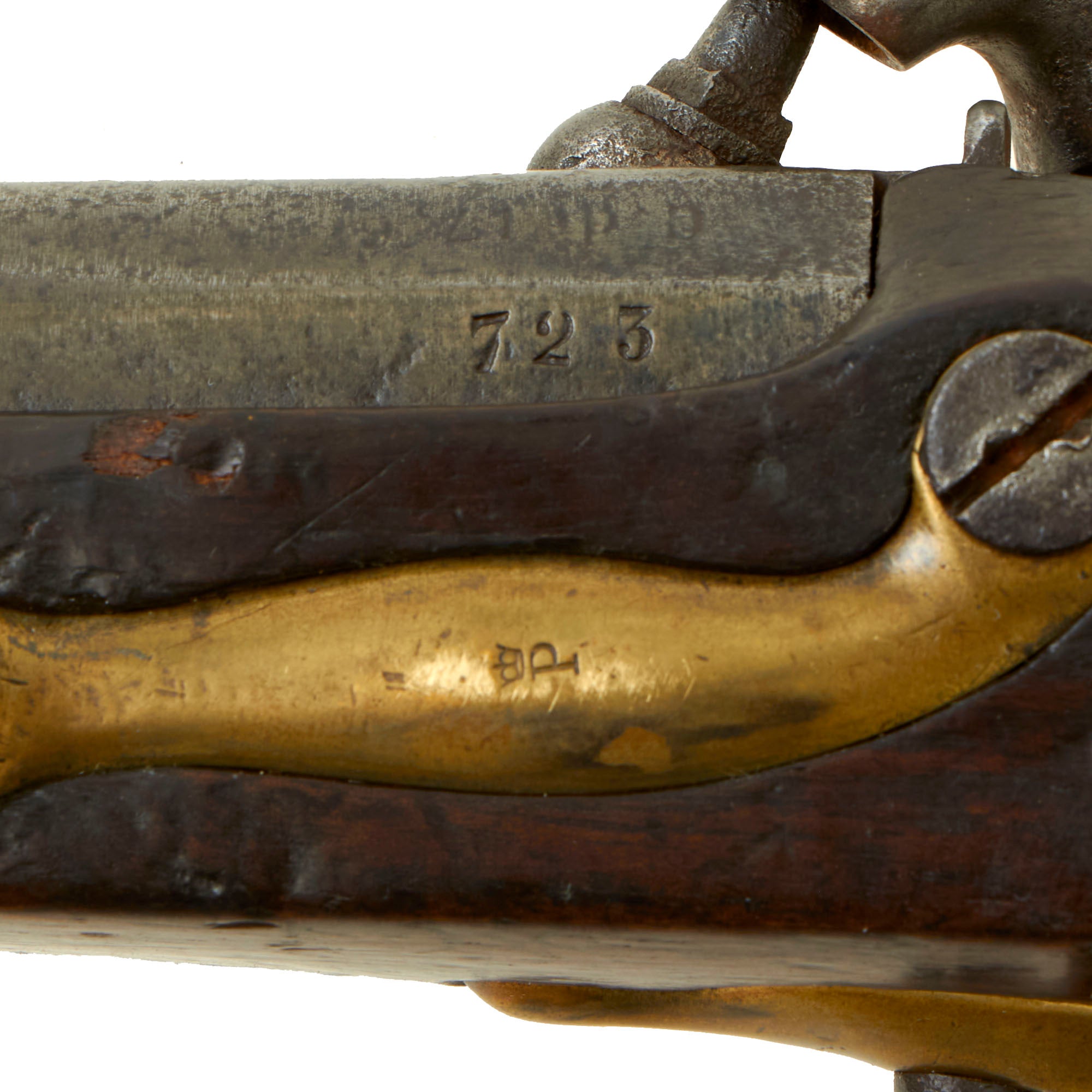The pistol is faintly marked on the lock plate St Étienne / M're Imp'ale in scroll engraving below a Fleur-de-Lis / S proof mark. It features all brass mounts on walnut wood stock fitted with large skull crusher butt cap, and is marked with serial 723 on the left side of the barrel nocks form. It also has the correct Mle. an 13 marking on the barrel tang, short for "Modèle An XIII", introduced in the 13th Year of the French Revolutionary Calendar, or 1805. On the other side of the tang screw is a script T, indicating the "transformation" into a percussion arm. The barrel is also marked C.de 17.6 for an 17.6 mm bore, which is approximately .69".