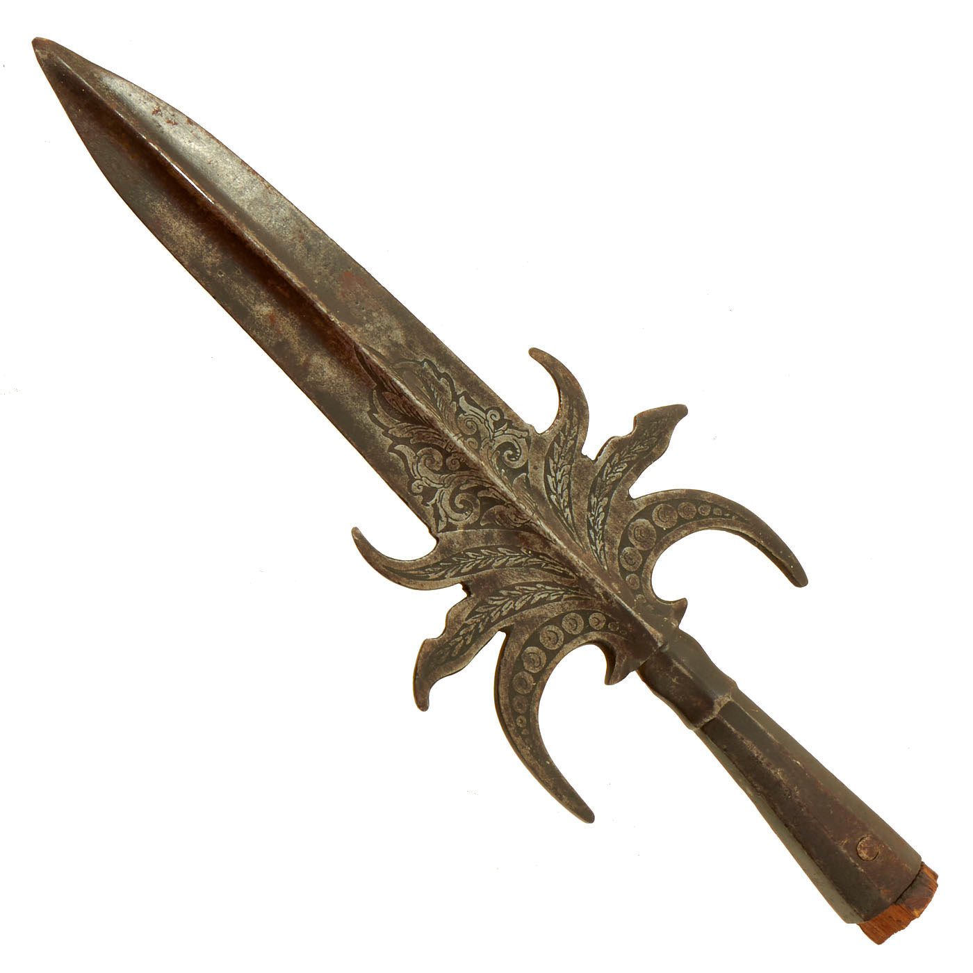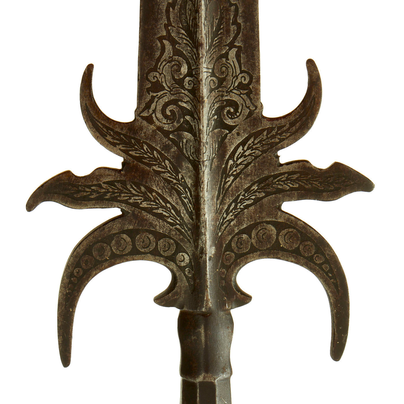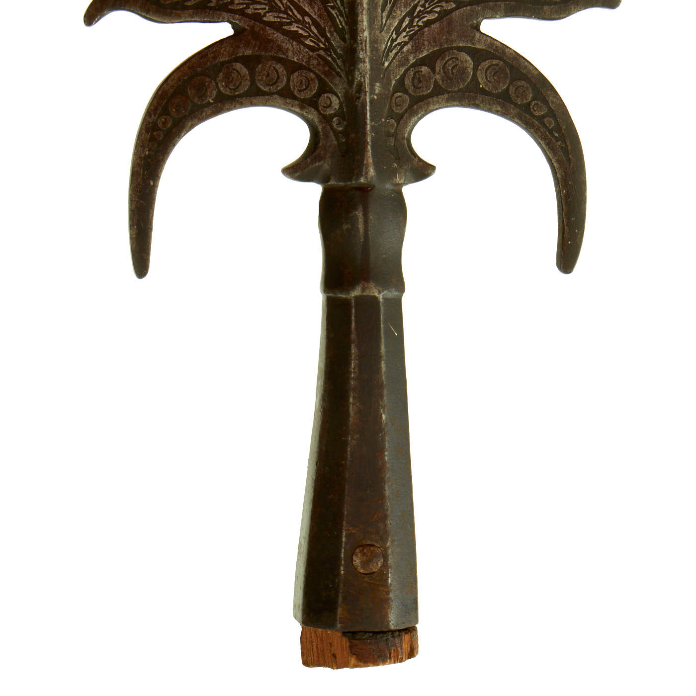 This polearm head is a hybrid of the Partisan and Spontoon and is simply referred to as “Partisa-Spontoon” to keep it simple. The design and distinct shape aided in identifying it as a French example and dating to the Mid to Late 17th Century, around the time France was involved in multiple ongoing conflicts. The condition is excellent with the etched designs still clear and stunning in appearance. It measures approximately 11 inches in length with the widest point measuring 4 inches.