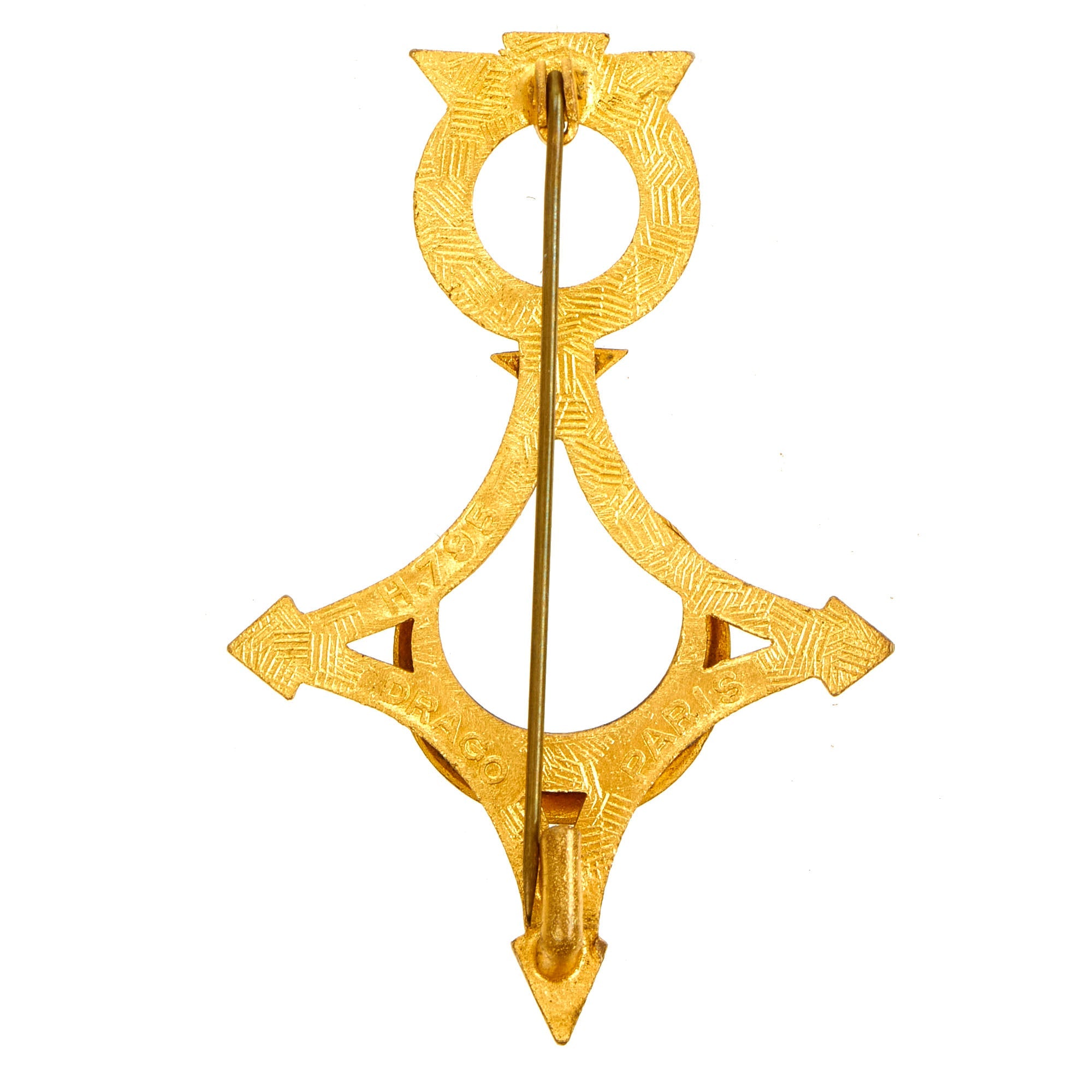 The cross was designed by the sculptor Paul-Albert Bartholomé. It is 37 mm wide, Florentine bronze cross pattée, with two crossed swords pointing up between the arms. The obverse centre medallion bears the relief image of the French Republic in the form of the bust of a young woman wearing a Phrygian cap surrounded by the circular relief inscription RÉPUBLIQUE FRANCAISE (FRENCH REPUBLIC). Not knowing how long the war would last, the reverse centre medallion bears the dates 1914–1915, 1914–1916, 1914–1917 and finally 1914–1918.