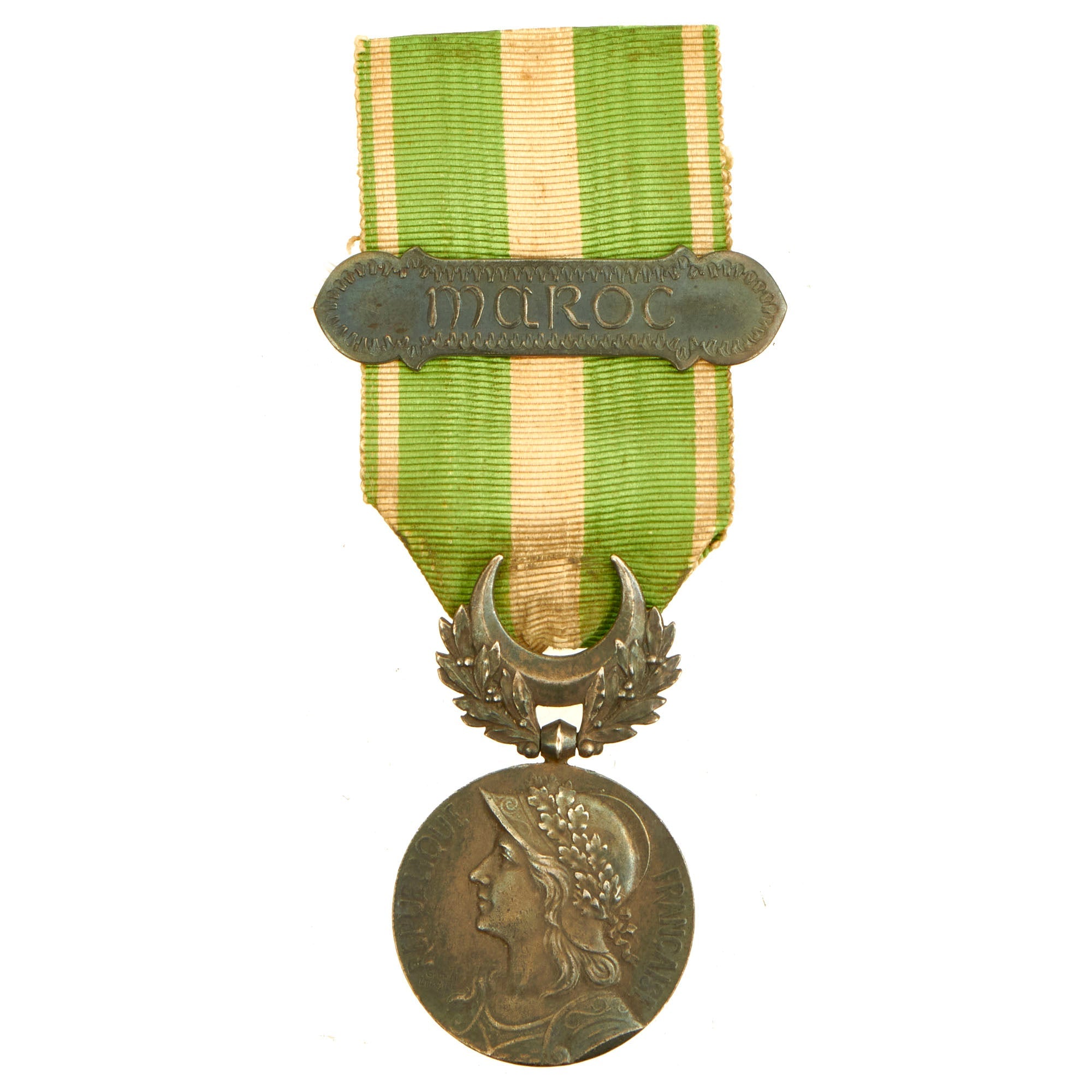 The Morocco commemorative medal (1909) was a 30mm in diameter circular silver medal. The obverse bore the relief image of the effigy of the "warrior republic" in the form of the left profile of a helmeted woman's bust, the helmet being adorned by a crown of oak leaves. On either side, the relief inscription along the circumference "RÉPUBLIQUE FRANÇAISE" (English: "FRENCH REPUBLIC"). The reverse, representing both the army and navy, bears the relief images of an infantry rifle crossed with a naval anchor below two military banners and lances surmounted by the relief inscription "MAROC" (English: "MOROCCO"), the banners bore the inscriptions "HONNEUR ET PATRIE" (English: "HONOUR AND COUNTRY") and the words "CASABLANCA", "HAUT-GUIR", and "OUDJDA". In the background, sand dunes, the wall of a Kasbah and palm trees.