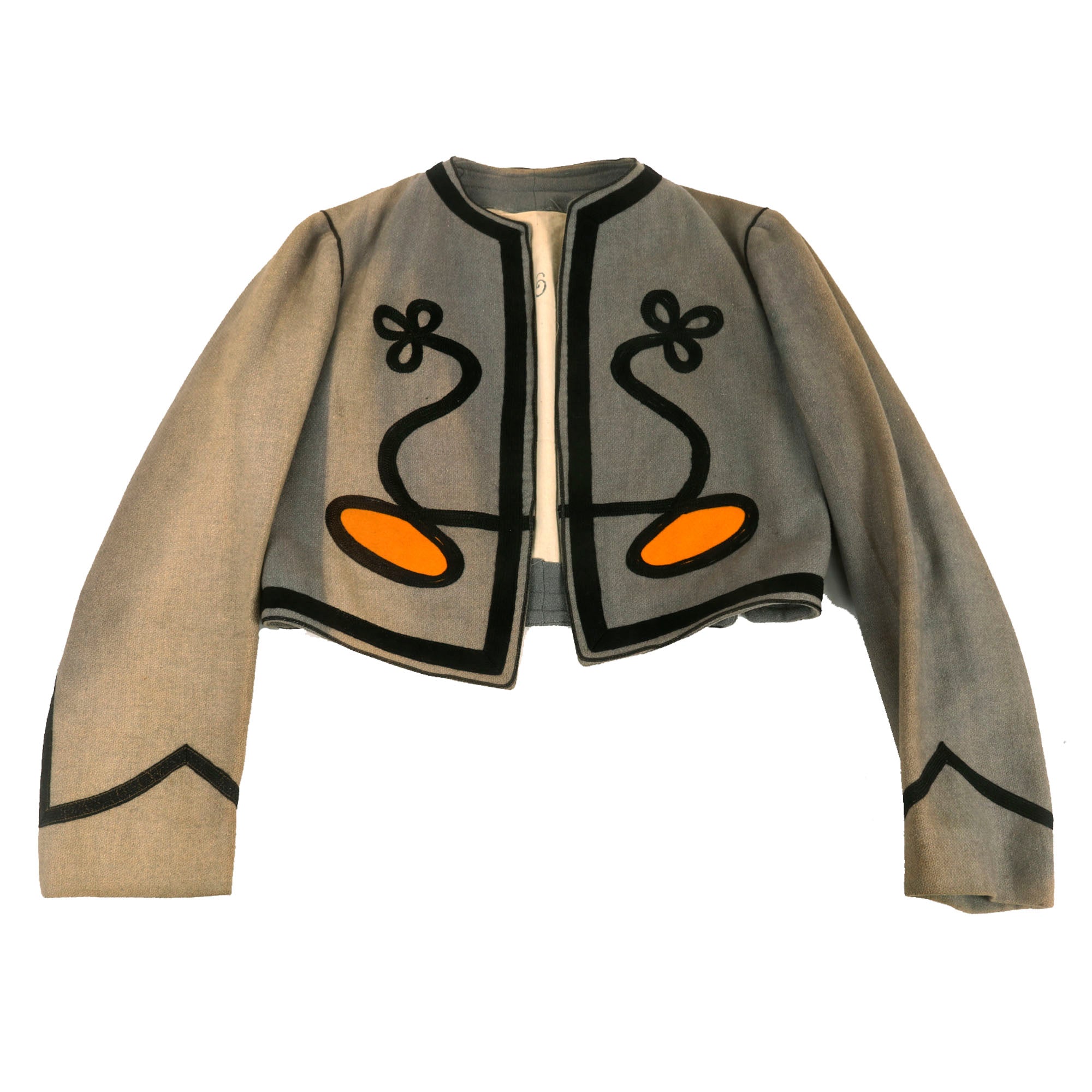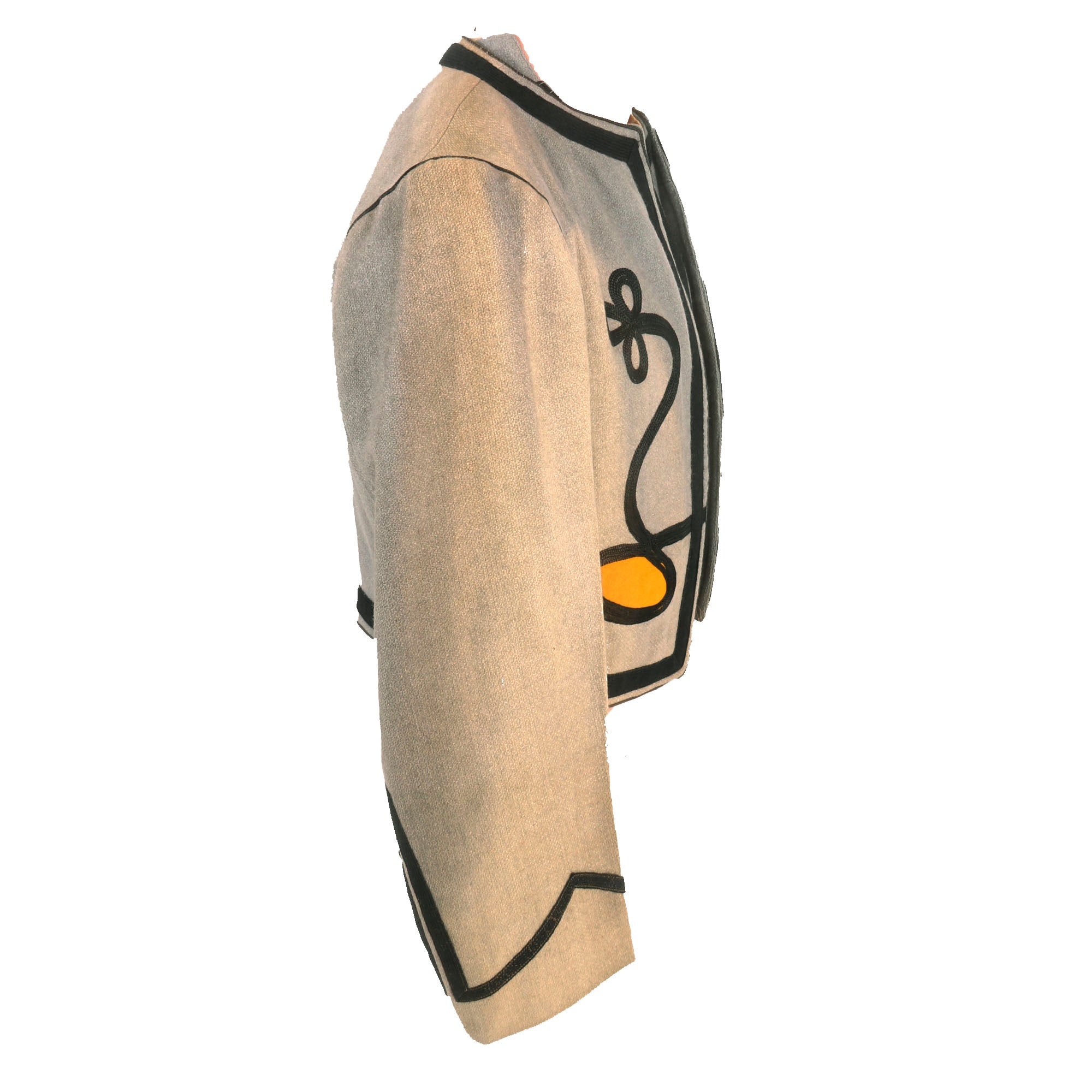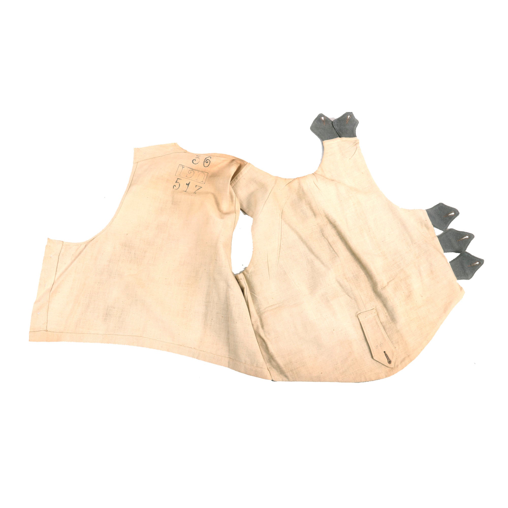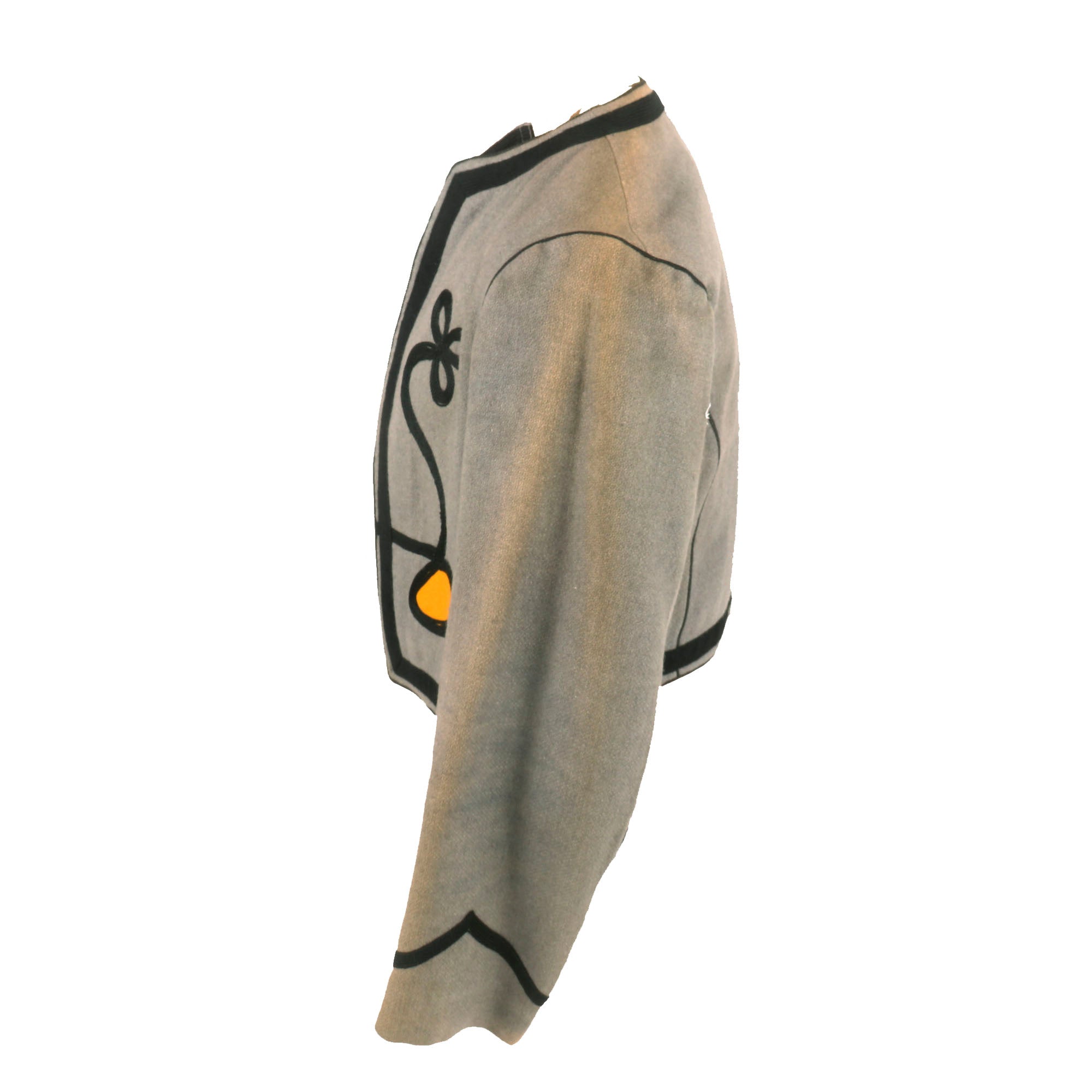 Until 1914 the Algerian and Tunisian tirailleurs wore zouave style uniforms of light blue with yellow braiding, although this example has black braiding with yellow ovals at the bottom, which likely indicates the same unit. White turbans (for parade), red fezzes and sashes were worn with this "tenue orientale". A white field dress of similar loose cut was worn for North African campaigning and in France during the early months of World War I. They adopted a more practical khaki uniform from 1915 onwards, in common with the other units of the (North African) 19th Military District.