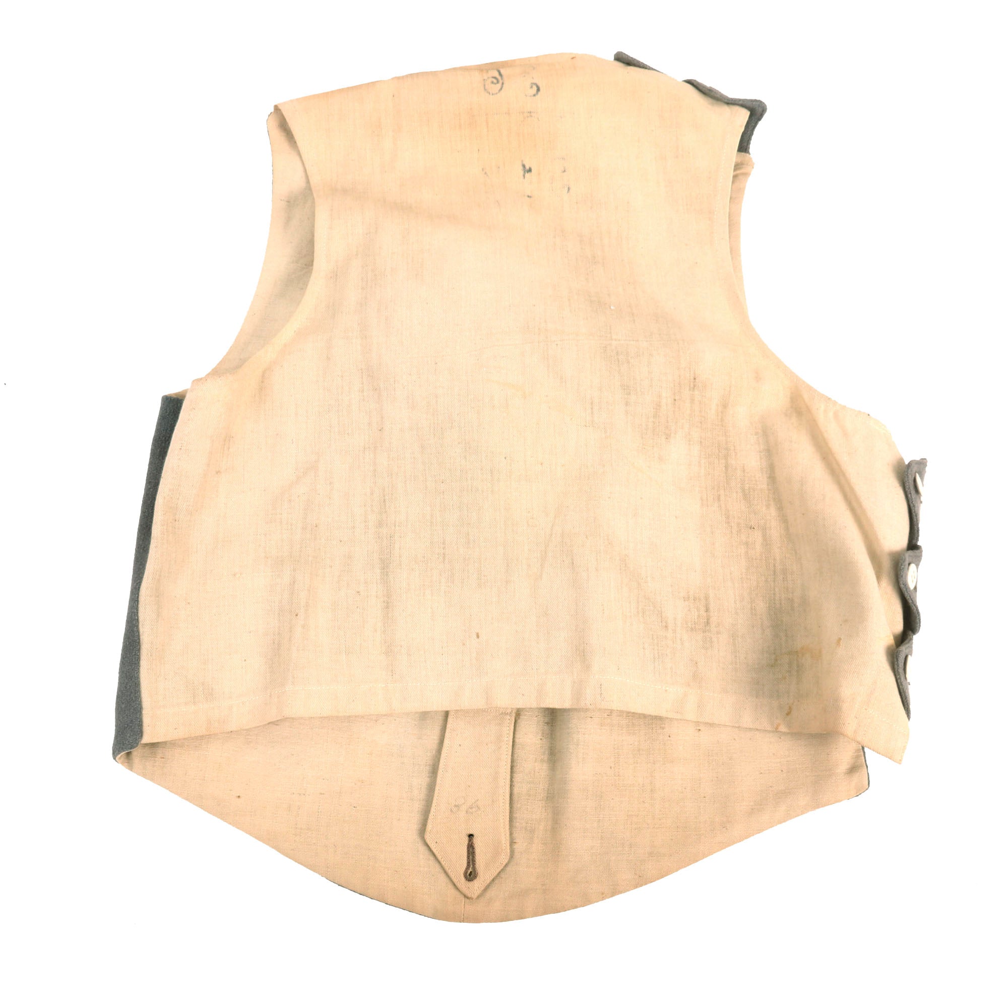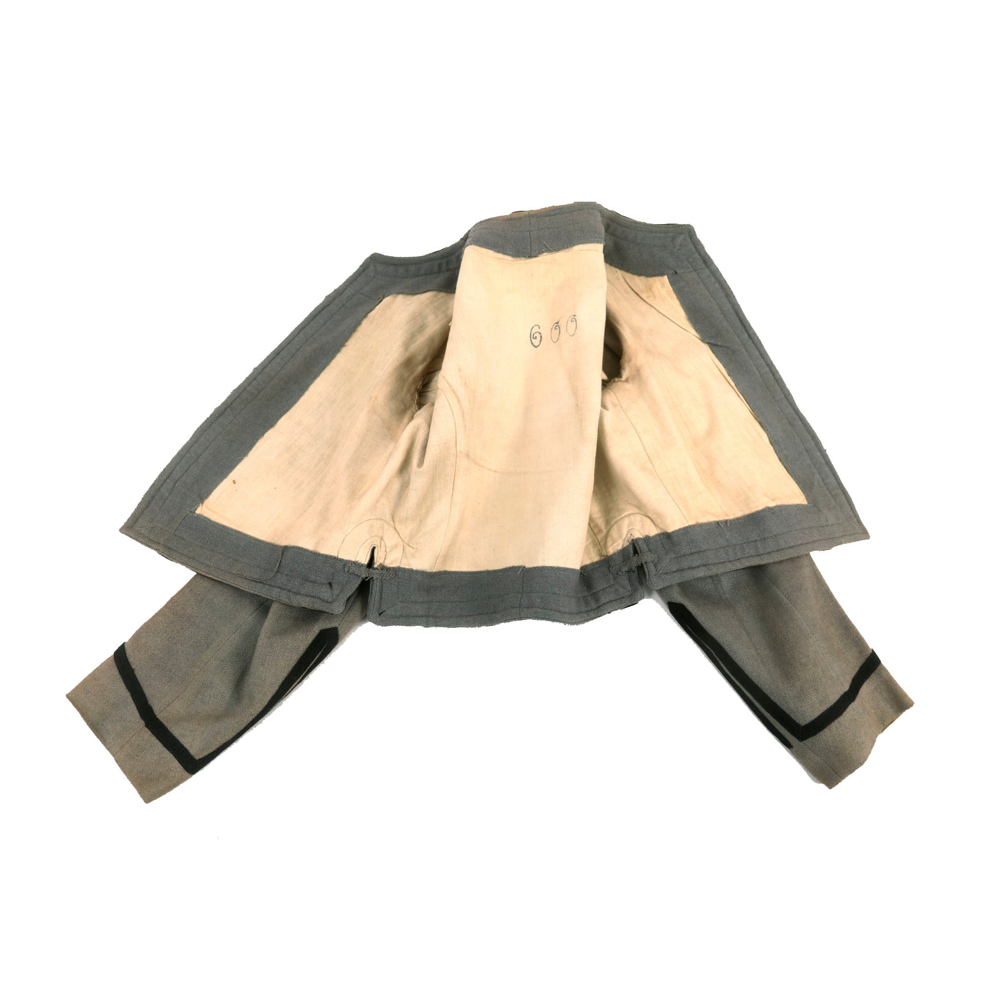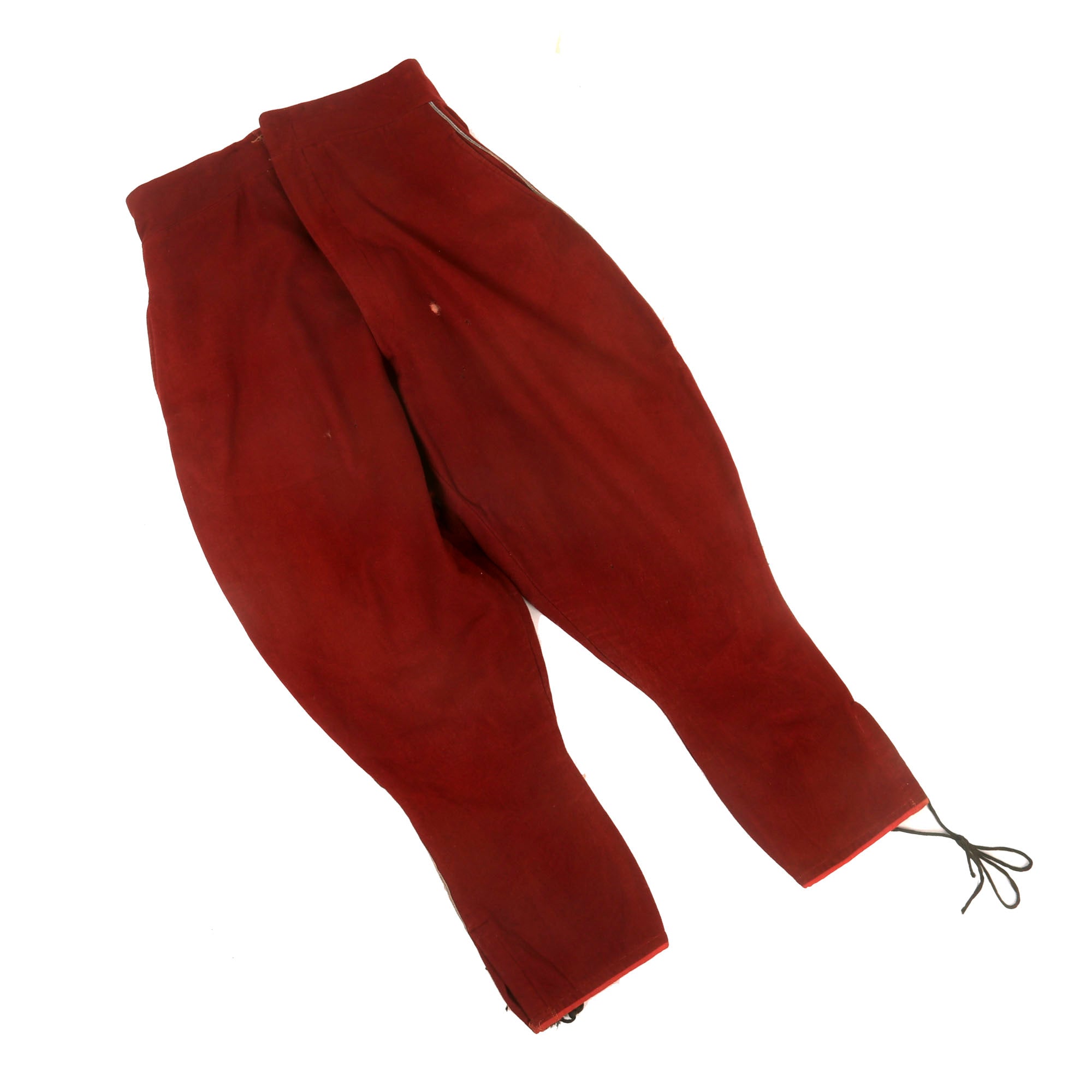 This uniform is in wonderful condition and even retains original regiment markings, though we are unfamiliar with this style of marking. The primary unit marking appears to be in the white backing of the vest, reading 36 / U.C.I. / 517, while the inside of the jacket is marked 38 / U.C.L. / 600. The front of the jacket appears to have color fading from age or use. The trousers are full red with what appears to be light blue piping, and the interior is in good shape. A lovely set. This is truly one of the best uniforms of this type we have encountered here!