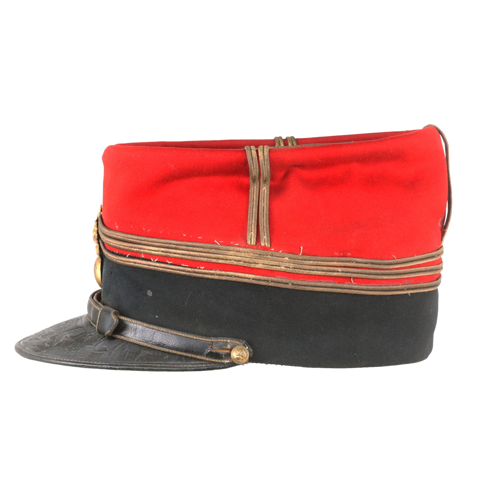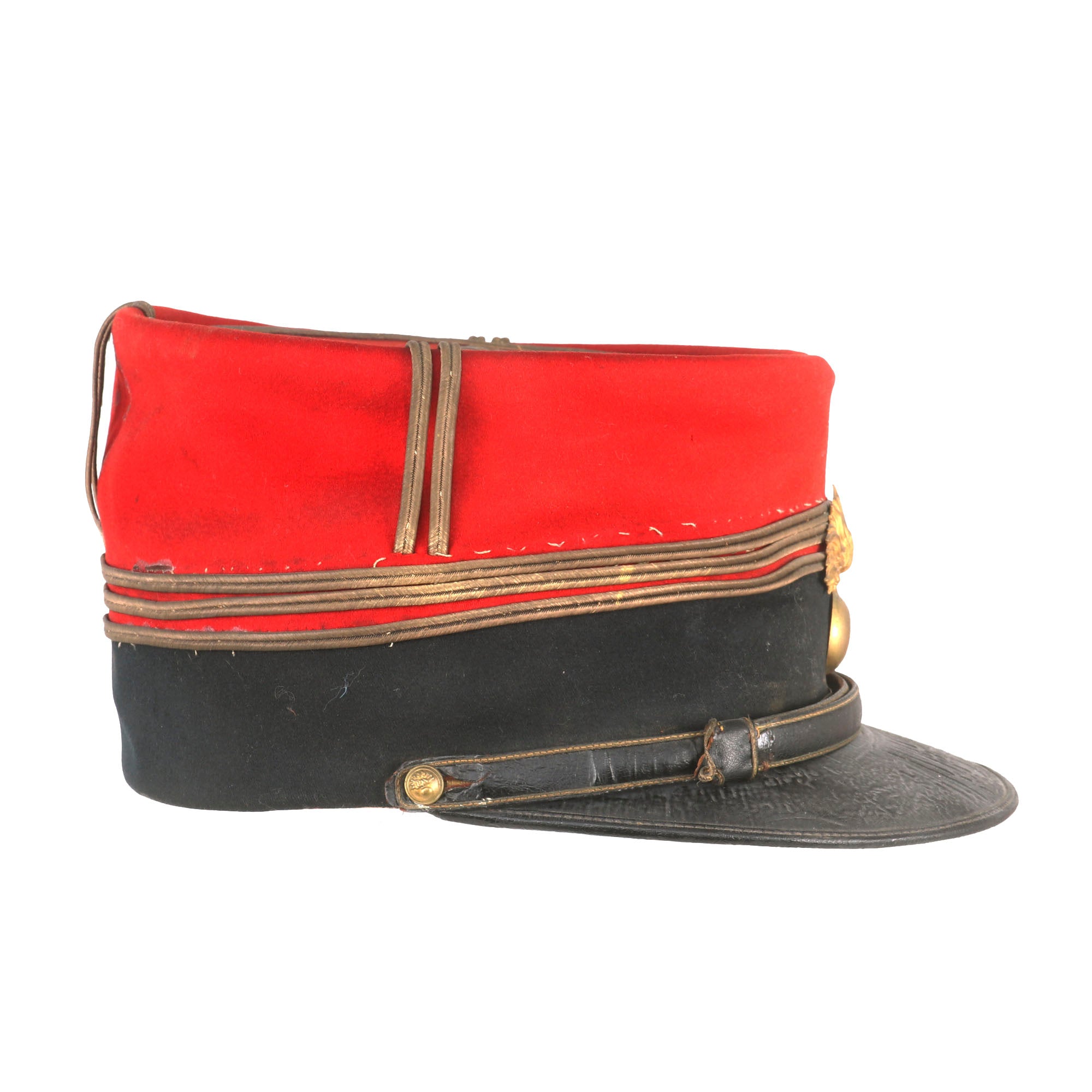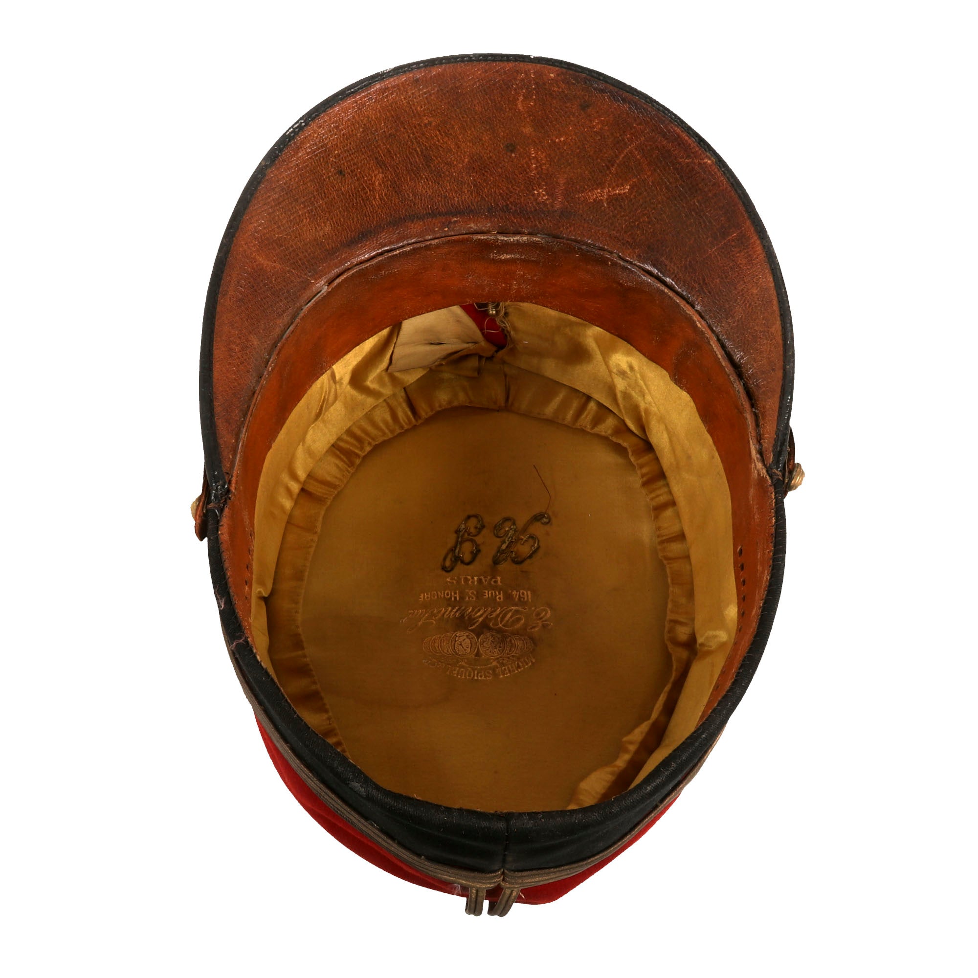 Original Item. One-of-a-Kind. This is a tremendous private-purchased French Model 1872 Infantry Captain Officer’s kepi, likely dating to the late 1870s or 1880s, hand-crafted by the prestigious maker Michel Spique & Cie. of Paris. This model of kepi had a small slot at the front of the crown for attachment of a Ball tuft. The three rows of braid around the body & the two vertical rows at the sides and back denote the rank of Captain.The kepi retains both its leather chinstrap and “false” chinstrap which sits against the body. The leather chinstrap has heavy wear with one piece already having come loose. Both chinstraps are held in place by the “Flaming Bomb” Infantry buttons. The top two of the three rows of braid have come undone from their stitching and the white stitch remnants can be seen. There are several places where the braid has come off of its stitching, and the previous owner attempted to reglue them. Someone has inserted a cylindrical cardboard frame to keep the shape of the kepi.The initials A.I. are monogrammed with small gilt letters under the maker’s mark. The maker’s marking reads:MICHEL SPIQUEL & CIE.E. DELORME IUA.164. RUE ST. HONOREPARISThe leather sweatband is very well-retained but may have been reglued to the visor. The gold-colored lining is intact thanks in part to the cardboard which gave the kepi shape. The kepi is roughly a size 7.This is a tremendously scarce French Model 1872 kepi, ready for further research and display.