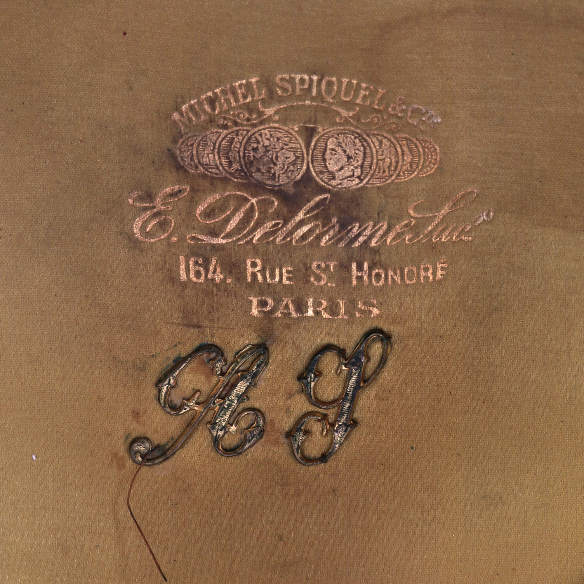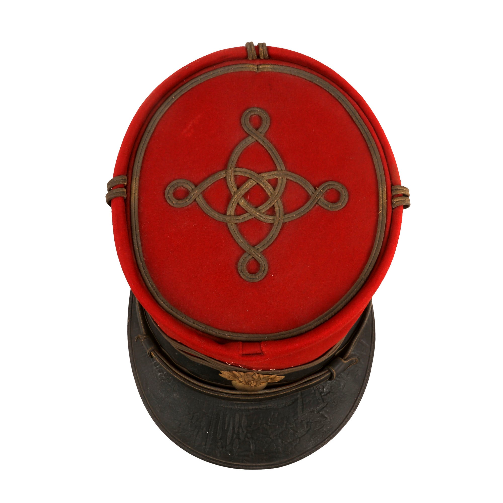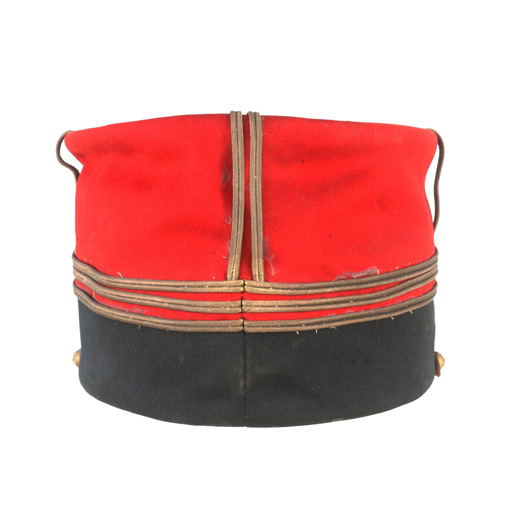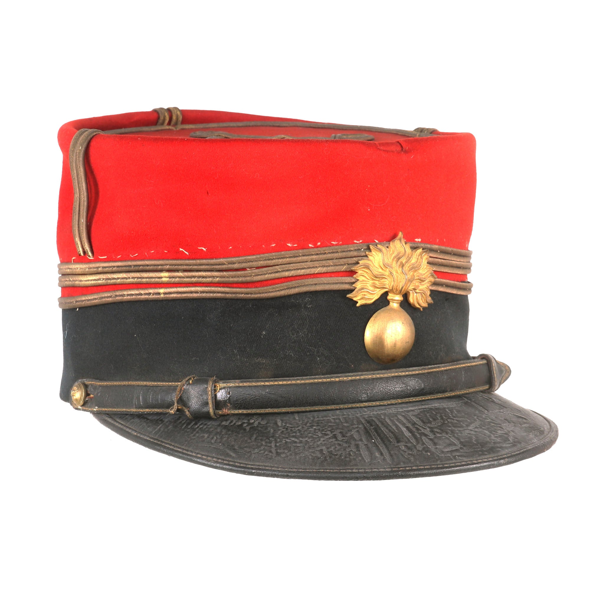 Original Item. One-of-a-Kind. This is a tremendous private-purchased French Model 1872 Infantry Captain Officer’s kepi, likely dating to the late 1870s or 1880s, hand-crafted by the prestigious maker Michel Spique & Cie. of Paris. This model of kepi had a small slot at the front of the crown for attachment of a Ball tuft. The three rows of braid around the body & the two vertical rows at the sides and back denote the rank of Captain.The kepi retains both its leather chinstrap and “false” chinstrap which sits against the body. The leather chinstrap has heavy wear with one piece already having come loose. Both chinstraps are held in place by the “Flaming Bomb” Infantry buttons. The top two of the three rows of braid have come undone from their stitching and the white stitch remnants can be seen. There are several places where the braid has come off of its stitching, and the previous owner attempted to reglue them. Someone has inserted a cylindrical cardboard frame to keep the shape of the kepi.The initials A.I. are monogrammed with small gilt letters under the maker’s mark. The maker’s marking reads:MICHEL SPIQUEL & CIE.E. DELORME IUA.164. RUE ST. HONOREPARISThe leather sweatband is very well-retained but may have been reglued to the visor. The gold-colored lining is intact thanks in part to the cardboard which gave the kepi shape. The kepi is roughly a size 7.This is a tremendously scarce French Model 1872 kepi, ready for further research and display.