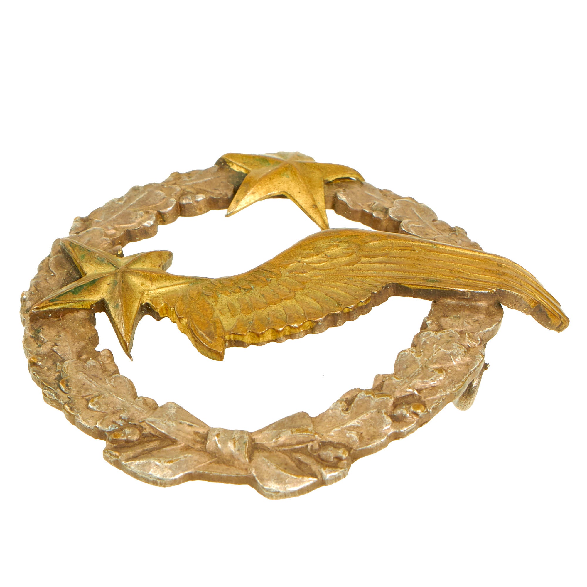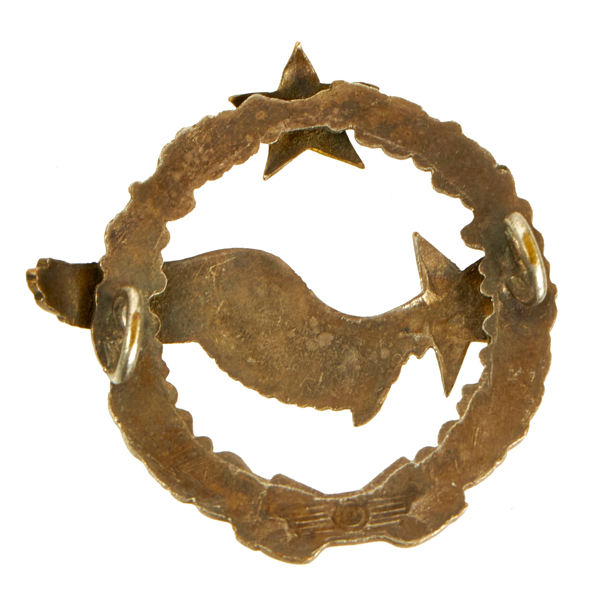 The badge itself features a German style Oak leaves laurel with a bow at the bottom center, the gilt Winged Star in the center and another gilt star applied at the top center. The badge is in wonderful condition, though it does show age, wear and tarnish. The “barbell” type fastening bar is unfortunately missing and the points of the top center star are bent inwards slightly, almost wrapping around the laurel.