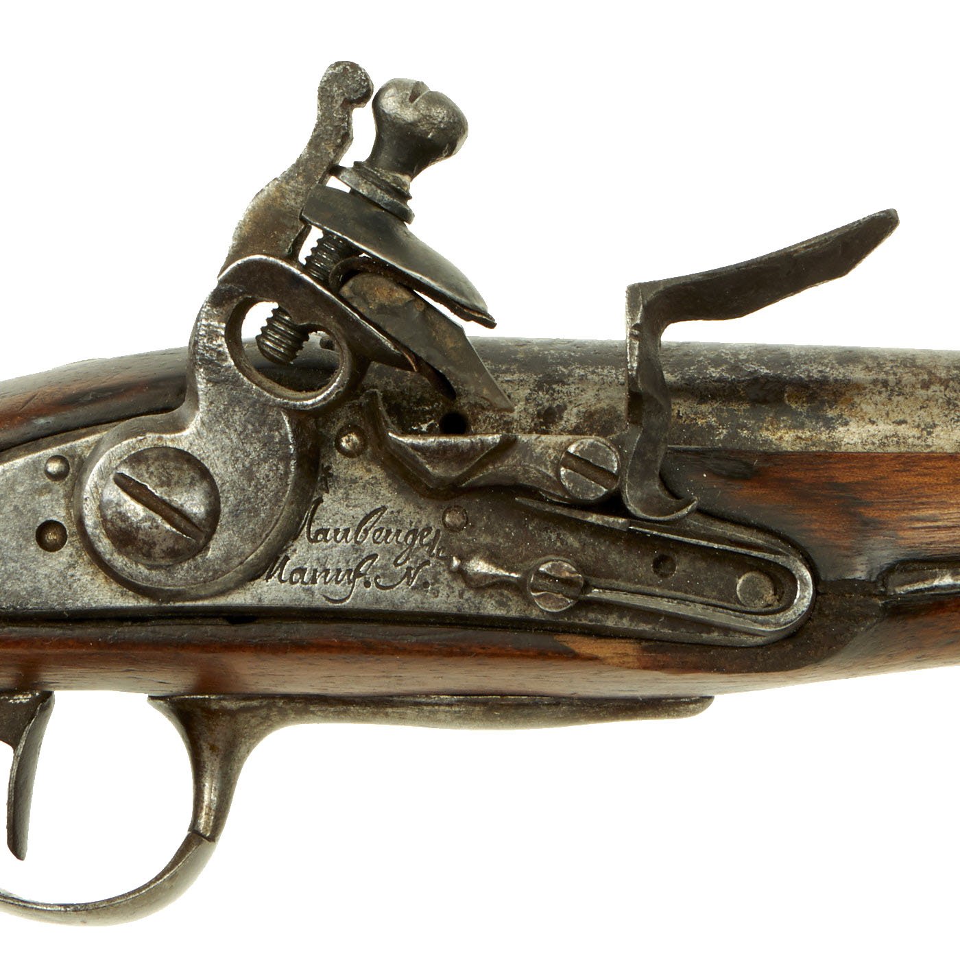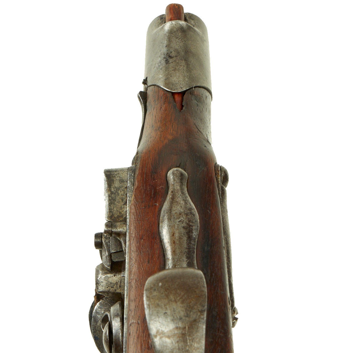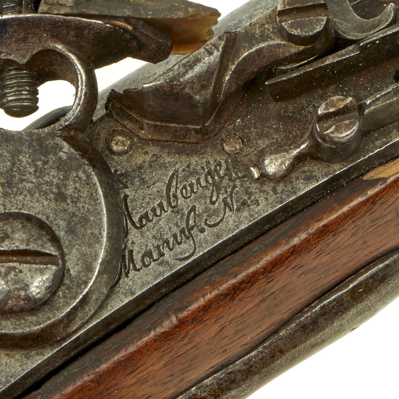 The pistol is equipped with a 5 inch barrel and has an overall length of just 10 inches, making it very easy to conceal and maneuver. The bore measures out to about .61 inches, probably for a 1/2 inch ball. It has a lovely walnut stock with all Iron mountings, even the flash pan. The lock plate is still clearly marked Maubeuge Manuf. N., for manufacture at the government arsenal located in Maubeuge, France, today along the Northern border with Belgium.
